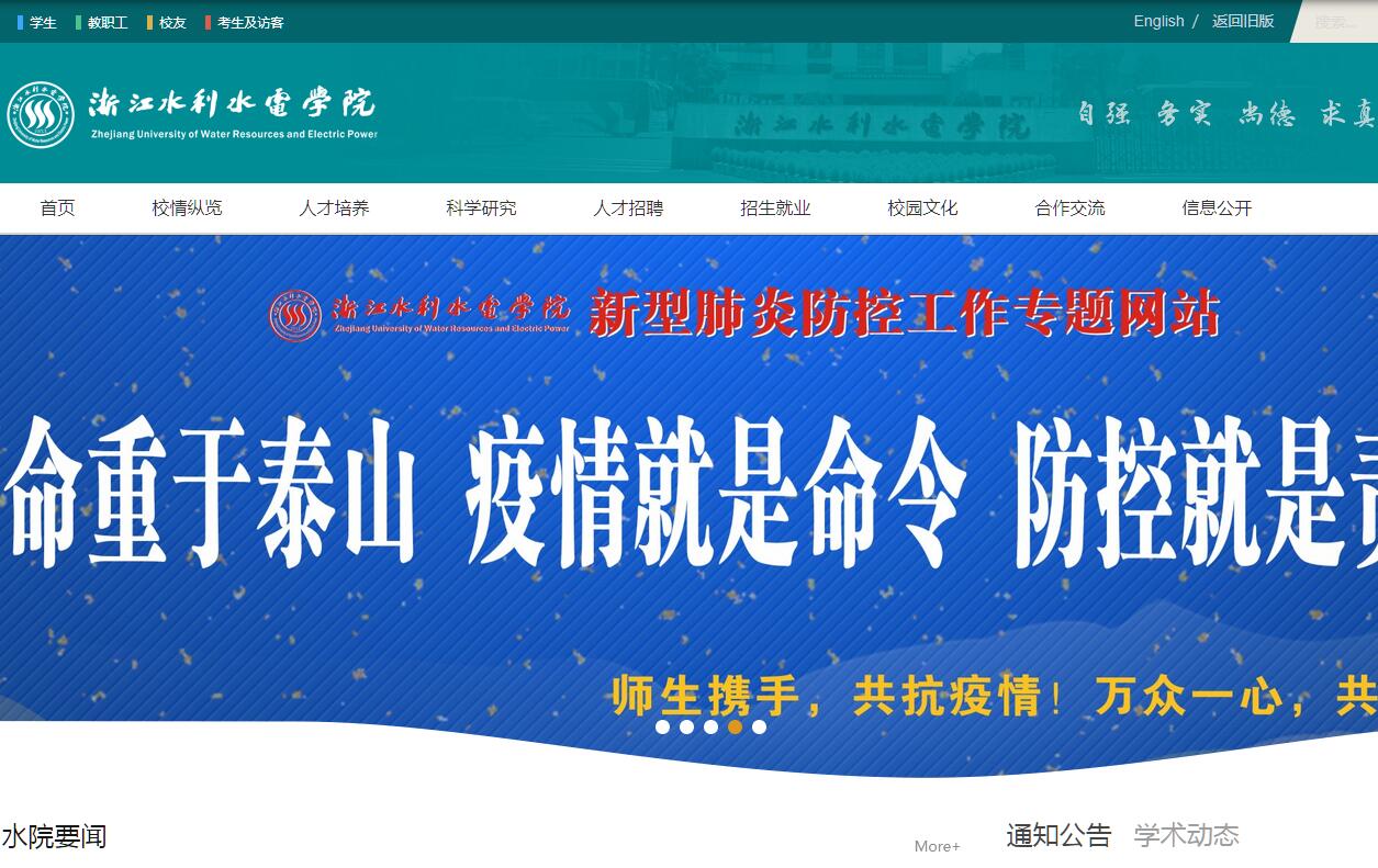 浙江水利水電學(xué)院是一所辦學(xué)歷史悠久的工科類普通高等學(xué)校,前身可追溯到1953年的杭州水力發(fā)電學(xué)校和1956年的杭州水利學(xué)校、1958年的浙江電力??茖W(xué)校、1975年的浙江水利電力學(xué)校(1978年9月更名為浙江水利水電學(xué)校)、1984年的浙江水利水電??茖W(xué)校,2013年升格更名為浙江水利水電學(xué)院。經(jīng)過(guò)60多年的不斷進(jìn)取,學(xué)院的各項(xiàng)事業(yè)得到了快速發(fā)展,在學(xué)科專業(yè)建設(shè)、師資隊(duì)伍建設(shè)、教育教學(xué)改革、科研科技服務(wù)、基礎(chǔ)設(shè)施建設(shè)等方面取得了顯著成績(jī),形成了以工學(xué)門類為主體,以水利水電為特色,土木、機(jī)械、電氣、管理等多學(xué)科協(xié)調(diào)發(fā)展的學(xué)科專業(yè)體系。2014年12月17日,水利部和浙江省人民政府簽訂共建協(xié)議,學(xué)校進(jìn)入省部共建高校行列。2015年2月,學(xué)校被授予“第四屆全國(guó)文明單位”榮譽(yù)稱號(hào)。學(xué)校位于歷史文化名城、風(fēng)景游覽勝地──浙江省杭州市,占地面積1231畝,在校普通本??圃谛I?100余人,其中本科生5000余人;現(xiàn)有專任教師510余人,其中高級(jí)職稱占專任教師總數(shù)的43.5%,研究生學(xué)歷占專任教師總數(shù)的75.4%,全國(guó)模范教師1人,全國(guó)水利職教名師6人,浙江省優(yōu)秀教師3人,省教學(xué)名師4人,省教壇新秀5 人,省“151人才工程”人選15人,形成了一支數(shù)量適當(dāng)、結(jié)構(gòu)合理、素質(zhì)良好,并具有較高教學(xué)水平和一定科研能力的師資隊(duì)伍。學(xué)?,F(xiàn)有教學(xué)儀器設(shè)備總值1.5億元;建有主干帶寬千兆的校園網(wǎng)系統(tǒng);擁有印本圖書81萬(wàn)余冊(cè),另有各種紙質(zhì)期刊1100余種,校圖書館已成為浙江省具有鮮明水利和數(shù)字化特色,水利水電文獻(xiàn)資源收藏最為豐富的圖書館之一。學(xué)校堅(jiān)持以教學(xué)為中心,現(xiàn)有10個(gè)教學(xué)院2個(gè)教學(xué)部,有水利工程等6個(gè)浙江省級(jí)B類一流學(xué)科,25個(gè)本科專業(yè)和9個(gè)專科招生專業(yè),其中1個(gè)省優(yōu)勢(shì)專業(yè),6個(gè)省特色專業(yè),初步形成了以工學(xué)門類為主體,以水利水電為特色,土木、機(jī)械、電氣、管理等多學(xué)科協(xié)調(diào)發(fā)展的學(xué)科專業(yè)體系。學(xué)校圍繞培養(yǎng)高素質(zhì)應(yīng)用型人才的目標(biāo),構(gòu)建了能力本位“一主線、三統(tǒng)一、多樣化”的人才培養(yǎng)模式平臺(tái),在此頂層設(shè)計(jì)下,形成了各具特色的專業(yè)人才培養(yǎng)模式,并創(chuàng)新試點(diǎn)SWH-CDIO工程教育模式,凸顯學(xué)生的軟技能培養(yǎng)。學(xué)校實(shí)習(xí)、實(shí)訓(xùn)條件優(yōu)越,現(xiàn)有校內(nèi)實(shí)驗(yàn)(實(shí)訓(xùn))室44個(gè),校外實(shí)習(xí)基地292個(gè)。其中,“計(jì)算機(jī)應(yīng)用技術(shù)實(shí)訓(xùn)基地”和“先進(jìn)制造實(shí)訓(xùn)基地”為中央財(cái)政資助的實(shí)訓(xùn)基地;“水利工程綜合技能實(shí)訓(xùn)基地”和“電力工程實(shí)訓(xùn)基地”等4個(gè)為省級(jí)示范性實(shí)踐教學(xué)基地;共同擁有華東地區(qū)最大的河口試驗(yàn)基地。學(xué)校發(fā)揮水利學(xué)科科研優(yōu)勢(shì),不斷深化與地方政府、行業(yè)企業(yè)的需求對(duì)接,主動(dòng)服務(wù)“五水共治”“大花園”建設(shè)等省委省政府工作部署。近年來(lái),學(xué)校承接“五水共治”相關(guān)科研項(xiàng)目350余項(xiàng),獲批國(guó)家級(jí)項(xiàng)目7項(xiàng),省部級(jí)項(xiàng)目85項(xiàng),獲水利部大禹水利科學(xué)技術(shù)獎(jiǎng)二等獎(jiǎng)1項(xiàng),浙江省水利科技創(chuàng)新獎(jiǎng)12項(xiàng),浙江省社科研究?jī)?yōu)秀成果獎(jiǎng)2項(xiàng)。公開發(fā)表SCI論文42篇,EI期刊論文20篇,國(guó)內(nèi)一級(jí)期刊論文31篇,北大核心期刊和CSSCI論文127篇?!墩憬妼W(xué)院學(xué)報(bào)》于2014年被國(guó)家新聞出版廣電總局認(rèn)定為第一批認(rèn)定學(xué)術(shù)期刊、入選《中國(guó)學(xué)術(shù)期刊綜合評(píng)價(jià)數(shù)據(jù)庫(kù)》的統(tǒng)計(jì)源期刊、RCCSE中國(guó)學(xué)術(shù)核心期刊、《中國(guó)學(xué)術(shù)期刊影響因子年報(bào)》統(tǒng)計(jì)源期刊。學(xué)校設(shè)有國(guó)家職業(yè)技能鑒定所,是水利行業(yè)定點(diǎn)培訓(xùn)機(jī)構(gòu)。2017年12月,學(xué)校成立了全國(guó)首家河(湖)長(zhǎng)學(xué)院——浙江河(湖)長(zhǎng)學(xué)院,將深入貫徹“綠水青山就是金山銀山”理念,充分發(fā)揮在理論研究、業(yè)務(wù)培訓(xùn)、經(jīng)驗(yàn)交流等方面平臺(tái)優(yōu)勢(shì),立足浙江、面向全國(guó),致力于建成服務(wù)全國(guó)治水工作的重要基地。學(xué)校注重學(xué)生實(shí)踐應(yīng)用能力的培養(yǎng),素質(zhì)教育碩果累累,學(xué)科競(jìng)賽成績(jī)喜人。學(xué)校鼓勵(lì)和支持學(xué)生積極參與課外學(xué)術(shù)科技和體育競(jìng)賽活動(dòng),近年來(lái)學(xué)生在參加的各種學(xué)科和體育競(jìng)賽中,獲得了大量國(guó)家和省級(jí)獎(jiǎng)勵(lì),在同類院校中皆名列前茅。學(xué)校是浙江省普通高校畢業(yè)生就業(yè)工作優(yōu)