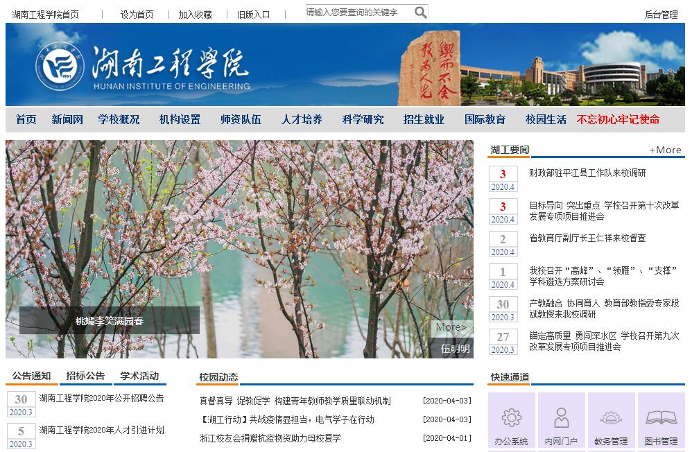 湖南工程學(xué)院坐落于一代偉人毛澤東的故鄉(xiāng)湖南省湘潭市。2000年6月,經(jīng)教育部批準(zhǔn),由湘潭機(jī)電高等??茖W(xué)校與湖南紡織高等專科學(xué)校合并組建而成,是一所省屬公辦普通本科院校。湘潭機(jī)電高等??茖W(xué)校創(chuàng)建于1951年,隸屬原國家機(jī)械工業(yè)部,是全國示范性高等工程??浦攸c(diǎn)建設(shè)學(xué)校;湖南紡織高等專科學(xué)校創(chuàng)建于1978年,隸屬原湖南省紡織工業(yè)廳。學(xué)校始終堅持應(yīng)用型人才培養(yǎng)的辦學(xué)定位。2007年,以優(yōu)異成績通過教育部本科教學(xué)工作水平評估。2010年,獲批為教育部首批“卓越工程師教育培養(yǎng)計劃”實(shí)施高校。2011年,經(jīng)國務(wù)院學(xué)位委員會批準(zhǔn),成為“服務(wù)國家特殊需求碩士專業(yè)學(xué)位研究生教育”項(xiàng)目試點(diǎn)高校。2013年,學(xué)校牽頭組建的“風(fēng)電裝備與電能變換協(xié)同創(chuàng)新中心”獲批湖南省高校首批“2011計劃”協(xié)同創(chuàng)新中心。2016年,機(jī)械設(shè)計制造及其自動化專業(yè)通過工程教育專業(yè)認(rèn)證;學(xué)校成為湖南省普通高等學(xué)校校地合作試點(diǎn)單位。2017年,學(xué)校被列為湖南省碩士學(xué)位授予立項(xiàng)建設(shè)單位。學(xué)?,F(xiàn)有主校區(qū)和南校區(qū)2個校區(qū),校園總面積108萬m2,建筑面積52.8萬m2。主校區(qū)位于湘江之濱,與沿江風(fēng)光帶、木魚湖公園、寶塔公園相互映襯。學(xué)校湖光山色、風(fēng)光旖旎,是省“園林式單位”和“文明高等學(xué)?!薄,F(xiàn)設(shè)有16個教學(xué)院(部、中心)、52個本科專業(yè),1個工程碩士專業(yè)學(xué)位點(diǎn)(包括動力工程、紡織工程兩個專業(yè)領(lǐng)域)。學(xué)校面向28個?。ㄖ陛犑?、自治區(qū))招生,目前全日制在校學(xué)生1.6萬余人。學(xué)?,F(xiàn)有教職工1131人,其中專任教師862人,高級職稱教師373人,具有博士、碩士學(xué)位教師699人,博士生、碩士生導(dǎo)師87人。全國模范(優(yōu)秀)教師3人,享受國務(wù)院、省政府特殊津貼專家4人,教育部新世紀(jì)優(yōu)秀人才2人,教育部專業(yè)教學(xué)指導(dǎo)委員會委員2人;省級教學(xué)名師3人,省級學(xué)科帶頭人14人,省部級優(yōu)秀教師9人,省“121人才工程”人選17人,省級青年骨干教師55人;省級教學(xué)團(tuán)隊(duì)3個,省高??萍紕?chuàng)新團(tuán)隊(duì)2個。學(xué)校緊密對接區(qū)域經(jīng)濟(jì)和機(jī)電、紡織行業(yè)發(fā)展需要,以培養(yǎng)高素質(zhì)應(yīng)用型人才為目標(biāo),形成了以工為主,工、管、文、理、經(jīng)、藝等多學(xué)科協(xié)調(diào)發(fā)展格局,擁有電氣、機(jī)械、紡織、化工、管理等優(yōu)勢專業(yè)群?,F(xiàn)有省級重點(diǎn)建設(shè)學(xué)科5個;省“2011”協(xié)同創(chuàng)新中心、省重點(diǎn)實(shí)驗(yàn)室等省級科研平臺9個,省高校產(chǎn)學(xué)研合作示范基地3個;教育部“卓越計劃”實(shí)施專業(yè)8個,國家級、省級特色專業(yè)8個,國家級、省級專業(yè)綜合改革試點(diǎn)專業(yè)5個;國家級實(shí)踐教育平臺4個,省級虛擬仿真實(shí)驗(yàn)中心、示范實(shí)驗(yàn)室(中心)8個,省級創(chuàng)新創(chuàng)業(yè)平臺8個,省級校企合作人才培養(yǎng)示范基地、優(yōu)秀實(shí)習(xí)基地14個,教育部產(chǎn)學(xué)合作協(xié)同育人項(xiàng)目11個,省級精品課程、省高校信息化應(yīng)用建設(shè)項(xiàng)目28項(xiàng);國家級大學(xué)生科技創(chuàng)新團(tuán)隊(duì)1個。金工實(shí)習(xí)基地是教育部確定的全國高校金工實(shí)習(xí)教學(xué)指導(dǎo)人員培訓(xùn)與考試中心。學(xué)校積極推進(jìn)科學(xué)研究及成果轉(zhuǎn)化。近年來,獲得國家級、省部級項(xiàng)目509項(xiàng),其中國家自科、社科基金項(xiàng)目和國家重大(重點(diǎn))科研項(xiàng)目子項(xiàng)目39項(xiàng);獲得各類專利412項(xiàng);發(fā)表高水平學(xué)術(shù)論文1112篇;獲得省市級科技成果獎14項(xiàng)。學(xué)校主動對接地方和產(chǎn)業(yè)需求,廣泛開展產(chǎn)學(xué)研深度合作,與230余家企業(yè)簽訂產(chǎn)學(xué)研合作協(xié)議,與企業(yè)簽訂重大項(xiàng)目98項(xiàng),與企業(yè)和科研院所簽訂橫向科研項(xiàng)目352項(xiàng),科研經(jīng)費(fèi)1.8億元,產(chǎn)生經(jīng)濟(jì)效益8.7億余元。學(xué)校堅持開放辦學(xué),積極開展對外交流與合作,是湖南省最早開辦中外合作辦學(xué)項(xiàng)目的高校之一。先后與美國、澳大利亞、英國、新西蘭等國家的20余所高校建立并保持合作與交流關(guān)系。目前開設(shè)了2個本科專業(yè)和2個??茖I(yè)的國際合作教育項(xiàng)目。學(xué)校始終踐行“實(shí)踐育人”理念,扎實(shí)實(shí)施“卓越計劃”,改革創(chuàng)新人才培養(yǎng)模式,大力推進(jìn)產(chǎn)教融合、校企合作、協(xié)同育人,形成了鮮明的工程應(yīng)用型人才培養(yǎng)特色。學(xué)校是“全國工程應(yīng)用型本科教育協(xié)作組”副組長單位、“全國高等學(xué)校教學(xué)研究會應(yīng)用型本科院校專門委員會”副主任委員單位、“普通高等教育應(yīng)用型人才培養(yǎng)規(guī)劃教材編審委員會”主任委員單位、“全國地方高校卓越工程教育校企聯(lián)盟