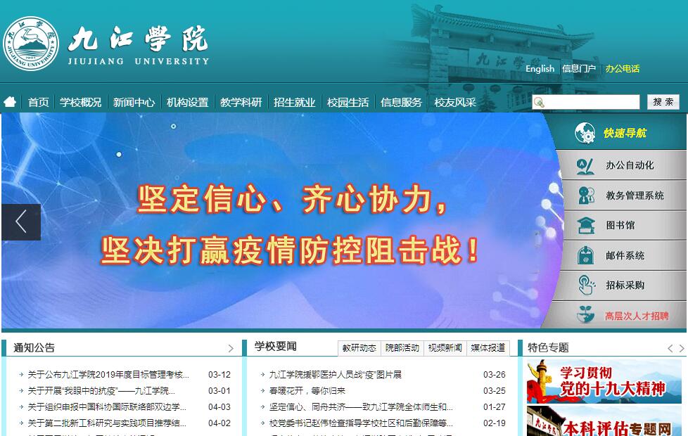 九江學(xué)院是經(jīng)國家教育部批準(zhǔn)設(shè)立的國有公辦全日制本科普通高等院校,辦學(xué)歷史可上溯至1901年由美國基督教衛(wèi)理公會創(chuàng)辦的但福德學(xué)校,現(xiàn)辦學(xué)體制為“軍地共建、省市共建”。學(xué)校坐落在長江中下游歷史文化名城——江西省九江市,位于廬山之麓、長江之濱、鄱陽湖之畔。校園生態(tài)環(huán)境優(yōu)良,景觀美麗如詩。名城、名山、名江、名湖,造就了九江學(xué)院的靈氣,尤其是具有千年歷史、享有“天下書院之首”美譽的白鹿洞書院,更為九江學(xué)院賦予深厚的文化氣息和辦學(xué)氛圍。學(xué)校占地2850多畝,現(xiàn)有主校區(qū)、潯東校區(qū)、廬峰校區(qū)、南湖校區(qū)、八里湖校區(qū)五個校區(qū),校舍面積130余萬平方米。下設(shè)22個二級學(xué)院,1所“三級甲等”附屬醫(yī)院。設(shè)有93個本科專業(yè),涵蓋了經(jīng)濟學(xué)、法學(xué)、教育學(xué)、文學(xué)、歷史學(xué)、理學(xué)、工學(xué)、農(nóng)學(xué)、醫(yī)學(xué)、管理學(xué)、藝術(shù)學(xué)等十一大學(xué)科門類?,F(xiàn)有國際貿(mào)易、凝聚態(tài)物理、植物學(xué)、材料加工工程、旅游管理、化學(xué)工程與工藝、人體解剖學(xué)與組織胚胎學(xué)、中國古代文學(xué)、思想政治教育、會計學(xué)等省級重點學(xué)科,國際經(jīng)濟與貿(mào)易、生物科學(xué)等國家級特色專業(yè)。面向全國30個省(市、自治區(qū))招生,全日制在校生3.4萬余人。學(xué)校始終堅持以立德樹人為根本,以人才培養(yǎng)為中心,堅持服務(wù)國家和區(qū)域經(jīng)濟社會發(fā)展需求,立足贛北,面向江西,輻射全國,放眼世界,為長江經(jīng)濟帶、長江中游城市群、國家生態(tài)文明示范區(qū)建設(shè)提供人才支撐和智力支持,培養(yǎng)綜合素質(zhì)好、專業(yè)基礎(chǔ)實、實踐能力強,具有創(chuàng)新創(chuàng)業(yè)精神的高級應(yīng)用型人才。學(xué)?,F(xiàn)有教職工2600余人,專任教師1900余人(副高以上職稱的808人,博士330人;研究生導(dǎo)師70余人),其中:入選江西省“贛鄱英才555工程”4人;獲得國務(wù)院特殊津貼和省政府特殊津貼12人;江西省高校學(xué)科帶頭人和青年骨干教師40人;江西省高校教學(xué)名師6人;入選省“百千萬人才工程”17人。近年來,學(xué)校聘請了近200位知名專家學(xué)者為學(xué)校兼職和客座教授。中國科學(xué)院院士楊叔子教授受聘為學(xué)校名譽校長,中國科學(xué)院院士潘際鑾教授受聘為學(xué)校學(xué)術(shù)委員會主任;中國工程院院士袁隆平、程天民和中國科學(xué)院院士嚴(yán)陸光等專家學(xué)者受聘為學(xué)校名譽教授。學(xué)?;A(chǔ)設(shè)施齊全,教學(xué)樓、實驗樓、圖書館、信息技術(shù)樓、田徑運動場和室內(nèi)體育館、學(xué)生活動中心等分布于各個校區(qū),計算機網(wǎng)絡(luò)覆蓋全校,實現(xiàn)了教學(xué)科研、圖書文獻(xiàn)檢索和辦公管理的網(wǎng)絡(luò)化和校園一卡通。圖書館設(shè)有1個主館和4個分館,共藏紙質(zhì)圖書317萬余冊、電子圖書200余萬種;建有各類實驗教學(xué)中心/綜合實驗室22個,其中,5個省級實驗教學(xué)示范中心、49個中央與地方共建基礎(chǔ)實驗室、中央與地方特色優(yōu)勢學(xué)科實驗室及中央財政支持地方高校改革發(fā)展專項資金項目。建有廬山實習(xí)培訓(xùn)中心等校內(nèi)外實習(xí)基地285個;現(xiàn)有教學(xué)科研儀器設(shè)備總值2.49億元。學(xué)校持續(xù)深化教育教學(xué)改革,大力推進本科教學(xué)“質(zhì)量工程”建設(shè),現(xiàn)有人才培養(yǎng)模式創(chuàng)新實驗區(qū)、教學(xué)創(chuàng)新團隊、實驗教學(xué)示范中心、雙語教學(xué)示范課程等35個國家級、省級“質(zhì)量工程”項目,223個國家級、省級“本科教學(xué)工程”項目。“十二五”以來,共獲得省級教學(xué)成果一等獎5項、二等獎12項。全面推進素質(zhì)教育和全員育人,積極探索創(chuàng)新應(yīng)用型人才培養(yǎng)模式,深入開展以創(chuàng)新創(chuàng)業(yè)、好習(xí)慣、國學(xué)素養(yǎng)等為主要內(nèi)容的“特色教育”。建立了“五三二一”創(chuàng)新創(chuàng)業(yè)人才培養(yǎng)體系,形成了抱團創(chuàng)業(yè)、集群創(chuàng)業(yè)、無縫創(chuàng)業(yè)、多樣創(chuàng)業(yè)、新式創(chuàng)業(yè)等特色,得到了江西省委省政府領(lǐng)導(dǎo)的充分肯定,并榮獲“中國高校創(chuàng)業(yè)教育示范單位”稱號。注重發(fā)揮校園文化育人功能,精心打造“濂溪講壇”文化品牌,先后邀請國內(nèi)外100余名知名專家學(xué)者作客講壇,并獲評“江西省高校校園文化建設(shè)優(yōu)秀成果一等獎”。深入開展國學(xué)經(jīng)典誦讀、科技文化節(jié)等校園文化精品活動,著力打造“暑期三下鄉(xiāng)”社會實踐活動品牌,全面提升學(xué)生綜合素質(zhì)。近年來,在全國“互聯(lián)網(wǎng)+”大學(xué)生創(chuàng)新創(chuàng)業(yè)大賽、“挑戰(zhàn)杯”全國大學(xué)生課外學(xué)術(shù)科技作品競賽、全國大學(xué)生數(shù)學(xué)建模競賽等各類賽事中均取得了優(yōu)異成績。人才培養(yǎng)質(zhì)量穩(wěn)步提升,新生報到率連續(xù)多年位于江西省同類院校前列;畢業(yè)生總體初次就業(yè)率