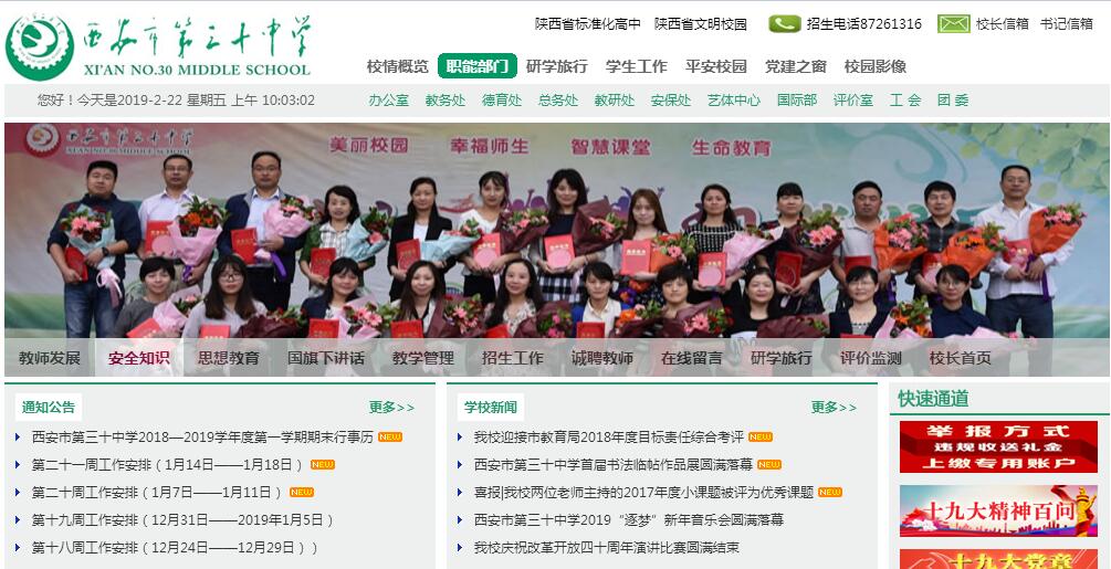 在這座古老而文明,有著悠久歷史和文化底蘊(yùn)的古城西安,坐落著這樣一所學(xué)?!靼彩械谌袑W(xué)。她地處龍脈之地,鐘樓腳下,交通便捷,位于省市政府間之要道,環(huán)境優(yōu)雅、教學(xué)設(shè)施齊全,是莘莘學(xué)子放飛夢(mèng)想的好去處;更是學(xué)子們修身治學(xué)的讀書(shū)勝地。這里曾培養(yǎng)了國(guó)際著名導(dǎo)演張藝謀、著名作曲家趙季平、文職將軍左青,著名歌唱家任慧等一大批在國(guó)內(nèi)外享有盛譽(yù)的藝術(shù)家。在半個(gè)多世紀(jì)的辦學(xué)歷程中,她為國(guó)家培養(yǎng)了一批又一批優(yōu)秀人才。她是西安教育的窗口,三十中始終沒(méi)有忘記社會(huì)賦予她的這一神圣使命——發(fā)現(xiàn)人才,培養(yǎng)人才,尊重人才。西安市第三十中學(xué),創(chuàng)建于1941年,歷經(jīng)73年的風(fēng)雨磨礪,三秦大地、巍巍鐘樓見(jiàn)證了三十中的歲月變遷和長(zhǎng)足發(fā)展。近幾年,學(xué)校在特色教育方面取得了輝煌的成就,升學(xué)率逐年提高。學(xué)校發(fā)展的思路:一是進(jìn)一步提高學(xué)校核心競(jìng)爭(zhēng)力,走特色教育之路;二是不斷加強(qiáng)學(xué)校制度建設(shè)、隊(duì)伍建設(shè)、文化建設(shè),使學(xué)校時(shí)刻煥發(fā)著生機(jī)和活力;三是要有一種主人翁精神,以人為本,讓老師能夠真心把學(xué)校當(dāng)成自己的家,把學(xué)生當(dāng)成自己的孩子,使老師有種幸福感和歸屬感;四是為每個(gè)學(xué)生提供一個(gè)發(fā)展的空間和施展個(gè)人才華的舞臺(tái),使學(xué)生真正感受到學(xué)習(xí)的快樂(lè)和樂(lè)趣。這樣的定位為三十中以后的發(fā)展打下了堅(jiān)實(shí)的基礎(chǔ),指明了前進(jìn)的方向,將使學(xué)校在創(chuàng)辦一流特色學(xué)校的路上走的更穩(wěn)、更快、更好。三十中在這幾年的發(fā)展歷程中,不斷探索教育規(guī)律、更新教育觀念、明確學(xué)校改革和發(fā)展的總體思路,成功提煉出“崇德、明志、積學(xué)、躬行”八字校訓(xùn);進(jìn)一步明確了“立德樹(shù)人,和諧發(fā)展”的辦學(xué)理念。校長(zhǎng)閻春喜認(rèn)為,一個(gè)人要成才先成人,合格首先是做人的合格。因此學(xué)校必須全面貫徹黨的教育方針,全面推進(jìn)素質(zhì)教育,在學(xué)問(wèn)合格與做人合格的關(guān)系上首先重視做人的合格。30中理應(yīng)把全體學(xué)生培養(yǎng)成為愛(ài)國(guó)的具有社會(huì)公德、文明行為習(xí)慣的遵紀(jì)守法的好公民,教會(huì)學(xué)生起碼的做人準(zhǔn)則,做一名合格的中學(xué)生,而三十中目前就是這樣一步一步做的。每當(dāng)中午放學(xué),當(dāng)北大街十字紅燈亮起來(lái)時(shí),三十中的學(xué)生整齊地停在禁行線外,能夠嚴(yán)格遵守交通管理規(guī)定;公交車(chē)上給老弱病殘?jiān)凶屪鶗r(shí)也能看到三十中學(xué)生的身影,他們時(shí)刻為別人著想;到學(xué)校來(lái)訪的客人也能聽(tīng)到三十中學(xué)生一聲親切的問(wèn)候,他們以一種主人翁的精神笑迎八方來(lái)客。這就是三十中的學(xué)生,他們尊重別人,懂得做人,知道怎樣去做人。一所學(xué)校要取得長(zhǎng)足的發(fā)展,就要有自己的長(zhǎng)處,要有自己的特色。三十中作為省級(jí)藝術(shù)教育特色學(xué)校,始終堅(jiān)持這樣的優(yōu)勢(shì),走自己藝術(shù)教育特色之路。多年來(lái),學(xué)校歌舞藝術(shù)團(tuán)多次代表省、市參加全國(guó)調(diào)演,屢獲國(guó)家、省、市金銀獎(jiǎng),向北影、北廣、西安交大、西工大、陜師大、廈門(mén)大學(xué)、西安音樂(lè)學(xué)院等高校以及各級(jí)各類(lèi)藝術(shù)團(tuán)體輸送了一批又一批藝術(shù)特長(zhǎng)生。三十中堅(jiān)持“重點(diǎn)+特色、合格+特長(zhǎng)”的辦學(xué)思路,積極適應(yīng)社會(huì)需求,著力提升學(xué)校綜合實(shí)力,努力彰顯辦學(xué)特色和優(yōu)勢(shì),取得引人矚目的成績(jī)。學(xué)校先后獲得陜西省文明校園、陜西省標(biāo)準(zhǔn)化高中、陜西省藝術(shù)教育示范學(xué)校、陜西省依法治校示范校、西安市建設(shè)學(xué)習(xí)型企(事)業(yè)活動(dòng)先進(jìn)集體、陜西省模范職工之家、西安市思想政治工作先進(jìn)集體等多項(xiàng)榮譽(yù),得到上級(jí)主管部門(mén)和社會(huì)各界的高度贊譽(yù)。“社會(huì)對(duì)基礎(chǔ)教育的需求,根本在于能夠?yàn)椴煌l(fā)展?jié)撡|(zhì)的孩子提供適合其發(fā)展的教育。適合的教育,才是好的教育。三十中不斷堅(jiān)持藝術(shù)教育傳統(tǒng),推進(jìn)學(xué)科結(jié)構(gòu)調(diào)整,為學(xué)生特長(zhǎng)發(fā)展創(chuàng)造機(jī)會(huì),搭建平臺(tái),營(yíng)造氛圍,在特色中追求教育教學(xué)質(zhì)量,在發(fā)展中實(shí)現(xiàn)辦學(xué)目標(biāo)?!比行乱蝗晤I(lǐng)導(dǎo)上任伊始,就把創(chuàng)建一流特色學(xué)校,提高學(xué)校核心競(jìng)爭(zhēng)力作為辦學(xué)目標(biāo),經(jīng)過(guò)不斷探索和實(shí)踐,形成了“知禮、和諧、求是、進(jìn)取”的校風(fēng), “敬業(yè)、愛(ài)生、博學(xué)、善導(dǎo)”的教風(fēng)和“守紀(jì)、尊師、勤奮、善思”的學(xué)風(fēng)。這使學(xué)校領(lǐng)導(dǎo)班子充分認(rèn)識(shí)到,只有將全體師生關(gu