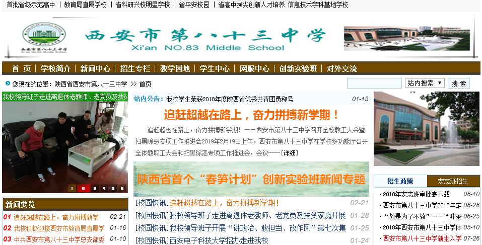 西安市第八十三中學(xué)的文化歷史可以追溯至1896年在上海建立的南洋公學(xué)中院。中院是南洋公學(xué)的附屬學(xué)校。1908年,南洋公學(xué)更名為交通大學(xué)。交通大學(xué)1956年從上海遷至西安。1957年,交通大學(xué)在市政府的支持下籌建了附屬中學(xué),這就是西安市第八十三中學(xué)的前身。1973年起,八十三中歸屬市教育局直接管理。1982年,被確定為陜西省首批辦好的十所重點(diǎn)中學(xué)之一。2009年,被評為陜西省首批普通高中示范學(xué)校。八十三中位于城東咸寧中路,毗鄰興慶公園和西安交通大學(xué)。占地28855平方米,建筑面積30118平方米。有教學(xué)樓、圖書科技樓、實(shí)驗(yàn)樓、體藝館、學(xué)生公寓、地下餐廳、塑膠運(yùn)動場、文化廣場、天象館等主要教育教學(xué)及活動設(shè)施。學(xué)?,F(xiàn)有編制教師 126人。其中,任課教師112人,高、中級職稱教師占84.9 %,其中高級職稱教師占42.1%。全國模范教師、全國優(yōu)秀教師及特級教師5 人,有一批在省、市有影響的知名教師和學(xué)科帶頭人。學(xué)校在校學(xué)生1600多名,32個(gè)教學(xué)班。每個(gè)年級設(shè)有經(jīng)中央和省文明辦批準(zhǔn)的“宏志班”。每年級招收5名西藏插班生。學(xué)校建有陜西省中學(xué)生圍棋和排球兩個(gè)訓(xùn)練中心,并按規(guī)定招收一定數(shù)量的特長學(xué)生。