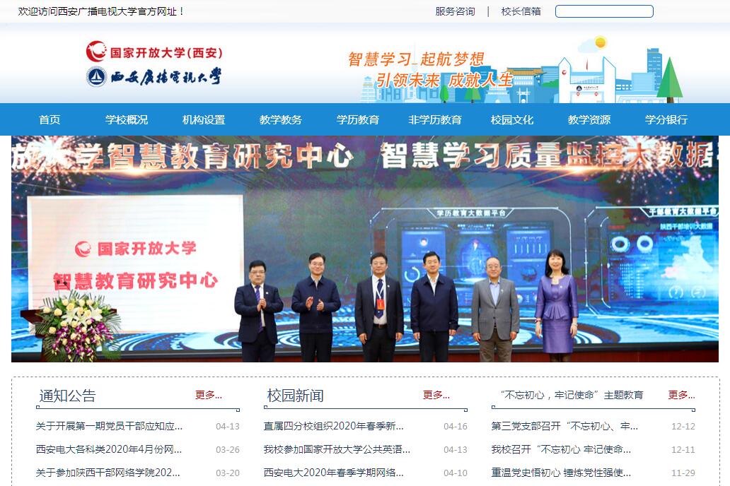 西安廣播電視大學(國家開放大學西安分部)創(chuàng)建于1979年10月26日,由西安市人民政府主辦,承擔多規(guī)格、多層次的學歷教育和非學歷教育,是西安市唯一一所以繼續(xù)教育為主體的高等院校。建校以來,為社會輸送了大批留得住、用得上、靠得住的實用性高等專門人才和崗位骨干,累計培養(yǎng)學歷教育人才14多萬人,非學歷培訓達30多萬人次。學校堅持信息技術與教育教學深度融合的開放辦學核心理念,大力推進信息技術與教育教學融合創(chuàng)新。以應用為導向,著力構建智慧教育人才培養(yǎng)體系,服務大西安智慧城市建設。學校強化智慧教學與管理,積極推進智慧學習系統(tǒng)建設,建設了以大數(shù)據(jù)為支撐的信息化學習平臺,推行以云計算為基礎的教育服務,建立覆蓋西安城鄉(xiāng)的立體辦學網(wǎng)絡,面向全體社會成員提供優(yōu)質公共教育服務,形成了“人人皆學、處處能學、時時可學”的遠程開放教育新模式。學校堅持錯位發(fā)展,辦學特色不斷彰顯,率先探索創(chuàng)建了省、市干部教育網(wǎng)絡培訓模式。學校堅持走密切服務西安市經(jīng)濟社會發(fā)展之路,初步形成具有西安特色的社區(qū)教育發(fā)展模式,積極服務全民終身學習體系構建。學校堅持積極探索國際化辦學之路,響應國家“一帶一路”倡議,2018年11月24日,國家開放大學華僑學院西安分院正式揭牌,以西安漢唐文化網(wǎng)絡學院為平臺,利用智慧教育先進技術、高等教育優(yōu)質資源、遠程教育豐富經(jīng)驗,不斷探索創(chuàng)新教學模式,服務遍布全球的中華文化愛好者。西安廣播電視大學(國家開放大學西安分部)將以習近平新時代中國特色社會主義思想為指導,繼續(xù)實施“加強內涵建設、突出辦學特色、服務西安發(fā)展”的發(fā)展戰(zhàn)略,踐行“為了一切學習者,一切為了學習者”的辦學宗旨,務實篤行,銳意進取,努力建設國內一流、國際有影響的現(xiàn)代開放大學,為大西安國家中心城市建設和構建學習型社會不斷貢獻新的力量。