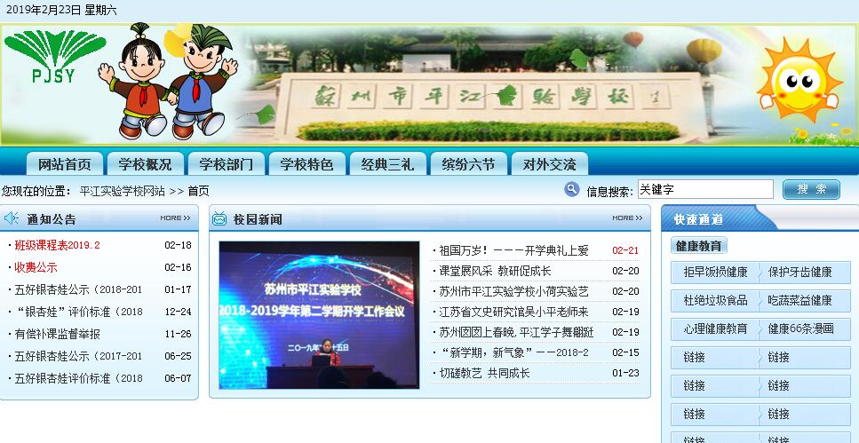 蘇州市平江實(shí)驗(yàn)學(xué)校坐落在蘇州古城東隅,南臨干將路,西依平江路,北靠全晉會(huì)館,東傍相門古城墻,是蘇州古代三大學(xué)宮之長(zhǎng)洲縣學(xué)所在地。學(xué)校歷史可追溯到南宋咸淳元年(1265年),長(zhǎng)洲縣學(xué)始建于舊學(xué)前。明代嘉靖二十年(1541年),遷至新學(xué)前今址,其規(guī)模僅次于蘇州府學(xué)。至清雍正年間,增置元和縣,縣學(xué)更名為長(zhǎng)洲元和縣學(xué)。1905年清政府取消科舉,興辦新學(xué),江蘇巡撫陸元鼎請(qǐng)地方名士章鈺主持,將縣學(xué)西半部改辦為“官立初等小學(xué)堂第五?!薄?906年,將縣學(xué)東半部改辦為“官立初等小學(xué)堂第十三?!?。1951年,更名為“平江中心小學(xué)”。1998年, “平江實(shí)驗(yàn)小學(xué)”與東側(cè)“蘇州市第十一中學(xué)”破墻合并,建立當(dāng)時(shí)蘇州第一所公辦九年一貫制實(shí)驗(yàn)學(xué)校,定名為“蘇州市平江實(shí)驗(yàn)學(xué)校”。2014年,中學(xué)部分離,小學(xué)部獨(dú)立。