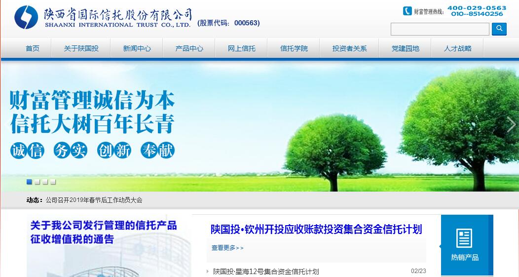 陜西省國際信托股份有限公司(簡稱陜國投,證券代碼:000563)前身為陜西省金融聯(lián)合投資公司(簡稱陜金聯(lián)),1984年陜金聯(lián)的設(shè)立,標(biāo)志著陜西現(xiàn)代信托業(yè)的誕生。1994年1月10日,陜國投在深圳證券交易所上市,標(biāo)志著中國非銀行金融上市機構(gòu)的誕生。陜國投是中西部地區(qū)唯一的上市信托公司、陜西首家上市的省屬金融機構(gòu)。公司總股本39.64億股,公司凈資產(chǎn)已逾百億元。2017年實現(xiàn)營業(yè)收入11.51億元,實現(xiàn)利潤總額4.63億元。陜國投成立34年上市24年來,積極發(fā)揮信托投融資功能,為大批企業(yè)和項目提供了大量信托貸款、信托投資、融資租賃、信用擔(dān)保、財務(wù)顧問、風(fēng)險投資等優(yōu)質(zhì)金融服務(wù),同時推動公司自身得到快速發(fā)展,誠信鑄就了良好的"陜國投"品牌。近年來,陜國投連續(xù)多年被陜西省政府評為"優(yōu)秀金融機構(gòu)";連續(xù)被陜西省國資委考核評比為A級省屬企業(yè);連續(xù)8年被評為"中國最具區(qū)域影響力信托公司";被評為"西安市著名商標(biāo)""陜西省著名商標(biāo)""陜西省重合同守信譽企業(yè)""省級納稅等級A級納稅人";公司有多款信托產(chǎn)品被授予創(chuàng)新獎。