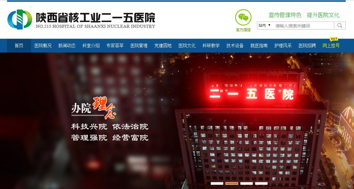 陜西省核工業(yè)二一五醫(yī)院始建于1974年,是咸陽市科室齊全、設備先進,融醫(yī)療、教學、科研、預防、康復為一體的三級綜合性醫(yī)院,是國家自然科學基金委員會依托單位、西安交通大學醫(yī)學院教學醫(yī)院,西安醫(yī)學院附屬醫(yī)院,西藏民族大學教學基地,上海交通大學瑞金醫(yī)院協(xié)作醫(yī)院、咸陽市公安法醫(yī)創(chuàng)傷醫(yī)院,咸陽市老年病醫(yī)院,陜西省醫(yī)保、新農(nóng)合定點單位,合療、醫(yī)保、人壽保險“直通車”單位,擁有職業(yè)病健康體檢資質和法醫(yī)司法鑒定資質,咸陽市新農(nóng)合大病保險直通車報銷定點醫(yī)院。醫(yī)院開放病床1550張,設臨床、醫(yī)技科室41個,門診診室54個,年門診量35萬人次、出院病人4萬余人次、手術量2萬余臺。在職職工1750人,其中衛(wèi)生技術人員1521名,擁有省突出貢獻專家、省“三五”人才、杰出人才、杰出青年和高級職稱專家、教授200余人。2014年1月投入使用的醫(yī)療綜合大樓,為廣大患者提供了環(huán)境優(yōu)美、流程合理、方便舒適的就醫(yī)環(huán)境。醫(yī)療綜合大樓分為AB兩區(qū)地上12層,地下2層,設置電梯28部,中央空調采暖。一層至四層為門急診、醫(yī)技科室、藥房等,四層為消毒供應中心,五層為手術室,六層至十二層主要為病區(qū)。按國際標準設計了全層流凈化手術室,醫(yī)學影像科、檢驗科、輸血科、消毒供應中心等醫(yī)技科室。設置??崎T診54個,門診收費實行“一卡通”就診流程,患者就診只需提供本人身份證,辦理“就診卡”,免去掛號、交費、劃價等步驟。秉承“生態(tài)環(huán)保,綠色節(jié)能”的理念,按綠色醫(yī)院標準建設,醫(yī)院設備先進、技術領先、環(huán)境舒適、服務優(yōu)質,醫(yī)院新醫(yī)療大樓內(nèi)部功能分區(qū)明確,設施齊全,在全市醫(yī)院中處于領先地位。醫(yī)院設有骨科五個病區(qū)(關節(jié)外科病區(qū)、創(chuàng)傷外科病區(qū)、脊柱外科病區(qū)、手足外科病區(qū)、燒傷整形科病區(qū)),普通外科(普通外科一病區(qū)(胃腸外科)、普通外科二病區(qū)(肝脾外科)、普通外科三病區(qū)(膽胰外科、臨床營養(yǎng)科)、普通外科四病區(qū)(肛腸介入)),神經(jīng)外科三個病區(qū)(神經(jīng)外科一病區(qū)、神經(jīng)外科二病區(qū)、神經(jīng)外科重癥監(jiān)護病區(qū)),胸心外科(病區(qū)),腫瘤科兩個病區(qū)(腫瘤科一病區(qū)、腫瘤科二病區(qū)),重癥醫(yī)學科(病區(qū)),沁尿外科(病區(qū)),男性科,婦科(病區(qū)),產(chǎn)科(病區(qū)),、耳鼻喉科(病區(qū)),眼科(病區(qū)),呼吸內(nèi)科(病區(qū)),內(nèi)分泌糖尿病科(病區(qū)),消化內(nèi)科(病區(qū)),血液內(nèi)科(病區(qū)),心血管內(nèi)科兩個病區(qū)(心血管內(nèi)科一病區(qū)、心血管內(nèi)科二病區(qū)),神經(jīng)內(nèi)科兩個病區(qū)(神經(jīng)內(nèi)科一病區(qū)、神經(jīng)內(nèi)科二病區(qū)),腎病內(nèi)科三個病區(qū)(腎病內(nèi)科病區(qū)、血液透析一病區(qū)、血液透析二病區(qū)),兒科(病區(qū)),兒???,老年病科(病區(qū)),中醫(yī)科(病區(qū)),康復醫(yī)學科(病區(qū)),急診科(病區(qū)),風濕免疫科(病區(qū)),疼痛科(病區(qū)),口腔頜面外科,口腔科,皮膚科,乳腺甲狀腺科,骨質疏松科,睡眠科,腦卒中門診,體檢科,發(fā)熱門診,感染性疾病科,放療科,醫(yī)學影像科,內(nèi)窺鏡室,體外碎石室,核醫(yī)學科,病理科,功能科,檢驗科,手術麻醉科,藥劑科,醫(yī)學工程部,高壓氧科,輸血科,消毒供應室等臨床醫(yī)技科室。醫(yī)院共有各類設備580余臺件,磁共振兩臺(GE3.0T磁共振、HDx1.5T核磁共振),CT三臺(128排CT、16排CT、16排大孔徑定位CT)、瓦里安直線加速器(放療)、ECT、FD20血管機2臺、飛利浦DR 2臺、CR、數(shù)字減影成像系統(tǒng)、鉬靶乳腺機、骨質疏松掃描儀及治療儀、全自動生化分析儀、全新的血液透析設施、日本奧林巴斯H290系列高清內(nèi)鏡、ME2高端超聲內(nèi)鏡等系列電子內(nèi)窺鏡、膠囊胃鏡、系列電視外科手術腔鏡、大型彩超、美國GE-E10、E8超高檔四維彩超、運動平板、快速冰凍切片、體外碎石機、中心吸氧系統(tǒng)、高壓氧艙等大型醫(yī)療設備和高科技檢查診治設備。為患者提供科學、規(guī)范、準確、及時的診療服務。外科系統(tǒng)開展主要技術項目有左右半肝切除術,腹腔鏡下胰、膽總管、膽囊、肝葉切除術,膽道鏡下膽管內(nèi)取石,電視胸腔鏡下肺葉切除、肺破裂、心臟破裂修補術,食道管切除術,氣管、支氣管成形術、復雜縱隔腫瘤切除術,腦室系統(tǒng)腫瘤切除術,蝶鞍區(qū)腫瘤切除術,顱內(nèi)血管性疾病人工栓塞術,膝關節(jié)鏡檢查,斷肢(斷趾)再植、血管游離移植皮瓣覆蓋術、全關節(jié)人工關節(jié)置換術、3D打印技術關節(jié)置換術、先天性髖關節(jié)脫位矯形術、脊柱惻彎矯形術、全膝置換術,大面積燒傷救治、復雜巨大腎上腺手術、腎癌根治、經(jīng)膀胱鏡復雜性手術、前列腺氣化電切、喉切除術及發(fā)音重建術、鼻成形術、頸淋巴結清掃術、眼眶部腫瘤切除術、眼瞼再造、眼窩成型術、子宮體癌根治術、陰道成形術,陰道內(nèi)子宮切除術、宮腔鏡下診斷與手術等。 內(nèi)科系統(tǒng)開展的主要技術項目有:射頻消融術,冠狀動脈造影、球囊擴張及支架的植入術,