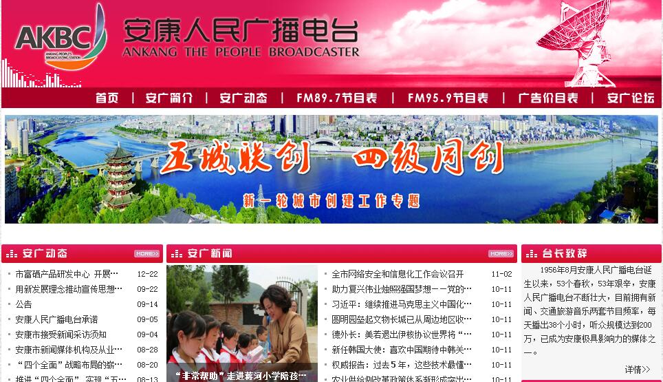 安康人民廣播電臺誕生于1956年8月,前身是安康縣廣播站。1988年9月經國家廣電部批準成立廣播電臺,2001年上劃為市級廣播電臺。50年的歷程,安康廣播有過自己的輝煌與驕傲,也經歷過陣痛與彷徨,進入二十一世紀,順應全國廣播改革的大潮,臺里一班人牢固樹立“經營、創(chuàng)新、發(fā)展”的辦臺理念,一方面盡職盡責發(fā)揮好耳目喉舌作用,完成好市委、市政府賦予我們的神圣職責,一方面聚精會神抓事業(yè)發(fā)展,鞏固擴大主流媒體陣地,不斷提高廣播的競爭力。2005年初,臺里一班人以發(fā)展的眼光,超人的勇氣,大膽決策,自籌資金創(chuàng)辦第二套節(jié)目,拓展了廣播的發(fā)展空間,邁出了做大做強廣播事業(yè)堅實的一步。通過改變傳統(tǒng)的運營模式,合理配置廣播資源,推行市場化運作、產業(yè)化經營,使安康廣播逐步擺脫低迷,實現了高起點大發(fā)展,全臺上下形成了聚精會神抓事業(yè)、一心一意謀發(fā)展的良好氛圍。到目前,安康人民廣播電臺已擁有漢水之聲、魅力之聲兩個頻率,即調頻(FM89.7)新聞廣播和調頻(FM95.9)交通旅游音樂廣播。兩套節(jié)目每天播出37個小時,推出各類自辦欄目52檔,其中許多欄目已成為廣大聽眾喜愛的名牌節(jié)目。同時,擁有部頒標準的演播廳、錄音室、直播室,采用當今世界先進的意大利RVR3千瓦數字發(fā)射機和數字音頻工作站、數字調音臺等設備。建起了計算機局域網絡,實現了數字化錄制播出。節(jié)目信號覆蓋全市九縣一區(qū)和毗鄰地市部分縣區(qū),擁有聽眾近150萬人,成為秦巴山區(qū)、漢水流域最有影響的地方電臺。