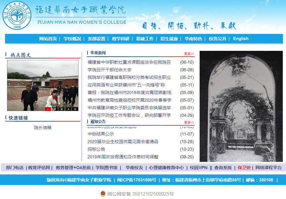 福建華南女子職業(yè)學(xué)院前身是創(chuàng)建于1908年的私立華南女子文理學(xué)院,1984年經(jīng)教育部批準復(fù)辦。是全日制民辦普通高職院校。學(xué)制三年。學(xué)院分為旗山校區(qū)和煙臺山校區(qū)兩個部分,占地230畝,建筑總面積8.1萬平方米?,F(xiàn)有在校生4000人,教職員工217人,其中專任教師187人,高級職稱人數(shù)37人。學(xué)院有文化教育、健康服務(wù)、藝術(shù)設(shè)計、旅游服務(wù)及國際商務(wù)管理等5個系,下設(shè)學(xué)前教育、應(yīng)用英語(少兒英語方向)、食品營養(yǎng)與檢測、食品營養(yǎng)與衛(wèi)生、家政服務(wù)與管理、老年服務(wù)與管理、服裝與服飾設(shè)計、鞋類設(shè)計與工藝、建筑室內(nèi)設(shè)計、工程造價、數(shù)字媒體藝術(shù)設(shè)計、藝術(shù)設(shè)計、人物形象設(shè)計、旅游管理、酒店管理、會展策劃與管理、空中乘務(wù)、國際經(jīng)濟與貿(mào)易、商務(wù)英語(跨境電商方向)、商務(wù)經(jīng)紀與代理、會計、公共事務(wù)管理(文秘與公關(guān)方向)、移動商務(wù)等23個專業(yè)。學(xué)院始終堅持不以營利為目的,重視保持自身的辦學(xué)特色與教學(xué)教育質(zhì)量。 本著“培養(yǎng)一個好女子,造就一個小家庭,和諧一個大社會”的辦學(xué)理念,學(xué)院傳承“受當施”精神,圍繞婦女、兒童、老年人群體優(yōu)先設(shè)置與現(xiàn)代服務(wù)業(yè)相關(guān)的應(yīng)用型專業(yè),與福建產(chǎn)業(yè)結(jié)構(gòu)調(diào)整轉(zhuǎn)型升級相適應(yīng),培養(yǎng)生產(chǎn)、建設(shè)、管理、服務(wù)一線的高素質(zhì)的行業(yè)、區(qū)域性技術(shù)技能型人才。2008年11月,學(xué)院以良好的成績通過了教育部高職高專人才培養(yǎng)工作水平評估。2011年初,學(xué)院被確定為教育部非營利民辦高校辦學(xué)制度改革試點項目單位。2013年,學(xué)院完成事業(yè)單位法人登記。2015年,學(xué)院通過了第二輪高職高專人才培養(yǎng)工作評估。2016年,學(xué)院被評為首批“福建省家庭服務(wù)職業(yè)培訓(xùn)示范基地”。學(xué)院現(xiàn)有省級精品專業(yè)2個,省級示范專業(yè)2個,省級財政支持的實訓(xùn)基地1個,省級精品課程3門,省級教學(xué)名師1人,省級教學(xué)成果2項。學(xué)院曾獲得 “中國民辦教育創(chuàng)新與發(fā)展貢獻獎”、“全國先進民間組織”、“全國五四紅旗團支部”、第十一屆、第十二屆 “福建省文明學(xué)校”、福建省先進基層黨組織等榮譽稱號。學(xué)院理事長陳鐘英、校教學(xué)督導(dǎo)馬秀發(fā)被評為“福建省杰出人民教師”。學(xué)院外籍教師Betts獲得“國家友誼獎”、5位外籍教師獲得“福建省友誼獎”。