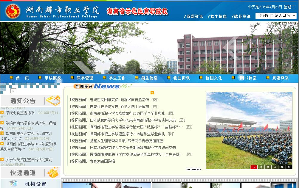 湖南都市職業(yè)學(xué)院創(chuàng)辦于1981年,前身為湖南信息管理專修學(xué)院,2007年2月經(jīng)湖南省人民政府批準(zhǔn)升格為全日制普通高職院校,隸屬長沙市人民政府主管。學(xué)院地處長沙市“一區(qū)兩園”(即國家級長沙經(jīng)濟(jì)技術(shù)開發(fā)區(qū)、湖南印刷工業(yè)園、黃花國際空港工業(yè)園),毗鄰長沙黃花國際機(jī)場、長沙火車南站(高鐵站)、長沙汽車東站,與15家世界五百強(qiáng)企業(yè)為鄰。學(xué)院設(shè)有航空服務(wù)與城軌管理系、建筑工程系、經(jīng)濟(jì)信息管理系、印刷技術(shù)系、機(jī)電工程系、外語系、五年制大專部和基礎(chǔ)課部等六系二部,開設(shè)30個(gè)普通高職專業(yè),面向全國招生, 現(xiàn)有在校生12000余人,教職工880余人,行業(yè)企業(yè)兼職教師100余人。學(xué)院占地面積430畝,建筑面積近22萬平方米,教學(xué)科研儀器設(shè)備總值近5000萬元,館藏紙質(zhì)圖書近100萬冊,電子圖書1600GB、各類報(bào)刊雜志1000余種。學(xué)院擁有五大校內(nèi)實(shí)訓(xùn)基地,其中:印刷包裝實(shí)訓(xùn)基地是中央財(cái)政支持的實(shí)訓(xùn)基地,數(shù)控模具實(shí)訓(xùn)基地是與長城機(jī)械設(shè)備公司共建的校內(nèi)生產(chǎn)性實(shí)訓(xùn)基地,都具有教學(xué)、生產(chǎn)、培訓(xùn)等多重功能;航空服務(wù)、軌道交通實(shí)訓(xùn)基地是仿真性實(shí)訓(xùn)基地,具有票務(wù)、值機(jī)、安檢、閘門、廣播、信號、機(jī)艙或客艙服務(wù)等實(shí)訓(xùn)功能;建筑工程實(shí)訓(xùn)基地是以現(xiàn)場施工示范為特點(diǎn)的情景教學(xué)實(shí)訓(xùn)基地,重點(diǎn)培養(yǎng)學(xué)生對建筑結(jié)構(gòu)、建筑材料、建筑施工、裝飾裝修等的實(shí)踐能力。另外還建有54個(gè)專業(yè)實(shí)訓(xùn)室,包括:會計(jì)、電子、工程力學(xué)、建筑結(jié)構(gòu)、化妝、形體、計(jì)算機(jī)虛擬實(shí)訓(xùn)室等,配置教學(xué)用計(jì)算機(jī)1500臺。學(xué)院開辟了廣闊的就業(yè)渠道,與眾多名優(yōu)企業(yè)簽訂了校企合作協(xié)議與訂單培養(yǎng)合同,積極為學(xué)生提供就業(yè)服務(wù)?,F(xiàn)有105個(gè)穩(wěn)定的校外實(shí)習(xí)就業(yè)基地,多數(shù)分布在學(xué)院周邊,主要有:黃花國際機(jī)場、長沙軌道集團(tuán)、撈建集團(tuán)、固爾邦幕墻公司、點(diǎn)石家裝、藍(lán)思科技、遠(yuǎn)大空調(diào)、三一重工、天聞印務(wù)、向維彩印、凌華印務(wù)、金沙利彩印、長豐獵豹、LG電子、通用模塑、易通科技等。近3年來畢業(yè)生就業(yè)率均在98%以上。學(xué)院注重學(xué)生綜合素質(zhì)培養(yǎng),現(xiàn)有各類社團(tuán)30余個(gè),第二課堂活動豐富多彩。