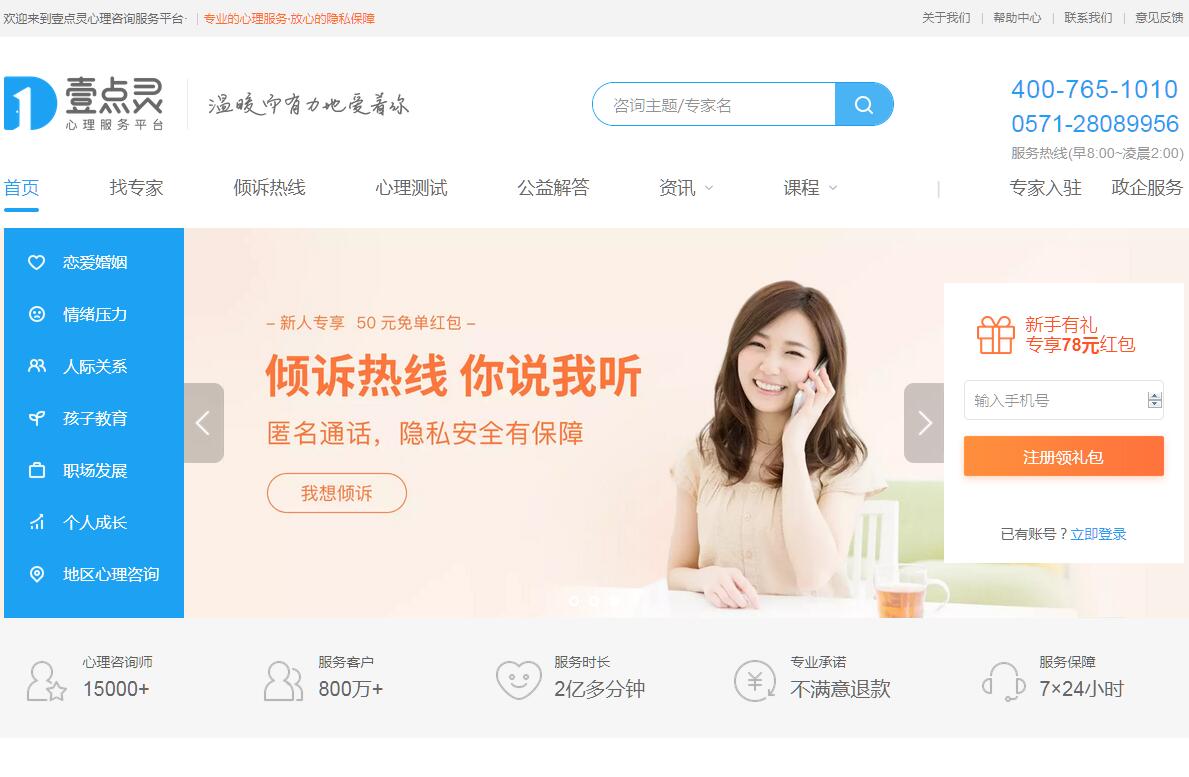 | 網站簡介: 壹點靈心理咨詢平臺匯聚全國知名千位咨詢師醫(yī)生,覆蓋上海,北京,深圳,杭州,武漢,臺州等城市,24小時提供免費在線心理咨詢服務和心理測試,幫助需要心理咨詢的客戶梳理親子教育、婚姻戀愛、職場人際方面的困擾以及解決失眠、抑郁癥、焦慮癥、婚姻、挽回愛情等問題,專業(yè)情感咨詢和婚姻咨詢服務,找心理醫(yī)生,上壹點靈。 |