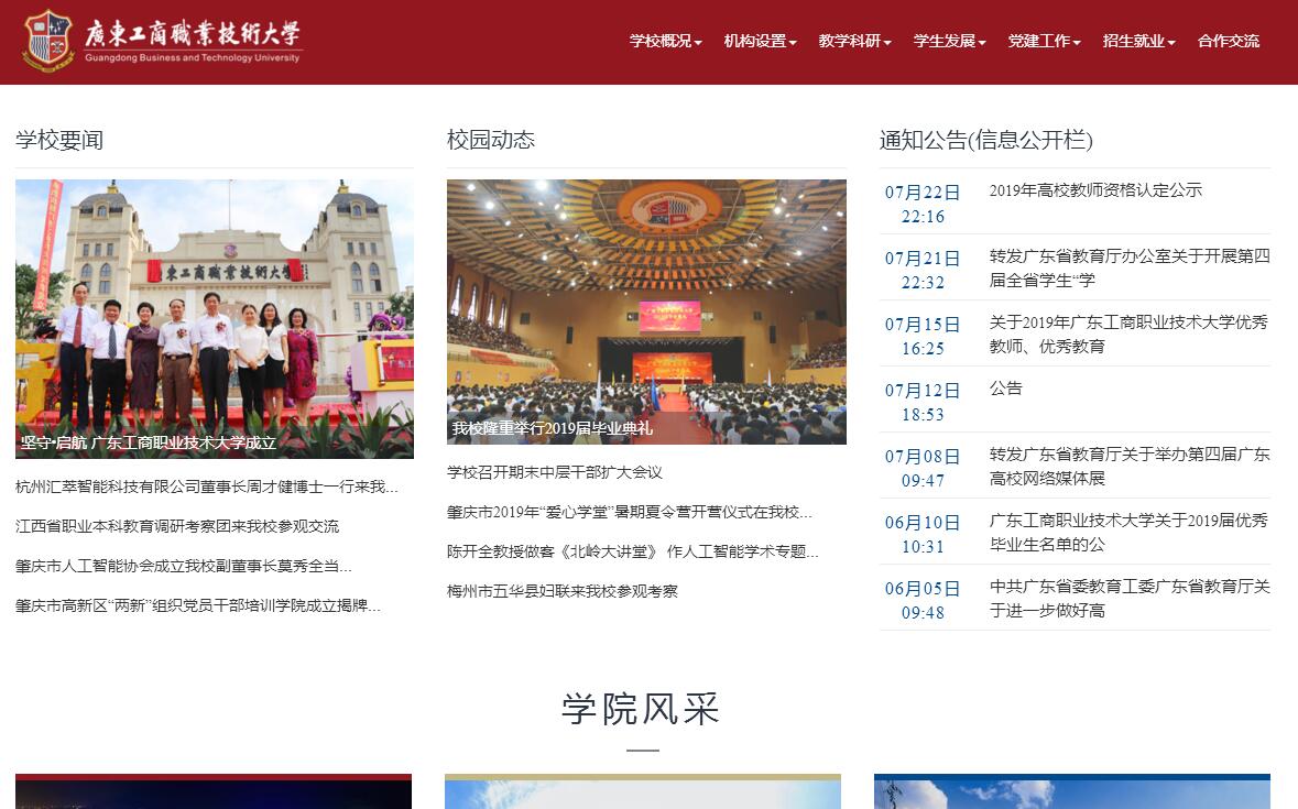 廣東工商職業(yè)技術(shù)大學(xué)的辦學(xué)前身是創(chuàng)辦于1996年的東方人才學(xué)校,1997年學(xué)校更名為肇慶市工商職業(yè)學(xué)校。2004年3月經(jīng)廣東省人民政府批準(zhǔn)成立、國(guó)家教育部備案,學(xué)校升格為肇慶工商職業(yè)技術(shù)學(xué)院,2014年更名為廣東工商職業(yè)學(xué)院。2018年獲批升格為本科院校。2019年5月教育部正式批準(zhǔn)命名為廣東工商職業(yè)技術(shù)大學(xué),是國(guó)內(nèi)首批本科層次職業(yè)教育試點(diǎn)學(xué)校。學(xué)?,F(xiàn)有星湖和大旺兩個(gè)校區(qū),分別坐落在七星巖國(guó)家級(jí)重點(diǎn)風(fēng)景名勝區(qū)和肇慶國(guó)家級(jí)高新技術(shù)產(chǎn)業(yè)開發(fā)區(qū)。學(xué)校占地面積1283畝,總建筑面積44.32萬平方米。校園環(huán)境優(yōu)雅,景色秀麗,氣候宜人,交通便捷。辦學(xué)23年來,學(xué)校已成為工、管雙輪驅(qū)動(dòng),工、管、經(jīng)、文、藝多學(xué)科協(xié)調(diào)發(fā)展的普通高等院校?,F(xiàn)設(shè)有智能制造學(xué)院、體育與健康學(xué)院、建筑工程系、計(jì)算機(jī)應(yīng)用技術(shù)系、經(jīng)濟(jì)管理系、工商管理系、財(cái)會(huì)系、應(yīng)用外語(yǔ)系、藝術(shù)設(shè)計(jì)系、文化傳播系、公共教學(xué)部和思政教學(xué)部等2院8系2部,開設(shè)48個(gè)專業(yè)(方向)。建有智能制造、電子信息、建筑、財(cái)經(jīng)商貿(mào)、藝術(shù)創(chuàng)意等五大實(shí)驗(yàn)實(shí)訓(xùn)中心,各類實(shí)驗(yàn)實(shí)訓(xùn)室157個(gè),教學(xué)科研儀器設(shè)備總值1.15億元。圖書總數(shù)為116萬冊(cè),中外文期刊1100多種?,F(xiàn)有省級(jí)重點(diǎn)專業(yè)1個(gè),省級(jí)財(cái)政資助專業(yè)6個(gè),專業(yè)建有省級(jí)大學(xué)生校外實(shí)踐教學(xué)基地2個(gè),專業(yè)建有省級(jí)公共實(shí)訓(xùn)中心1個(gè);校級(jí)重點(diǎn)專業(yè)7個(gè)、品牌專業(yè)2個(gè)、特色專業(yè)4個(gè);省級(jí)工程研究中心1個(gè);省級(jí)決策咨詢基地1個(gè)。學(xué)校專任教師661人,具有碩士學(xué)位和副高以上職稱的教師分別占專任教師的41.15%和32.38%,“雙師型”教師占33.74%。教師隊(duì)伍中有國(guó)家級(jí)優(yōu)秀教師1人、省級(jí)優(yōu)秀教師3人、省級(jí)教學(xué)名師1人。此外,還聘請(qǐng)來自行業(yè)、企業(yè)的兼職教師164人。學(xué)?,F(xiàn)有全日制在校生1萬多人。近年來,學(xué)校人才培養(yǎng)質(zhì)量逐年提高,受到用人單位認(rèn)可,就業(yè)率一直持續(xù)保持在98%以上。2018年我校獲廣東省教學(xué)成果獎(jiǎng)二等獎(jiǎng)。學(xué)校堅(jiān)持產(chǎn)教融合、校企合作、協(xié)同發(fā)展理念,實(shí)施“一園一鏈”發(fā)展戰(zhàn)略,在大旺校區(qū)重點(diǎn)發(fā)展新工科,并與肇慶國(guó)家高新區(qū)、長(zhǎng)春理工大學(xué)及相關(guān)企業(yè)合作創(chuàng)建“長(zhǎng)春理工大學(xué)國(guó)家大學(xué)科技園肇慶分園”,共建技術(shù)創(chuàng)新、研發(fā)、轉(zhuǎn)化平臺(tái),并建設(shè)企業(yè)孵化園;在星湖主校區(qū)采取“政、企、校、行業(yè)”協(xié)同發(fā)展的運(yùn)行機(jī)制,打造適應(yīng)粵港澳大灣區(qū)發(fā)展、適應(yīng)廣東經(jīng)濟(jì)社會(huì)發(fā)展、適應(yīng)肇慶產(chǎn)業(yè)發(fā)展的經(jīng)管類特色專業(yè)鏈,為區(qū)域經(jīng)濟(jì)發(fā)展提供高質(zhì)量的人才資源和社會(huì)服務(wù)。近些年,學(xué)校緊緊圍繞培養(yǎng)未來中小企業(yè)家的人才培養(yǎng)特色,構(gòu)建文化素質(zhì)、專業(yè)知識(shí)、職業(yè)技能、創(chuàng)業(yè)創(chuàng)業(yè)精神四位一體的人才培養(yǎng)模式,推進(jìn)產(chǎn)教融合、校企合作,不斷提高人才培養(yǎng)質(zhì)量;推行教師“雙師型”和學(xué)生“雙證書”制,工學(xué)結(jié)合、育訓(xùn)并重,提高學(xué)業(yè)職業(yè)能力和可持續(xù)發(fā)展能力;開設(shè)“百名教授專家系列講座”、“百名企業(yè)家系列講座”,激發(fā)學(xué)生學(xué)習(xí)熱情;引進(jìn)清華科技園素質(zhì)拓展訓(xùn)練項(xiàng)目,培養(yǎng)學(xué)生團(tuán)隊(duì)合作意識(shí)和體育鍛煉習(xí)慣;大力支持學(xué)生社團(tuán)活動(dòng),深入貫徹學(xué)生發(fā)展和服務(wù)學(xué)生理念;搭建大學(xué)生創(chuàng)業(yè)教學(xué)、創(chuàng)業(yè)培訓(xùn)、創(chuàng)業(yè)孵化三級(jí)平臺(tái),培養(yǎng)學(xué)生創(chuàng)業(yè)意識(shí)、創(chuàng)業(yè)精神和創(chuàng)業(yè)能力。學(xué)校先后被教育部科教所、廣東省教育廳等評(píng)為“人民滿意的民辦大學(xué)”、“中國(guó)最佳工商類大學(xué)”、“中國(guó)最具前景的大學(xué)”、“廣東省肇慶職教基地建設(shè)先進(jìn)單位”、“改革開放30年中國(guó)十大品牌高等職業(yè)院校”、“廣東省十佳民辦高?!?、“廣東省民辦高等職業(yè)教育競(jìng)爭(zhēng)力10強(qiáng)單位”、“廣東省大學(xué)生創(chuàng)新創(chuàng)業(yè)示范學(xué)?!?。目前學(xué)校正積極推進(jìn)創(chuàng)新強(qiáng)校工程、本科層次職業(yè)教育改革工程,不斷深化辦學(xué)特色和教育教學(xué)改革,全面提升辦學(xué)實(shí)力和人才培養(yǎng)質(zhì)量,努力辦成人