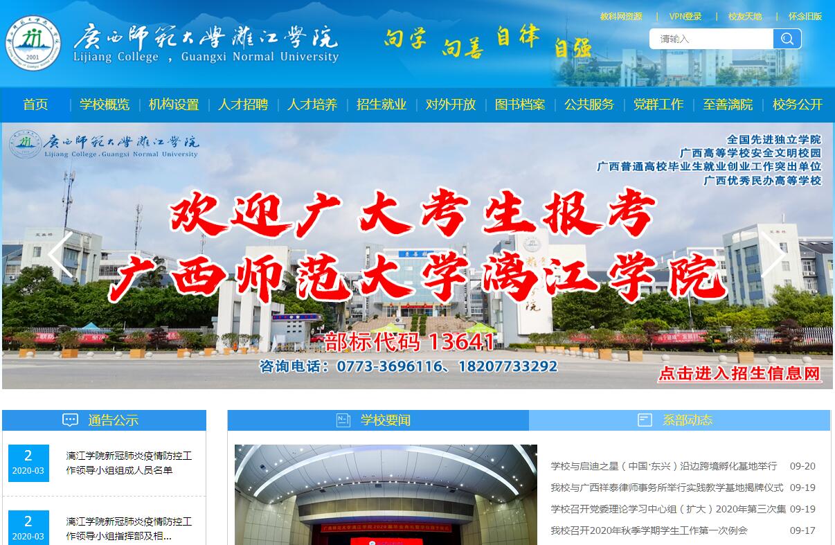 廣西師范大學(xué)漓江學(xué)院創(chuàng)建于2001年5月,是經(jīng)教育部批準(zhǔn),由廣西師范大學(xué)按新機制、新模式舉辦的全日制應(yīng)用型普通本科高等學(xué)校(獨立學(xué)院)。學(xué)校是中國獨立學(xué)院協(xié)作會常務(wù)理事單位、中國教育發(fā)展戰(zhàn)略學(xué)會教育管理信息化專業(yè)委員會理事單位、全國(寧波)文化創(chuàng)意產(chǎn)教合作聯(lián)盟理事單位、廣西高等教育學(xué)會會員單位、廣西“應(yīng)用技術(shù)大學(xué)(學(xué)院)聯(lián)盟”會員單位。學(xué)校地處國家歷史文化名城桂林市,坐落于漓江之濱、雁山腳下,東向與廣西師范大學(xué)雁山校區(qū)隔路相對。校園占地近900畝,建筑面積21.92萬平方米,圖書館藏書76.8萬冊,建有多媒體教室93間、各類實驗實訓(xùn)場所(室)76個(間),總資產(chǎn)近7億元。學(xué)校環(huán)境優(yōu)美,辦學(xué)和生活服務(wù)設(shè)施完善,無線網(wǎng)絡(luò)校園全覆蓋,為學(xué)子們營造了沐浴書香、暢游學(xué)海、靜學(xué)深思的修讀氛圍。學(xué)?,F(xiàn)有語言文學(xué)學(xué)院、傳媒學(xué)院、經(jīng)濟與管理學(xué)院、商貿(mào)與法律學(xué)院、教育與音樂學(xué)院、設(shè)計學(xué)院、體育與健康學(xué)院、理工學(xué)院、馬克思主義學(xué)院/至善學(xué)院(合署)等9個二級學(xué)院,校企共建名淘電商學(xué)院、粵嵌電子工程學(xué)院、融媒體學(xué)院等3個產(chǎn)業(yè)(行業(yè))學(xué)院。開設(shè)49個本科專業(yè),初步形成了涵蓋經(jīng)、法、教、文、理、工、管、藝8個學(xué)科門類,以面向和對接現(xiàn)代服務(wù)業(yè)專業(yè)為主體、以教師教育類和人文社科類專業(yè)為兩翼,以文化創(chuàng)意與教育服務(wù)、財經(jīng)商貿(mào)與法律服務(wù)、信息與通信技術(shù)服務(wù)、旅游+運動康養(yǎng)服務(wù)4個專業(yè)集群為平臺的“一體兩翼四集群”專業(yè)結(jié)構(gòu)格局。建有廣西高校自治區(qū)級特色專業(yè)2個,廣西高校自治區(qū)級創(chuàng)新創(chuàng)業(yè)教育示范專業(yè)、自治區(qū)級轉(zhuǎn)型發(fā)展試點專業(yè)(群)、自治區(qū)級協(xié)同育人(建設(shè))平臺、自治區(qū)級實驗教學(xué)示范(建設(shè))中心、自治區(qū)級大學(xué)生校外實踐教學(xué)基地、自治區(qū)級大學(xué)生創(chuàng)業(yè)示范基地各1個,以及廣西民辦高校重點專業(yè)和重點支持建設(shè)專業(yè)8個,自治區(qū)一流本科專業(yè)建設(shè)點2個,自治區(qū)級一流本科課程3門。學(xué)校面向全國22個?。ㄊ?、自治區(qū))招生,現(xiàn)有全日制普通本科在校生12568人,其中高職高專起點(專升本)學(xué)生269人。近年來,學(xué)生在國家級、自治區(qū)級各類學(xué)科(技能)大賽中獲獎2000余人次,斬獲全國大學(xué)生電子設(shè)計競賽一等獎、全國高校國際貿(mào)易專業(yè)技能大賽一等獎、全國大學(xué)生廣告藝術(shù)大賽二等獎,以及廣西師范生教學(xué)技能大賽高中組一等獎和初中組一等獎、全國大學(xué)生數(shù)學(xué)建模競賽廣西賽區(qū)一等獎、全區(qū)師范生教學(xué)信息化大賽一等獎等高含金量的獎項。近五年來,畢業(yè)生就業(yè)率居廣西同類高校前列,先后獲得2015年度、2018年度、2019年度“廣西普通高校畢業(yè)生就業(yè)創(chuàng)業(yè)工作突出單位”殊榮,2019屆畢業(yè)生初次就業(yè)率和一次就業(yè)率分別達(dá)到91.93%和89.01%。截止2019年7月,學(xué)校為國家和地方輸送了14屆畢業(yè)生共28000余人。學(xué)校現(xiàn)有教職工近500人,其中自有專任教師近300人。自有專任教師中,副高以上職稱64人,碩士以上學(xué)位210人。擁有全國優(yōu)秀教育工作者1人,教育部萬名優(yōu)秀創(chuàng)新創(chuàng)業(yè)導(dǎo)師庫入選導(dǎo)師4人,自治區(qū)優(yōu)秀創(chuàng)新創(chuàng)業(yè)導(dǎo)師人才庫首批入選導(dǎo)師13人,教育部全國高校思政教育優(yōu)秀工作者1人,廣西高校首批“卓越學(xué)者”1人,廣西高校優(yōu)秀中青年骨干教師培養(yǎng)工程人選3人,廣西高校優(yōu)秀青年骨干教師國內(nèi)訪問學(xué)者計劃人選4人,西部地區(qū)高校人才培養(yǎng)特別項目人選3人,廣西高校青年教師教學(xué)業(yè)務(wù)能力提升計劃人選58人,廣西民辦高校“優(yōu)秀教師”15人,國家留學(xué)基金委建設(shè)高水平大學(xué)公派研究生項目人選2人,中國教育發(fā)展戰(zhàn)略學(xué)會教育管理信息化專業(yè)委員會理事1人,全國(寧波)文化創(chuàng)意產(chǎn)教合作聯(lián)盟理事單位理事1人,廣西高校中國語言文學(xué)類教學(xué)指導(dǎo)委員會副主任委員1人、高等學(xué)校對口支援教學(xué)指導(dǎo)委員會委員1人、英語類教學(xué)指導(dǎo)委員會委員1人,國家社科基金課題立項、項目結(jié)項通訊評審專家1人,廣西高校教師系列專業(yè)技術(shù)職務(wù)評審專家1人,廣西高等學(xué)校教師資格專家審查委員會委員1人,廣西民間文藝家協(xié)會副主席1人,廣西語言文學(xué)學(xué)會會長1人,廣西壯學(xué)學(xué)會常務(wù)理事兼副秘書長1人,廣西師范大學(xué)博士后合作導(dǎo)師1人、博士研究生導(dǎo)師1人,廣西師范大學(xué)碩士研究生導(dǎo)師10人,等等。學(xué)校還聘請張葆全、施建軍等一批高校知名學(xué)者、企