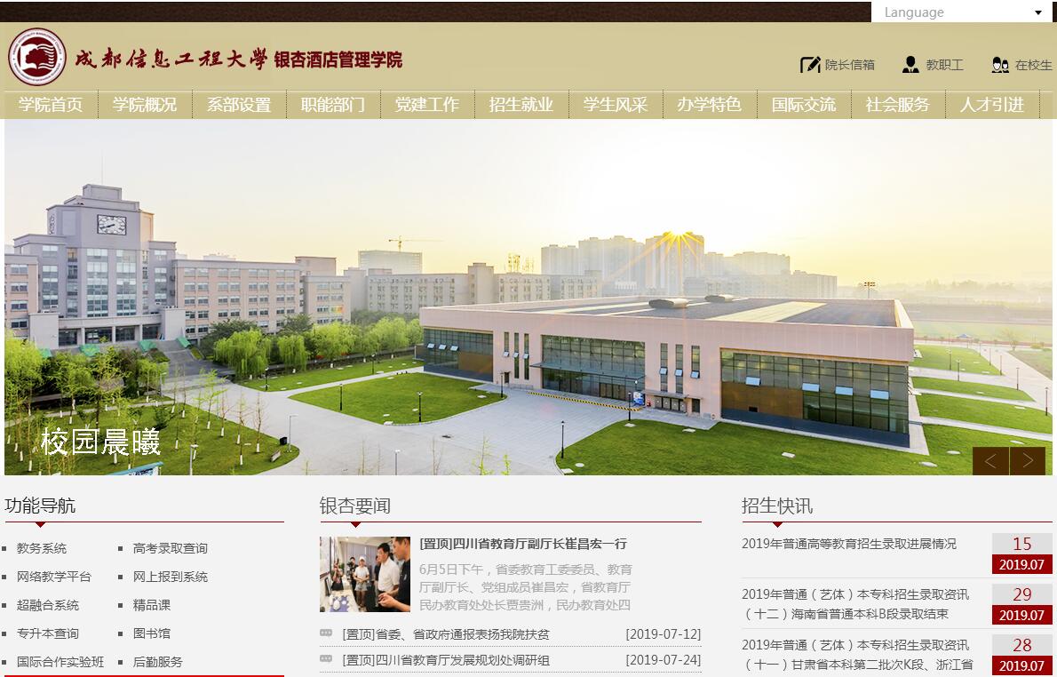 成都信息工程大學(xué)銀杏酒店管理學(xué)院成立于2002年,是由成都銀杏資產(chǎn)管理有限公司全額出資,與成都信息工程大學(xué)合作舉辦的本科層次獨立學(xué)院,是四川省首批由教育部審核確認的獨立學(xué)院之一。學(xué)院位于成都市郫都區(qū),根植天府沃土,為人文歷史厚積之地。古有望帝啼鵑,今有銀杏含芳,交通便利,教學(xué)、生活設(shè)施完善,環(huán)境幽雅、花木繁茂、碧草如茵,讀書治學(xué)兩相宜。建院以來,秉承“服務(wù)養(yǎng)成,知行相濟”的校訓(xùn),本著“成就學(xué)生,服務(wù)社會”的辦學(xué)理念,面向現(xiàn)代服務(wù)業(yè),著力培養(yǎng)具備專業(yè)理論知識技能,具有人文素養(yǎng)、創(chuàng)新意識和實踐能力的高素質(zhì)應(yīng)用型人才。歷經(jīng)十余年發(fā)展,已成為以酒店、旅游為特色,多學(xué)科、多專業(yè)協(xié)調(diào)發(fā)展的應(yīng)用型本科高等學(xué)府,學(xué)院現(xiàn)設(shè)有8個系,設(shè)有管理學(xué)、文學(xué)、工學(xué)、教育學(xué)與藝術(shù)學(xué)5個跨度較廣的學(xué)科,25個本科專業(yè)、22個??茖I(yè)。我們擁有高素質(zhì)且充滿實戰(zhàn)經(jīng)驗的教師隊伍,具有教師資質(zhì)的員工307人(其中包含154名全職教師),另聘有兼職教師134人。全職教師中約99.4%擁有學(xué)士及以上學(xué)位,約65.6%擁有碩士及以上學(xué)位,44.2%為教授或副教授。學(xué)院于2016/2017學(xué)年有在校學(xué)生9,327人,于2017/2018學(xué)年有在校學(xué)生9,553人,累計已有近2萬名莘莘學(xué)子跨出校門,步入社會,一展所長。治學(xué)十余載,碩果累累。在政府部門支持下,建成了“國家西部旅游專門人才培訓(xùn)示范單位”、“四川省文科實踐教育基地”、“四川省旅游與酒店管理實驗教學(xué)示范中心” “四川酒店與飲食文化社會科學(xué)普及基地”、“四川省旅游科研重點基地”、“四川省首批賓館飯店經(jīng)營管理人才培訓(xùn)示范單位”、“四川省創(chuàng)新創(chuàng)業(yè)教育先進學(xué)?!钡?。學(xué)院長期堅持產(chǎn)教融合、協(xié)同育人。學(xué)院與包括世界三大酒店管理集團(希爾頓、洲際、萬豪)在內(nèi)的3家人才中心及126家國內(nèi)外知名企業(yè)建立穩(wěn)定的長期合作關(guān)系,在實踐教學(xué)基地、師資互動、教學(xué)科研、辦企業(yè)定向培養(yǎng)班、橫向科研課題、項目開發(fā)應(yīng)用、公益活動合作等方面成效顯著,學(xué)院與希爾頓、洲際、萬豪等中國總部合作并簽訂戰(zhàn)略合作協(xié)議,與美國飯店協(xié)會教育學(xué)院(AH&LA-EI)簽訂合作協(xié)議,與洲際集團共建“洲際英才班”等。艾瑞森中國校友會網(wǎng)《2017中國大學(xué)評價研究報告》顯示, 我院位列“2017中國獨立學(xué)院一流本科專業(yè)排行榜”綜合排名第65名、“2017中國獨立學(xué)院本科專業(yè)排行榜100強”綜合排名第28位,“2017四川省獨立學(xué)院本科專業(yè)排行榜”進入前3強。我院有包括酒店管理在內(nèi)的23個本科專業(yè)榮膺星級專業(yè),其中:酒店管理專業(yè)榮膺六星級專業(yè)(即中國頂尖獨立學(xué)院本科專業(yè))。