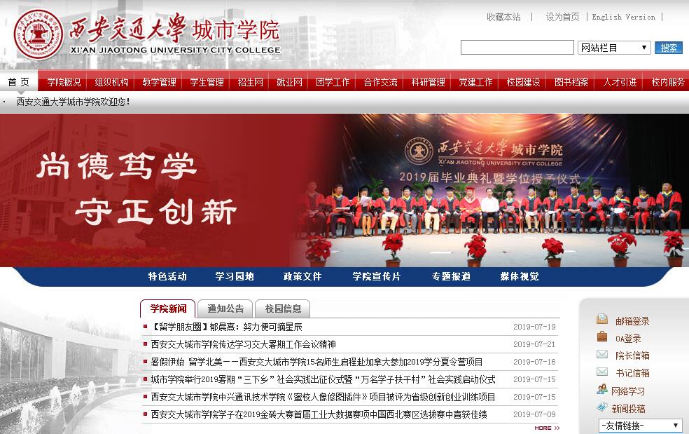 西安交通大學城市學院成立于2004年,是經國家教育部批準、由西安交通大學和西安博通資訊股份有限公司共同舉辦的新型全日制普通本科高校。院長是西安交通大學博士生導師陳光德教授。學院的校訓是:尚德篤學,守正創(chuàng)新。辦學定位是:服務陜西,國內一流,國際知名。學院依托西安交通大學百年名校優(yōu)質的學科資源、雄厚的師資力量、規(guī)范而嚴格的教學管理優(yōu)勢,根據現代科學技術發(fā)展趨勢和地方經濟社會發(fā)展需求設置專業(yè)。學院面向全國招生,現設有電氣與信息工程系、計算機科學與信息管理系、機械工程系、經濟系、管理系、外語系、藝術系、護理系、傳播系、土木建筑工程系等10個系,4個教學部,16個研究所,44個本科專業(yè),形成了以工科類、經管類專業(yè)為支撐,以藝術、文學、醫(yī)學類專業(yè)相配合協調的多學科結構。目前有全日制本科學生8708名。學院秉承西安交通大學優(yōu)良的辦學傳統(tǒng),通過改革傳統(tǒng)的教學計劃,構建了新的人才培養(yǎng)方案,實施了新的人才培養(yǎng)模式,按照“以學生為主體,以教師為主導,以育人為宗旨,以教學為中心”的辦學指導思想,確立了“保證基礎,強化實踐,注重能力,提升素質”的人才培養(yǎng)指導思想,以培養(yǎng)基礎好、技能強、素質高的可持續(xù)發(fā)展應用型人才為目標,著力構建按社會需求設置專業(yè),按學科大類打好基礎,按就業(yè)方向安排模塊,使學生橫向可轉移、縱向可提升,形成了“理論教學體系、實踐教學體系、素質拓展提升體系”三位一體的應用型人才培養(yǎng)方案。注重培養(yǎng)學生的應用能力、創(chuàng)新意識和綜合素質,努力將學生培養(yǎng)成為具有合理知識結構、較高綜合素質、持續(xù)發(fā)展能力、社會責任感和競爭力強的優(yōu)秀人才。學院坐落于西安經濟開發(fā)區(qū)草灘生態(tài)產業(yè)園,校園占地523畝,規(guī)劃建筑面積30萬平方米。校園周圍綠水環(huán)繞、花果飄香、空氣清新,基本設施先進,辦學條件齊備?,F建有多媒體教室、語音實驗室、電工電子、計算機、物理等教學實驗中心,以及電氣信息類、機械能動類、土木建筑類、藝術設計類、醫(yī)學護理類和經管類等六大類100余個專業(yè)實驗室,此外還有110多個校外實習實訓基地,與中興通訊、中航聯盟等國內著名企業(yè)開展聯合辦學,為學生實踐能力和創(chuàng)新能力的培養(yǎng)奠定了基礎。學院還有5.5萬平方米的籃球、足球、田徑、體操等體育設施以及大型學生活動中心等,為學生德、智、體、美全面發(fā)展提供了良好的條件。學院圖書館現有面積4347平方米,建設有4個借閱一體的圖書借閱室,1個擁有65臺計算機的電子閱覽室,共有1106個閱覽座位;已形成以經濟、管理、外語、工程技術類紙質圖書為主體的藏書體系。館藏圖書現有83.69萬冊,數字圖書15265GB,期刊1000余種,全文數字期刊8300多種,有萬方、維普、超星、讀秀等7個電子數據文獻庫,所有資料全天候全開架。學院自成立之初就非常重視信息化建設,投入了大量資金建設校園網絡及管理信息系統(tǒng),目前已建成覆蓋現有園區(qū)的校園網信息點11275個,園區(qū)內鋪設光纜25000余米,實現樓與樓之間主干千兆光纜連接,百兆到桌面的網絡基礎應用環(huán)境。學院建有多媒體教室82間,座位數12749個;語音室5間,座位數238個;計算機教學機房10間,座位數766個。于2007年開通了電信(Chinanet)及中國教育網(Cernet)兩條校園網出口,實現了與互聯網的連接與資源共享,學院中心機房現有60多臺專用服務器,為全院師生提供了多項信息應用服務。學院已經建立起一支學術帶頭人、教學名師為龍頭,以中青年教學骨干為主體,專兼結合、素質優(yōu)良、整體結構合理且發(fā)展趨勢良好的師資隊伍。學院現有教師530余名,45%具有高級技術職務,85%具有碩士以上學歷。享有國務院政府特殊津貼專家4人,省級教學名師4人,教育部教學指導委員會委員5人,國家級教學成果獎獲得者11人,國家級精品課程負責人4人,省級精品課程負責人5人,外籍教師2人,“雙師雙能”型教師150余人。2014年起,學院在省內本科第二批次進行招生,招生質量位居陜西省同類院校第一,處于全國同類院校前列。近三年就業(yè)率均達到95%以上。學院的綜合聲譽不斷提高,在社會上逐步樹立起了良好的形象與品牌,學院曾被評為“全國先進獨立學院”“中國民辦高等教育優(yōu)秀院校”“綜合實力20強獨立學院”“中國10大品牌獨立學院”“全國中學生最信賴的十佳獨立學院”和“陜西省文明校園”等。學院學生參加的學科競賽主要包括中國“互聯網+”大學生創(chuàng)新創(chuàng)業(yè)大賽、全國大學生數學建模競賽、全國大學生電子設計大賽、全國大學生機械創(chuàng)新設計大賽、大學生“挑戰(zhàn)杯”競賽等國家級賽事以及部分影響力較大的專科、文體類賽事,累計常規(guī)參賽項目三十余項。各類獲獎總數累計達765項,其中國家級獎項144項,省級獎項621項。校園文化精彩紛呈,目前學院共有各類學生社團106個,迎新晚會、新年音樂會、畢業(yè)生晚會、“星光大道”校園歌手大賽、校園主持人大賽等學生自發(fā)組織、自發(fā)籌辦的活動已逐漸向著多樣化和品牌化方向發(fā)展。學院堅持國際化辦學理念,利用自身的辦學優(yōu)勢開