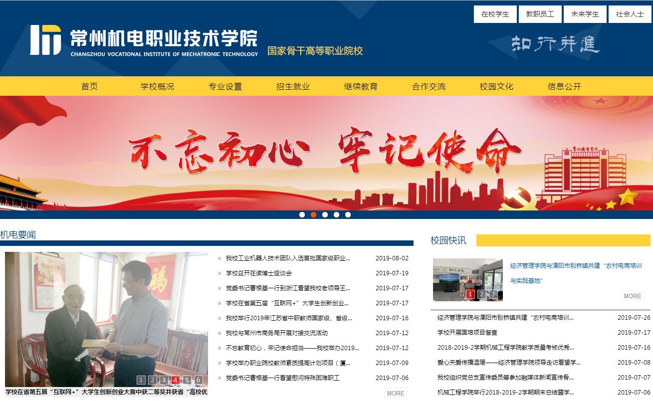 常州機電職業(yè)技術(shù)學院,是一所省屬公辦全日制高等職業(yè)院校,創(chuàng)辦于1963年,原名常州市機械職業(yè)學校,現(xiàn)坐落于常州科教城。2002年,學校獨立升格為高職院校,隸屬江蘇省教育廳。2010年,學校成為國家示范(骨干)高職院校;2018年,學校成為江蘇省高水平高職院校建設單位。學校占地面積942畝,建筑面積30多萬平方米,現(xiàn)有全日制在校生10000余人(規(guī)模12000人),教職工700余人。學校秉承“知行并進”的校訓精神,堅持“以人為本、崇尚技術(shù)、開放共享、追求卓越”的辦學理念和“就業(yè)導向,使每個學生成才;持續(xù)改進,讓一切客戶滿意”的辦學質(zhì)量方針,大膽創(chuàng)新辦學體制機制,深化教育教學改革。學校創(chuàng)新“四方三層、內(nèi)園外站、共建共贏”校企合作辦學模式,組建由政行企校四方代表成員組成的校企合作理事會,打造“內(nèi)園外站”校企合作平臺,建立“跨界互動、合作發(fā)展”的緊密型校企合作辦學機制,形成產(chǎn)教融合的“蘇南”模式。2014年牽頭成立“全國機械行業(yè)現(xiàn)代農(nóng)機裝備人才培養(yǎng)聯(lián)盟”、“全國機械行業(yè)工業(yè)機器人與智能裝備職業(yè)教育集團”等全國性職教集團,推進產(chǎn)教深度融合,提高辦學吸引力,打造職教品牌。學校根植產(chǎn)業(yè),服務地方,形成“以裝備制造產(chǎn)業(yè)類專業(yè)為核心、制造業(yè)服務類專業(yè)為支撐”的專業(yè)格局,開設專業(yè)45個。學校設有9個二級學院(機械工程學院、電氣工程學院、模具技術(shù)學院、車輛工程學院、軌道交通學院、信息工程學院、經(jīng)濟管理學院、創(chuàng)意設計學院、國際教育學院)、3個部(文化基礎部、專業(yè)基礎部、體育部)和馬克思主義學院、繼續(xù)教育學院等14個教學部門。學校主動對接區(qū)域產(chǎn)業(yè)發(fā)展需求,建有工業(yè)設計、先進機械制造技術(shù)、智能裝備技術(shù)、物聯(lián)網(wǎng)與制造業(yè)信息化、汽車技術(shù)與服務、供應鏈服務等六大特色專業(yè)群。學校深化“三合一、全過程”工學結(jié)合人才培養(yǎng)模式改革,實施“做中學”、“做中教”教學模式,構(gòu)建“多元主體、雙線并進、三化管理”教學質(zhì)量保障體系,建有教育部全國職業(yè)院校裝備制造類示范專業(yè)點2個,江蘇省高等學校品牌專業(yè)2個、省高等學校特色專業(yè)3個、國家骨干高職院校重點建設專業(yè)5個、央財重點支持建設專業(yè)2個、省示范性高職院校重點建設專業(yè)3個、全國機械行業(yè)特色專業(yè)4個、省重點專業(yè)群4個、省高校品牌專業(yè)工程一期項目2個、省高等職業(yè)教育高水平骨干專業(yè)5個。目前,學校有33個專業(yè)信息資源庫和59門課程教學子資源庫,其中“職業(yè)教育工業(yè)機器人技術(shù)專業(yè)教學資源庫”為“國家職業(yè)教育專業(yè)教學資源庫”并已通過驗收,另有國家職業(yè)教育專業(yè)教學資源庫課程子項目5個。學校重視師資隊伍建設,堅持把建設一支結(jié)構(gòu)合理、治學嚴謹、素質(zhì)優(yōu)良、富有活力的師資隊伍作為重中之重。學校有專任教師498人,從行業(yè)企業(yè)聘用兼職教師350余人。專任教師中,高級職稱210人,占專任教師的42.17%;碩士以上學位的教師375人(其中,具有博士學位教師54人),占專任教師的75.30%;具有雙師素質(zhì)的教師440人,占專任教師的88.35%。教師中,有江蘇省教學名師3人,江蘇省突出貢獻中青年專家1人,江蘇省“333工程”培養(yǎng)對象10人,江蘇省六大人才高峰資助對象2人,常州市831高層次創(chuàng)新創(chuàng)業(yè)人才培養(yǎng)對象2人,國家級教學團隊1個,江蘇省優(yōu)秀教學團隊3個,江蘇省“青藍工程”優(yōu)秀教學團隊2個,江蘇省“青藍工程”中青年學術(shù)帶頭人5人,江蘇省“青藍工程”優(yōu)秀中青年骨干教師25人。學校以每個學生成才為辦學己任,自2005年起開展ISO9000質(zhì)量管理貫標認證工作。作為常州及江蘇省智能裝備技術(shù)人才的重要培養(yǎng)基地,每年為區(qū)域輸送近4000名畢業(yè)生,畢業(yè)生初次就業(yè)率保持在98%以上,就業(yè)崗位專業(yè)對口率達85%以上,用人單位對學校畢業(yè)生的滿意度達96%以上。近年來,學生在全國職業(yè)院校技能大賽中獲一等獎16項,涌現(xiàn)了“江蘇省大學生年度人物”徐輝、全省大學生職業(yè)規(guī)劃大賽總冠軍何睿杰等一批典型學生。學校打造公共技術(shù)服務平臺,創(chuàng)建“多方位、立體化”的社會服務體系,建有機器人及智能裝備應用技術(shù)研究中心、物聯(lián)網(wǎng)與制造業(yè)信息化工程技術(shù)研發(fā)中心等國家級、省市級科技平臺20個,獲“江蘇省科技工作先進高?!狈Q號。學校大力推進繼續(xù)教育,年社會培訓近20000人次,獲“江蘇省高技能人才培養(yǎng)示范基地”稱號。學校“常州機器人及智能裝備應用技術(shù)研究中心”獲科技部立項,成為當年國家創(chuàng)新基金項目主持單位中唯一一所高職院校。學?!稊?shù)字化經(jīng)編裝備及智能化管理系統(tǒng)》項目,獲中華全國工商聯(lián)合會科技進步一等獎。學校拓展中外合作辦學項目、建立國際師資培訓機構(gòu)、互訪交流、聘請優(yōu)秀外教等方式,提升國際化辦學水平。近年來,學校與國際知