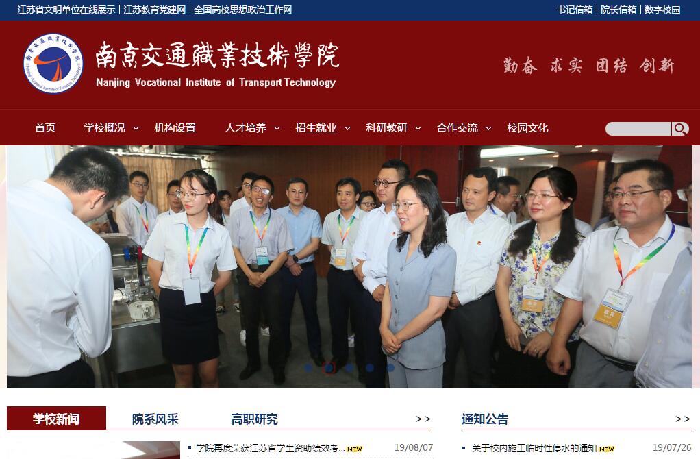 南京交通職業(yè)技術(shù)學(xué)院是公辦全日制普通高等學(xué)校,坐落在歷史源遠流長、文化底蘊厚重,素有“六朝古都”、“十朝都會”之美譽的南京。學(xué)院占地921畝,建筑面積35萬平方米,資產(chǎn)總值近13億元,教學(xué)儀器設(shè)備總值1.5億元。學(xué)院全日制在校生規(guī)模1萬余人、繼續(xù)教育規(guī)模5000余人。學(xué)院2005年以優(yōu)秀等次通過教育部高職高專院校人才培養(yǎng)工作水平評估,2008年被確定為江蘇省示范性高職院校,2010年牽頭組建江蘇交通運輸職業(yè)教育集團,2012年成為國家教育體制改革試點院校、江蘇省高等教育綜合改革試點院校,2016年成為全國職業(yè)院校數(shù)字校園建設(shè)試點院校,2018年入選江蘇省高水平高職院校建設(shè)單位。近年來,學(xué)院先后榮獲江蘇省政府高技能人才搖籃獎、省職業(yè)教育先進單位、省教學(xué)工作先進高校、省高校畢業(yè)生就業(yè)工作先進集體、省文明單位(校園)、省高校思想政治教育工作先進集體等榮譽稱號,多次入選“全國高等職業(yè)院校服務(wù)貢獻50強”“全國高等職業(yè)院校國際影響力50強”“全國高校創(chuàng)新人才培養(yǎng)暨學(xué)科競賽50強”。學(xué)校辦學(xué)主要核心指標和綜合實力位居全省高職院校第一方陣。立德樹人六十余載,成就江蘇交通“黃埔軍?!薄D暇┙煌殬I(yè)技術(shù)學(xué)院隸屬江蘇省交通運輸廳,創(chuàng)辦于1953年,是新中國成立后江蘇首個交通類專門學(xué)校,辦學(xué)歷史長、文化底蘊厚。65年的深厚積淀和創(chuàng)新探索,學(xué)校碩果累累:國內(nèi)首個服務(wù)全國公路水運工程的基樁檢測培訓(xùn)基地,交通運輸部支持的國家級現(xiàn)代物流實訓(xùn)基地,華東地區(qū)東風(fēng)標致、東風(fēng)雪鐵龍、長安福特培訓(xùn)中心,全省公路、汽車行業(yè)從業(yè)人員職業(yè)培訓(xùn)、資格鑒定中心等。學(xué)校為江蘇交通運輸行業(yè)輸送了7萬多名高素質(zhì)技術(shù)技能人才,培養(yǎng)了1000余名交通土建類企業(yè)總工程師、總經(jīng)理,60%的全省公路交通建設(shè)項目經(jīng)理和技術(shù)骨干、60%的全省交通運輸系統(tǒng)財務(wù)干部、60%的全省汽車4S店高級管理人員均來自我校,為江蘇打造交通建設(shè)品牌工程、交通服務(wù)品牌項目提供了重要支撐,被譽為江蘇交通“黃埔軍?!薄=煌▽I(yè)國內(nèi)領(lǐng)先,助推江蘇交通率先發(fā)展。學(xué)院緊密對接“一帶一路”、長江經(jīng)濟帶、長三角一體化等國家戰(zhàn)略,緊緊圍繞江蘇現(xiàn)代綜合交通運輸體系建設(shè),重點打造汽車服務(wù)、交通土建、現(xiàn)代物流、智能交通、軌道交通和建筑工程等6個專業(yè)群。圍繞“互聯(lián)網(wǎng)+”智能交通產(chǎn)業(yè)鏈和地區(qū)支柱產(chǎn)業(yè),學(xué)校開發(fā)新能源汽車運用與維修、智能交通技術(shù)運用、航空服務(wù)、城市軌道交通通信信號技術(shù)等7個交通緊缺專業(yè)。學(xué)校專業(yè)設(shè)置與行業(yè)發(fā)展契合度達70%,專業(yè)布局由“陸上交通”向“公、鐵、水、空”綜合交通運輸拓展,為江蘇率先建設(shè)綜合交通運輸體系提供了有力支撐。學(xué)院擁有全國交通運輸職業(yè)教育示范性專業(yè)2個、國家提升專業(yè)服務(wù)能力建設(shè)專業(yè)2個、省級品牌(特色)專業(yè)6個、省級品牌專業(yè)建設(shè)一期工程項目2個、省級高水平骨干專業(yè)建設(shè)項目5個、省級示范重點建設(shè)專業(yè)5個,省級重點專業(yè)群4個。汽車專業(yè)群、交通土建專業(yè)群、運輸管理專業(yè)群辦學(xué)實力處于全國領(lǐng)先地位。產(chǎn)教融合校企共贏,引領(lǐng)交通職教創(chuàng)新發(fā)展。學(xué)院牽頭組建江蘇交通運輸職業(yè)教育集團、江蘇汽車職業(yè)教育聯(lián)盟、南京交通高職教育聯(lián)合體,是江蘇交通運輸職業(yè)教育教科研中心組組長單位,形成“政校行企”集團化辦學(xué)范式,引領(lǐng)帶動全省交通運輸職業(yè)教育共同發(fā)展。學(xué)院先后成立了“江蘇交工學(xué)院”、“萬宇學(xué)院”、“康眾學(xué)院”等10余個校企聯(lián)合學(xué)院,探索實踐“雙主體”和混合所有制辦學(xué),組建了“舍弗勒班”“宏信班”“江蘇交工班”等20余個具有現(xiàn)代學(xué)徒制特色的企業(yè)訂單班,輻射帶動全省交通運輸職業(yè)教育創(chuàng)新發(fā)展。實施了“4+0”“3+2”“3+3”等11個現(xiàn)代職教體系試點項目,打通了江蘇交通職業(yè)教育人才成長通道,建立起橫向聯(lián)通、縱向貫通的江蘇交通人才培養(yǎng)立交橋。先后榮獲國家級教學(xué)成果獎2項、省教學(xué)成果獎13項,其中一等獎7項。南京交職院建有“江蘇省道路交通節(jié)能減排工程技術(shù)研究開發(fā)中心”等省部級和地方科技研發(fā)中心6個、“江蘇省中小企業(yè)交通運輸產(chǎn)業(yè)公共技術(shù)服務(wù)平臺”等校企協(xié)同創(chuàng)新平臺3個、“南京育通監(jiān)理工程有限公司”等校辦技術(shù)服務(wù)機構(gòu)3個、校企混編科技服務(wù)團隊6個。建有博士后科研工作站、研究生培養(yǎng)工作站、研究生聯(lián)合培養(yǎng)基地以及江蘇省退役士兵教育培訓(xùn)基地等3個省級培訓(xùn)中心、蘇寧培訓(xùn)中心等10個區(qū)