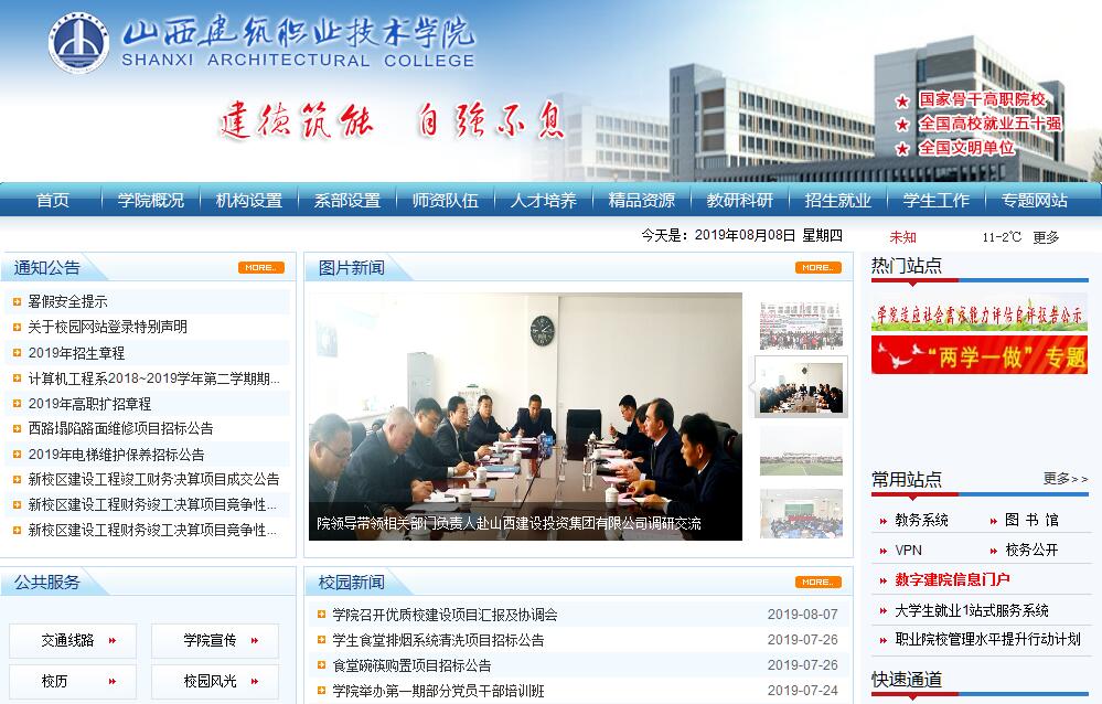 山西建筑職業(yè)技術(shù)學(xué)院是公辦全日制高等院校、國家示范性骨干高職院校,隸屬于山西省住房和城鄉(xiāng)建設(shè)廳。學(xué)院的前身是成立于1952年的山西省土木工程學(xué)校。1954年,學(xué)校更名為山西省建筑工程學(xué)校。2001年,經(jīng)山西省人民政府批準(zhǔn),學(xué)校升格為山西建筑職業(yè)技術(shù)學(xué)院。學(xué)院是教育部、建設(shè)部命名的建設(shè)行業(yè)領(lǐng)域技能型緊缺人才培養(yǎng)培訓(xùn)基地;教育部、財(cái)政部命名的建筑技術(shù)國家級職業(yè)教育實(shí)訓(xùn)基地;住房和城鄉(xiāng)建設(shè)職業(yè)教育教學(xué)指導(dǎo)委員會建筑設(shè)備類專業(yè)指導(dǎo)委員會主任委員單位;山西省職業(yè)教育專業(yè)教學(xué)指導(dǎo)委員會住房和城鄉(xiāng)建設(shè)、測繪類專業(yè)教學(xué)指導(dǎo)委員會主任委員單位;山西省建筑職業(yè)教育集團(tuán)牽頭學(xué)校。學(xué)院占地614畝,其中太原學(xué)府校區(qū)109畝,晉中榆次新校區(qū)505畝。教學(xué)儀器設(shè)備總值6556萬元;圖書館館藏紙質(zhì)圖書51萬冊(套),電子圖書2645GB。建有融專業(yè)教學(xué)、生產(chǎn)實(shí)訓(xùn)、職業(yè)培訓(xùn)、技能鑒定和技術(shù)服務(wù)于一體的校內(nèi)實(shí)訓(xùn)基地——建筑技術(shù)展示與實(shí)訓(xùn)中心,建筑面積26900㎡。學(xué)院設(shè)有建筑工程系、市政工程系、建筑與藝術(shù)系、機(jī)電工程系、設(shè)備工程系、工程管理系和計(jì)算機(jī)工程系等7個(gè)系29個(gè)專業(yè);實(shí)驗(yàn)實(shí)訓(xùn)教學(xué)部、思想政治理論教學(xué)部、基礎(chǔ)教學(xué)部、繼續(xù)教育部、培訓(xùn)部等5個(gè)教學(xué)部,共有全日制在校生9880人。設(shè)有哈爾濱工業(yè)大學(xué)現(xiàn)代遠(yuǎn)程學(xué)習(xí)中心和長安大學(xué)、沈陽建筑大學(xué)山西函授站及學(xué)院直屬函授站。同時(shí),設(shè)有山西省建設(shè)職業(yè)技能崗位資格鑒定站、山西省計(jì)算機(jī)等級考試點(diǎn)和全國公共英語等級考試點(diǎn)。現(xiàn)有專任教師348人,雙師素質(zhì)教師238人,具有教授、副教授等高級職稱教師110人。擁有國家教學(xué)名師(享受國家政府津貼)1人、山西省高職高專院校“雙師型”教學(xué)名師6人、“雙師型”優(yōu)秀教師20人、山西省學(xué)術(shù)帶頭人2人以及3個(gè)省級優(yōu)秀教學(xué)團(tuán)隊(duì)。50多名教師入選山西省建筑工程招標(biāo)投標(biāo)、工程系列技術(shù)職務(wù)評審等專家?guī)臁?80多名教師擁有國家一級注冊建造師、注冊結(jié)構(gòu)工程師、注冊監(jiān)理師等相關(guān)執(zhí)業(yè)資格。學(xué)院現(xiàn)有國家級教學(xué)改革試點(diǎn)專業(yè)2個(gè)、國家骨干院校重點(diǎn)建設(shè)專業(yè)6個(gè)、中央財(cái)政重點(diǎn)支持建設(shè)專業(yè)2個(gè)、與德國漢斯·賽德爾基金會合作培養(yǎng)技能型緊缺人才專業(yè)1個(gè)、山西省級教改專業(yè)3個(gè)、品牌專業(yè)2個(gè)、特色專業(yè)1個(gè)、重點(diǎn)建設(shè)專業(yè)4個(gè)和實(shí)訓(xùn)基地規(guī)劃項(xiàng)目4個(gè)。1門課程被評為國家精品資源共享課,2門課程被評為國家精品課程,6門課程被評為省級精品資源共享課,10門課程被評為省部級精品課程。學(xué)院教師主編、主審、參編的37本教材被評為“十二五”職業(yè)教育國家規(guī)劃教材。學(xué)院先后榮獲山西省高等學(xué)校教學(xué)成果一等獎3項(xiàng)、二等獎4項(xiàng),山西省科技進(jìn)步二等獎1項(xiàng)。生源以本省為主,并面向全國15個(gè)?。▍^(qū)、市)招生。省內(nèi)高考招生錄取最低分?jǐn)?shù)控制線連續(xù)數(shù)年高于三本。學(xué)院實(shí)行“工學(xué)交替,雙證融合”的人才培養(yǎng)模式。畢業(yè)生持“雙證書”達(dá)100%。辦學(xué)60年余來,學(xué)院為國家培養(yǎng)了8萬多名高素質(zhì)技術(shù)技能型人才。山西省建設(shè)行業(yè)項(xiàng)目經(jīng)理以上技術(shù)管理骨干大部分是我院校友。一大批畢業(yè)生擔(dān)任了城鄉(xiāng)規(guī)劃、勘察設(shè)計(jì)、建筑施工、建筑裝飾、房地產(chǎn)開發(fā)等企事業(yè)單位技術(shù)骨干和主要負(fù)責(zé)人。由我院畢業(yè)生主持的工程項(xiàng)目獲得魯班獎、汾水杯等50余項(xiàng)。校園文化健康向上。學(xué)生男子足球隊(duì)多次榮獲全省大學(xué)生足球賽專科組第一名。學(xué)生舞蹈《中國媽媽》和《親疙瘩樂開花》先后榮獲全國大學(xué)生藝術(shù)展演二等獎。此外,在全國和山西省各類職業(yè)技能大賽中,我院學(xué)生代表隊(duì)多次取得優(yōu)異成績,為學(xué)院爭得了榮譽(yù)。近年來,學(xué)院秉承“建德筑能,自強(qiáng)不息”的校訓(xùn),確立了“一二三四五”的辦學(xué)思路、“一二三四”的教學(xué)工作目標(biāo),各項(xiàng)事業(yè)取得了令人矚目的成績。學(xué)院被教育部評為全國普通高等學(xué)校畢業(yè)生就業(yè)工作先進(jìn)集體;1名教師被教育部評為國家級教學(xué)名師;被全國總工會評為“全國模范職工之家”;被團(tuán)中央評為“全國五四紅旗團(tuán)委”;被教育部、財(cái)政部確定為國家示范性骨干高職院校;被教育部評為全國高校就業(yè)50強(qiáng);被中央