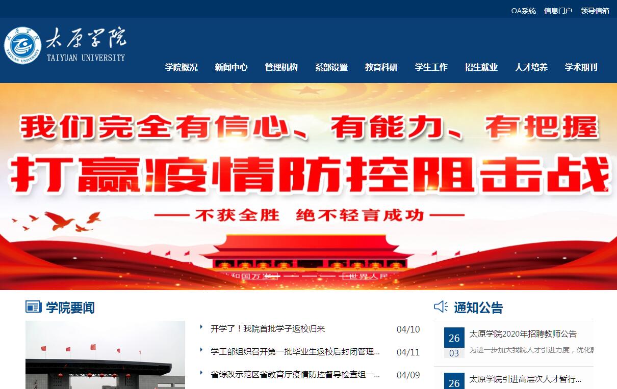 太原學(xué)院前身為1984年創(chuàng)建的太原大學(xué),2013年4月經(jīng)教育部批準(zhǔn),升格為全日制綜合類普通本科院校。2014年9月太原大學(xué)外語師范學(xué)院、太原大學(xué)教育學(xué)院撤銷原建制并入。學(xué)院由山西省人民政府領(lǐng)導(dǎo)、太原市人民政府管理、教學(xué)工作接受山西省教育廳指導(dǎo)。學(xué)院位于太原教育園區(qū)中央,與太原經(jīng)濟(jì)技術(shù)開發(fā)區(qū)、高新技術(shù)開發(fā)區(qū)、晉中工業(yè)區(qū)和武宿綜合保稅區(qū)、山西科技創(chuàng)新城相毗鄰,是太原市與晉中市“同城化”建設(shè)的交匯點(diǎn)和銜接帶,區(qū)位優(yōu)勢突出。學(xué)院基礎(chǔ)設(shè)施優(yōu)良,辦學(xué)條件優(yōu)越。學(xué)院新校區(qū)規(guī)劃用地1828畝,現(xiàn)總占地面積1308畝,由新校區(qū)、舊校區(qū)、北校區(qū)、中校區(qū)組成。校舍建筑面積34.06萬㎡,教學(xué)科研儀器設(shè)備總值7135.1萬元,館藏圖書125萬余冊。學(xué)院現(xiàn)有教師853人,其中享受國務(wù)院特殊津貼專家3名,教授28人,副高級(jí)專業(yè)技術(shù)職稱以上的教師271名,博士25人,碩士632人。現(xiàn)有20個(gè)系,2個(gè)教學(xué)部(思政部、大學(xué)英語教學(xué)部),2個(gè)教學(xué)中心(計(jì)算中心、公共實(shí)驗(yàn)中心),其中17個(gè)系承擔(dān)本科教學(xué)工作。學(xué)院現(xiàn)有66個(gè)專業(yè),本科專業(yè)28個(gè),??茖I(yè)38個(gè)(其中招生專業(yè)26個(gè)),涵蓋工學(xué)、理學(xué)、文學(xué)、經(jīng)濟(jì)學(xué)、管理學(xué)、藝術(shù)學(xué)、農(nóng)學(xué)等多個(gè)學(xué)科門類。學(xué)院面向全國20多個(gè)省、市、自治區(qū)招生,在校生人數(shù)14795名。學(xué)院秉承“博學(xué)、弘毅、力行、至善”的校訓(xùn)精神,以培養(yǎng)服務(wù)地方經(jīng)濟(jì)與社會(huì)發(fā)展的應(yīng)用型創(chuàng)新人才為目標(biāo),以服務(wù)城市發(fā)展、城市轉(zhuǎn)型、城市提升為契機(jī),積極深化學(xué)科專業(yè)建設(shè),持續(xù)推動(dòng)綜合教育改革,堅(jiān)持以就業(yè)為導(dǎo)向,以服務(wù)為宗旨,走產(chǎn)學(xué)研結(jié)合的道路。開拓創(chuàng)新,銳意進(jìn)取,在黨的建設(shè)、教育教學(xué)、科技研發(fā)、人才培養(yǎng)、科學(xué)管理等方面均取得顯著成績。學(xué)院重視加強(qiáng)對(duì)外交流,合作辦學(xué)形式日趨多樣?,F(xiàn)已與美國科羅拉多州立大學(xué)、加拿大菲莎河谷大學(xué)、臺(tái)灣義守大學(xué)等院校正式簽訂合作協(xié)議,在學(xué)生培養(yǎng)、師資交流、學(xué)術(shù)科研等方面開展廣泛的國際合作。未來太原學(xué)院將按照現(xiàn)代大學(xué)建設(shè)標(biāo)準(zhǔn),進(jìn)一步加強(qiáng)師資隊(duì)伍建設(shè)、學(xué)科專業(yè)建設(shè)和教學(xué)基礎(chǔ)設(shè)施建設(shè),努力提高教育質(zhì)量、科研水平和辦學(xué)效益,圍繞服務(wù)加快轉(zhuǎn)變經(jīng)濟(jì)發(fā)展方式這條主線,重點(diǎn)培養(yǎng)厚基礎(chǔ)、重應(yīng)用、強(qiáng)能力、高素質(zhì)的應(yīng)用型創(chuàng)新人才,辦出特色,辦出水平,為省、市經(jīng)濟(jì)建設(shè)和社會(huì)發(fā)展作出更大貢獻(xiàn)。
