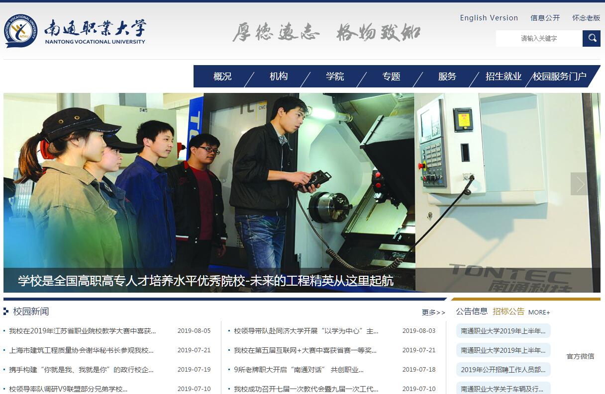 南通職業(yè)大學(xué)始建于1973年,坐落在江海交匯、緊鄰上海、物阜民安、人文薈萃的長(zhǎng)三角北翼中心城市——江蘇省南通市,是一所經(jīng)江蘇省人民政府批準(zhǔn)、教育部備案設(shè)置的綜合性全日制普通高校,是全國(guó)辦學(xué)歷史最長(zhǎng)的高等職業(yè)院校之一,是全國(guó)為數(shù)不多涵括學(xué)歷教育、技工教育、職業(yè)培訓(xùn)于一身的職業(yè)院校。學(xué)校面向江蘇、山西、山東、浙江、安徽、江西、河南、廣東、廣西、四川、貴州、云南、甘肅等13個(gè)省份招生,建有南通市區(qū)和海門兩大校區(qū),設(shè)有機(jī)械工程、電子信息工程、化學(xué)與生物工程、建筑工程、汽車與交通工程、藝術(shù)設(shè)計(jì)、經(jīng)濟(jì)管理、國(guó)際合作教育(外國(guó)語)、技師、海門、繼續(xù)教育等11個(gè)學(xué)院,校園總面積1000多畝,建筑面積40多萬平方米,現(xiàn)有教職工800多人、各級(jí)各類在校生近18000人。辦學(xué)四十多年來,學(xué)校秉承“厚德遠(yuǎn)志、格物致知”的校訓(xùn),遵循張謇先生“學(xué)必期于用、用必適于地”的教育思想,堅(jiān)持“根植南通、服務(wù)南通”的辦學(xué)思路,始終把立德樹人作為根本任務(wù),深入貫徹落實(shí)習(xí)近平新時(shí)代中國(guó)特色社會(huì)主義思想和黨的十九大精神,努力辦好人民滿意的高職教育,先后榮獲江蘇省先進(jìn)基層黨組織、江蘇省教育系統(tǒng)創(chuàng)先爭(zhēng)優(yōu)先進(jìn)集體、江蘇省高校思想政治教育工作先進(jìn)集體等稱號(hào)。學(xué)校是全國(guó)高職高專人才培養(yǎng)工作水平優(yōu)秀院校、江蘇省高水平高等職業(yè)院校建設(shè)單位、江蘇省示范性高職院校、江蘇省職業(yè)教育先進(jìn)集體、江蘇省文明單位、江蘇省高校和諧校園、江蘇省平安校園。學(xué)校是教育部首批現(xiàn)代學(xué)徒制試點(diǎn)單位,是教育部《職業(yè)院校管理水平提升行動(dòng)計(jì)劃》工作委員會(huì)主任單位、中國(guó)職教學(xué)會(huì)發(fā)展戰(zhàn)略研究工作委員會(huì)副會(huì)長(zhǎng)兼秘書長(zhǎng)單位。據(jù)中國(guó)教育大數(shù)據(jù)研究院報(bào)告顯示,2017年學(xué)校知名度、關(guān)注度、認(rèn)可度、美譽(yù)度位于高職院校全國(guó)第34位,江蘇第4位。學(xué)校積極探索現(xiàn)代職業(yè)教育體系建設(shè),與3所本科院校、7所中職學(xué)校分別合作開展專本“4+0”聯(lián)合培養(yǎng)、“3+2”分段培養(yǎng)和中高職“3+3”分段培養(yǎng),架立了中職、???、本科互聯(lián)互通,學(xué)歷教育與技工教育、職業(yè)培訓(xùn)交互并行的 “立交橋”。學(xué)校還是國(guó)家建設(shè)行業(yè)技能型緊缺人才培養(yǎng)基地、江蘇省產(chǎn)業(yè)人才培訓(xùn)示范基地、江蘇省高等教育人才培養(yǎng)模式創(chuàng)新實(shí)驗(yàn)基地。學(xué)生技能證書獲證率達(dá)到99.8%,計(jì)算機(jī)和英語考試通過率遙遙領(lǐng)先于全省平均水平,在挑戰(zhàn)杯、職業(yè)院校技能大賽、數(shù)學(xué)建模大賽、電子設(shè)計(jì)競(jìng)賽等各級(jí)各類賽事中成績(jī)優(yōu)異,畢業(yè)設(shè)計(jì)(論文)連續(xù)六年獲省一等獎(jiǎng)、評(píng)優(yōu)獲獎(jiǎng)率穩(wěn)居全省前列。學(xué)校專業(yè)建設(shè)精準(zhǔn)對(duì)接區(qū)域產(chǎn)業(yè)發(fā)展,形成了“以工為主,文、管、藝并舉”的專業(yè)格局,現(xiàn)有50多個(gè)專業(yè),其中國(guó)家級(jí)重點(diǎn)專業(yè)5個(gè)、省政府立項(xiàng)品牌專業(yè)1個(gè)、省高水平骨干立項(xiàng)專業(yè)4個(gè)、省重點(diǎn)專業(yè)群4個(gè),省品牌(特色)專業(yè)9個(gè)、省示范建設(shè)重點(diǎn)專業(yè)(群)4個(gè)。學(xué)?,F(xiàn)擁有國(guó)家級(jí)職業(yè)教育專業(yè)教學(xué)資源庫1個(gè)、國(guó)家級(jí)精品課程2門、國(guó)家級(jí)精品資源共享課程2門、省級(jí)精品課程10門,“十二五”國(guó)家規(guī)劃教材7部、省級(jí)精品(重點(diǎn))教材26部,國(guó)家級(jí)實(shí)訓(xùn)基地4個(gè)、省級(jí)實(shí)驗(yàn)教學(xué)示范中心1個(gè);國(guó)家級(jí)教學(xué)成果一等獎(jiǎng)1項(xiàng),省級(jí)教學(xué)成果特等獎(jiǎng)1項(xiàng)、一等獎(jiǎng)3項(xiàng)、二等獎(jiǎng)6項(xiàng)。學(xué)校大力實(shí)施“人才強(qiáng)?!睉?zhàn)略,著力推進(jìn)教授、博士“雙百工程”,建有一支高素質(zhì)的“雙師型”教師隊(duì)伍,現(xiàn)有專任教師511名,其中正、副教授比例達(dá)到51.58%,青年教師中碩、博士研究生比例達(dá)到83.73%,“雙師”素質(zhì)教師占88.93%?,F(xiàn)有全國(guó)優(yōu)秀教育工作者3人;全國(guó)五一勞模獎(jiǎng)?wù)芦@得者1人、全國(guó)技術(shù)能手1人、國(guó)務(wù)院特殊津貼專家1人、省級(jí)優(yōu)秀教學(xué)團(tuán)隊(duì)3支、省產(chǎn)業(yè)教授3人、省級(jí)教學(xué)名師3人、省有突出貢獻(xiàn)的中青年專家1人、江蘇工匠1人、省“333工程”培養(yǎng)對(duì)象11人、省“青藍(lán)工程”中青年學(xué)術(shù)帶頭人和優(yōu)秀青年骨干教師培養(yǎng)對(duì)象26人。學(xué)校開創(chuàng)性提出了“專業(yè)與產(chǎn)業(yè)、課程與崗位、課堂與車間、科研與生產(chǎn)、實(shí)習(xí)與就業(yè)、培訓(