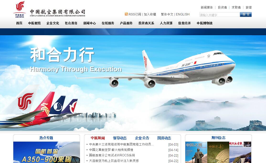 中國航空集團公司(以下簡稱中航集團)是以中國唯一載國旗飛行的航空運輸企業(yè)—中國國際航空公司為主體,聯(lián)合中國航空總公司、中國西南航空公司等企業(yè),組建的特大型國有航空運輸集團公司。2002年10月11日正式成立。經(jīng)營范圍:經(jīng)營集團公司及其投資企業(yè)中由國家投資形成的全部國有資產(chǎn)和國有股權;飛機租賃;航空器材及設備的維修。注冊資本100.28億元。中航集團成立后,航空運輸主業(yè)實現(xiàn)了一體化運營,在香港、倫敦和上海成功上市;通過資產(chǎn)重組將非航空業(yè)務整合為基本建設及酒店物業(yè)管理、資產(chǎn)管理、金融服務、民航快遞和傳媒廣告等專業(yè)公司。經(jīng)營業(yè)務涵蓋航空客運、航空貨運及物流兩大核心產(chǎn)業(yè),涉及飛機維修、航空配餐、航空貨站、地面服務、機場服務、航空傳媒等高相關產(chǎn)業(yè),以及金融服務、航空旅游、工程建設、信息網(wǎng)絡等延伸服務產(chǎn)業(yè)。目前,本部設有辦公廳、規(guī)劃發(fā)展部、人力資源部、財務部、法律監(jiān)管部(內部風險控制部)、航空安全辦公室、審計監(jiān)察部(紀檢辦公室)、黨組辦公室共8個部門。所屬二級公司有中國國際航空股份有限公司、中國航空(集團)有限公司、中翼航空投資有限公司、中國航空集團建設開發(fā)有限公司、中國航空資本控股有限責任公司、民航快遞有限責任公司和中國航空傳媒有限責任公司。截至2015年底,從業(yè)人員近9萬人,總資產(chǎn)2265億元。總部辦公地址:北京市朝陽區(qū)霄云路36號國航大廈。