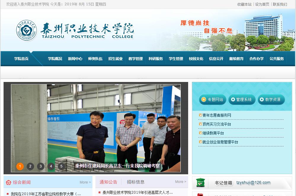 泰州職業(yè)技術學院坐落在泰州市國家級醫(yī)藥高新區(qū)——中國醫(yī)藥城,是1998年3月經原國家教委批準建立 的公辦普通高校,也是江蘇省第一所冠以“職業(yè)技術學院”名稱的院校。辦學歷史近60年,為江蘇省文明校園、江蘇省高等學校和諧校園、江蘇省園林式學校、教育部人才培養(yǎng)工作水平評估“優(yōu)秀”等級院校,江蘇省示范性高職院校建設單位。學院占地面積1060畝,規(guī)劃總建筑面積33萬平方米,一期完成建筑面積27.5萬平方米,是全國一流的現(xiàn)代化高職校園、生態(tài)校園、智慧校園。學院設有機電技術學院、醫(yī)學技術學院、經濟與管理學院、信息技術學院、藥學院、建筑工程學院、藝術學院和基礎科學部、思政理論教學部等7院2部,開設專業(yè)35個。 現(xiàn)有教職員工670人,其中教授、副教授職稱的187人。全日制各類在校生近10000人。學院始終堅持服務地方發(fā)展的辦學傳統(tǒng),緊貼江蘇及泰州區(qū)域經濟和社會發(fā)展對人才的需求,深化教育教學改革,做強專業(yè)。藥物制劑技術、建筑工程技術專業(yè)為國家重點建設專業(yè),機電裝備制造技術、醫(yī)藥服務、電子信息等3個專業(yè)群為省級重點建設專業(yè)群,護理、建筑工程技術、建筑裝飾工程技術、計算機應用技術、機電一體化技術等5個專業(yè)為省級特色專業(yè)。學院建有國家級護理實訓中心、國家級計算機應用技術實訓基地,3個省級實訓基地,各類專業(yè)實驗、實訓室111個,與企事業(yè)單位共建學生實習就業(yè)基地233家。建有江蘇省數(shù)控機床工程技術研發(fā)中心等7個省、市級工程技術研究中心。設有國家職業(yè)技能鑒定所,能開展30余項職業(yè)技能培訓和鑒定。學院秉承“厚德尙技 自強不息”的校訓,以提高學生職業(yè)能力和素質為核心,鼓勵學生個性發(fā)展、促進學生全面發(fā)展,努力培養(yǎng)具有 創(chuàng)新精神和實踐能力的高素質技術技能人才。近年來,畢業(yè)生當年就業(yè)率始終保持在98%以上,畢業(yè)生用人單位滿意度均在95%以上,學院連續(xù)4次(8年) 被評為江蘇省高校畢業(yè)生就業(yè)工作先進集體。在新的歷史時期,學院將堅持 “服務好地方,發(fā)展好學院,關心好師生” 的辦學理念,根據現(xiàn)代職業(yè)教育體系發(fā)展方向,圍繞地方高素質技術技能人才培養(yǎng)中心、中小企業(yè)技術服務 中心、繼續(xù)教育學習中心、先進文化傳播中心和地方黨委政府決策智力支持中心的辦學定位,努力把學院建設成為國內有影響、省內有地位的開放型、創(chuàng)新型的高職院校。