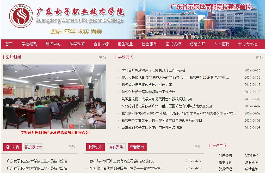 廣東女子職業(yè)技術學院是經廣東省人民政府批準成立的華南地區(qū)唯一一所公辦女子高校。學校至今有近40年的辦學歷史,其前身是1981年由廣東省婦聯(lián)創(chuàng)辦的廣東省婦女干部學校和1992年成立的廣東女子中等專業(yè)學校,2001年升格為廣東女子職業(yè)技術學院。2013年11月,學校被確定為省級示范性高職院校建設單位。2015年12月,學校被認定為廣東省依法治校示范校。2016年,學校被評為第三批廣東省大學生創(chuàng)新創(chuàng)業(yè)教育示范學校和全國第二批職業(yè)院校數(shù)字校園建設實驗校。2017年,學校被確定為廣東省高職院校文化素質教育建設基地。2018年,學校被評為2015-2017年度廣東省安全文明校園。學校主校區(qū)位于廣州市番禺區(qū),毗鄰廣州亞運城,校園環(huán)境幽雅,辦學條件優(yōu)良,教學設施完善。校內建有136個校內實訓室,17個實訓基地,209個校外實習實訓基地,圖書館藏書50多萬冊。學?,F(xiàn)有在校生6000余人,設有應用設計學院、管理學院、經貿學院、文化藝術學院和應用外語學院(國際交流學院)等五個全日制二級學院,另設有馬克思主義學院、體育教學部、繼續(xù)教育學院、創(chuàng)業(yè)學院,以及三個教育研究中心(所),開設專業(yè)近30個。學校擁有一支專業(yè)、學歷、職稱、年齡結構合理,教學和科研能力強的教師隊伍?,F(xiàn)有教職工400余人,其中專任教師247名;聘請國家級、省級行業(yè)大師2名,省級高層次技能型企業(yè)兼職教師36名。校內專任教師中,具有雙師素質的占83%,具有高級職稱的占39.27%,已取得碩士以上學位的占75.3%。各專業(yè)都有一批年富力強的教學骨干和學術帶頭人,并聘請校外的專家、企業(yè)家和業(yè)內有豐富實踐經驗的專業(yè)人士擔任專業(yè)指導委員會委員。2012年12月,學校聯(lián)合近百家政府機構、行業(yè)、企業(yè)、研究機構、社會組織和高等院校、中職學校,牽頭打造了我國首個女性職業(yè)教育集團——廣東女性職業(yè)教育集團,形成了政、行、校、企多方聯(lián)動的辦學體制和運行機制。2016年3月,學校又牽頭成立廣東巾幗創(chuàng)新創(chuàng)業(yè)聯(lián)盟,并籌劃將學校海珠校區(qū)建設成省級區(qū)域性、特色性“創(chuàng)業(yè)孵化基地”。學校還與港澳地區(qū)及日、美、德、澳等國多個高校和婦女組織建立了友好合作關系,與廣東省多所知名大學合作舉辦本科班。學校以“立德樹人”為根本任務,以培養(yǎng)具有高尚品德、高雅氣質和高新技能的創(chuàng)新性女性技術技能人才為目標,發(fā)揮性別優(yōu)勢,創(chuàng)建女校品牌,形成以女性高等職業(yè)教育為主,大力發(fā)展婦女干部教育、婦女技能培訓、婦女創(chuàng)新創(chuàng)業(yè)教育,服務女性終身教育的多形式的辦學格局。畢業(yè)生深受用人單位青睞,就業(yè)率歷年保持在98%以上。第三方機構獨立調查顯示,畢業(yè)生對母校的滿意度達98%以上,遠高于全國同類院校平均水平。建校以來,學校在開發(fā)女性潛能、促進女性就業(yè)、探索女性特色教育、推進男女兩性和諧發(fā)展等方面做出了積極貢獻,曾先后獲得“廣東省文明單位”、“文明校園”、“連續(xù)十年文明單位”等光榮稱號。各級領導對女院給予親切關懷,張德江、汪洋、陳慕華、彭珮云、顧秀蓮等黨和國家領導人,朱小丹、盧瑞華、張幗英、李鴻忠、劉玉浦、林少春、溫蘭子、雷于藍等省領導曾多次蒞臨學校視察,對學校辦學給予高度評價并寄予殷切期望。