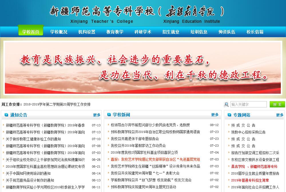 新疆師范高等??茖W(xué)校(新疆教育學(xué)院)是一所專門為新疆培養(yǎng)學(xué)前師資、基礎(chǔ)教育師資和雙語師資的師范院校,被譽為“新疆中小學(xué)教師的搖籃”。學(xué)校是全國民族團結(jié)進步先進集體、全國文明單位。新疆師范高等??茖W(xué)校(新疆教育學(xué)院)是一所具有百年歷史和深厚文化底蘊的師范院校,其前身是創(chuàng)辦于1906年的新疆師范學(xué)堂,1934年更名為省立迪化師范學(xué)校,1954年更名為烏魯木齊第一師范學(xué)校,1978年升格為新疆教育學(xué)院。1989年,新疆廣播電視師范大學(xué)并入新疆教育學(xué)院。2003年,新疆工業(yè)技術(shù)學(xué)校并入新疆教育學(xué)院。2012年,成立新疆師范高等??茖W(xué)校,與新疆教育學(xué)院實行“一套機構(gòu),兩塊牌子”。2012年12月,新疆幼兒師范學(xué)校并入新疆師范高等??茖W(xué)校(新疆教育學(xué)院)。學(xué)校現(xiàn)有四個校區(qū),占地795畝。教職工836人,專任教師553人。專任教師中,具有高級專業(yè)技術(shù)職務(wù)143人(正高專業(yè)技術(shù)職務(wù)18人),高級專業(yè)技術(shù)職務(wù)的教師占專任教師總數(shù)的34.1%;具有研究生學(xué)位教師233人,占專任教師總數(shù)的55.6%?,F(xiàn)有在校生9347人,其中普通??粕?546人?,F(xiàn)有專業(yè)48個,涵蓋教育學(xué)、文學(xué)、藝術(shù)學(xué)、管理學(xué)、理學(xué)、工學(xué)、法學(xué)、經(jīng)濟學(xué)等學(xué)科門類。設(shè)有雙語學(xué)院、教育科學(xué)學(xué)院等15個學(xué)院(部)。學(xué)校不斷強化教學(xué)工作中心地位,大力推進教育教學(xué)改革,創(chuàng)新人才培養(yǎng)模式,重視實踐教學(xué)環(huán)節(jié)。近年來,學(xué)校已建成校級精品課程30門、校級特色專業(yè)16門、自治區(qū)級精品課程5門、自治區(qū)特色專業(yè)2個、自治區(qū)重點實驗室1個、國家精品視頻課1門、自治區(qū)提升專業(yè)服務(wù)社會能力項目1項。擁有一批相對固定的校內(nèi)外實習(xí)實訓(xùn)基地。學(xué)校高度重視學(xué)生應(yīng)用能力和創(chuàng)新精神的培養(yǎng)。近年來,學(xué)生先后在“創(chuàng)青春”全國大學(xué)生創(chuàng)業(yè)大賽、“挑戰(zhàn)杯”全國大學(xué)生課外學(xué)術(shù)科技作品新疆區(qū)競賽、全國信息技術(shù)應(yīng)用水平大賽、全國職業(yè)院校技能大賽、全國高職高專英語課堂教學(xué)大賽、全國大學(xué)生創(chuàng)業(yè)計劃競賽、全國大學(xué)英語教學(xué)大賽、全國高校微課教學(xué)比賽、全國大學(xué)生健美操藝術(shù)體操錦標賽以及新疆雙語教學(xué)基本功大賽、自治區(qū)大學(xué)生田徑運動會、自治區(qū)大學(xué)生排球賽、自治區(qū)大中學(xué)生武術(shù)比賽等全國、自治區(qū)重要賽事中獲得優(yōu)異成績。學(xué)校重視科研工作。“十二五”期間, 學(xué)校共獲得省部級以上科研課題129項,出版專著、譯著21部,發(fā)表論文1032篇,其中核心期刊133篇?!缎陆逃龑W(xué)院學(xué)報(漢文版)》入選“全國高校優(yōu)秀社科期刊”,其中“雙語欄目”被評為“全國高校社科特色欄目”。擁有“新疆雙語教育研究中心”、“學(xué)前教育研究中心”、“小學(xué)教育研究中心”。學(xué)校專門設(shè)置“基礎(chǔ)教育研究所”,自治區(qū)宣傳部社科辦“新疆社科基金項目成果轉(zhuǎn)化與推廣中心”等14個自治區(qū)級、校級研究機構(gòu)和科研實體。學(xué)校擁有固定資產(chǎn)4.62億元,教學(xué)儀器設(shè)備值5884萬元,圖書69萬冊。擁有萬兆校園網(wǎng)(聯(lián)網(wǎng)計算機6000余臺)、多媒體教室、語音室、電子閱覽室、專業(yè)實驗室等公共服務(wù)體系,數(shù)字資源總量6TB。學(xué)校是新疆學(xué)前教師、中小學(xué)教師、雙語教師和教育管理干部人才培訓(xùn)的基地和中心。新疆雙語培訓(xùn)基地、新疆中小學(xué)教師繼續(xù)教育中心、新疆教育行政管理干部培訓(xùn)中心、新疆學(xué)前教育研究中心、新疆中小學(xué)德育研究中心、新疆中小學(xué)教師計算機培訓(xùn)考核中心、新疆中小學(xué)雙語教材研究中心、新疆雙語教學(xué)質(zhì)量監(jiān)測評價中心均掛靠我校。長期以來,學(xué)校充分發(fā)揮培訓(xùn)基地的作用,為新疆培訓(xùn)了大批德才兼?zhèn)涞膬?yōu)秀人才。“國培計劃”、中小學(xué)校長“十百千”工程、一年制、兩年制中小學(xué)教師國家通用語言達標培訓(xùn)及中小學(xué)教師專業(yè)技能提高培訓(xùn)等已經(jīng)成為學(xué)校的品牌培訓(xùn)項目。今天的新疆師范高等??茖W(xué)校(新疆教育學(xué)院)站在了新的起點上。維護新疆社會穩(wěn)定和長治久安的新常態(tài),中央新疆工作座談會精神的貫徹落實,國家“一帶一路”戰(zhàn)略的推行,使新疆經(jīng)濟社會進入了新的發(fā)展時期,新疆教育事業(yè)發(fā)展的前景更加美好。面向未來,學(xué)校以建立教師教育、語言教育特色鮮明的院校為目標,立足新疆,面向絲綢之路沿線國家,致力于將學(xué)校建設(shè)成為區(qū)內(nèi)學(xué)前教師、小學(xué)教師、雙語教師和語言類人才培養(yǎng)培訓(xùn)和研究的重要基地。