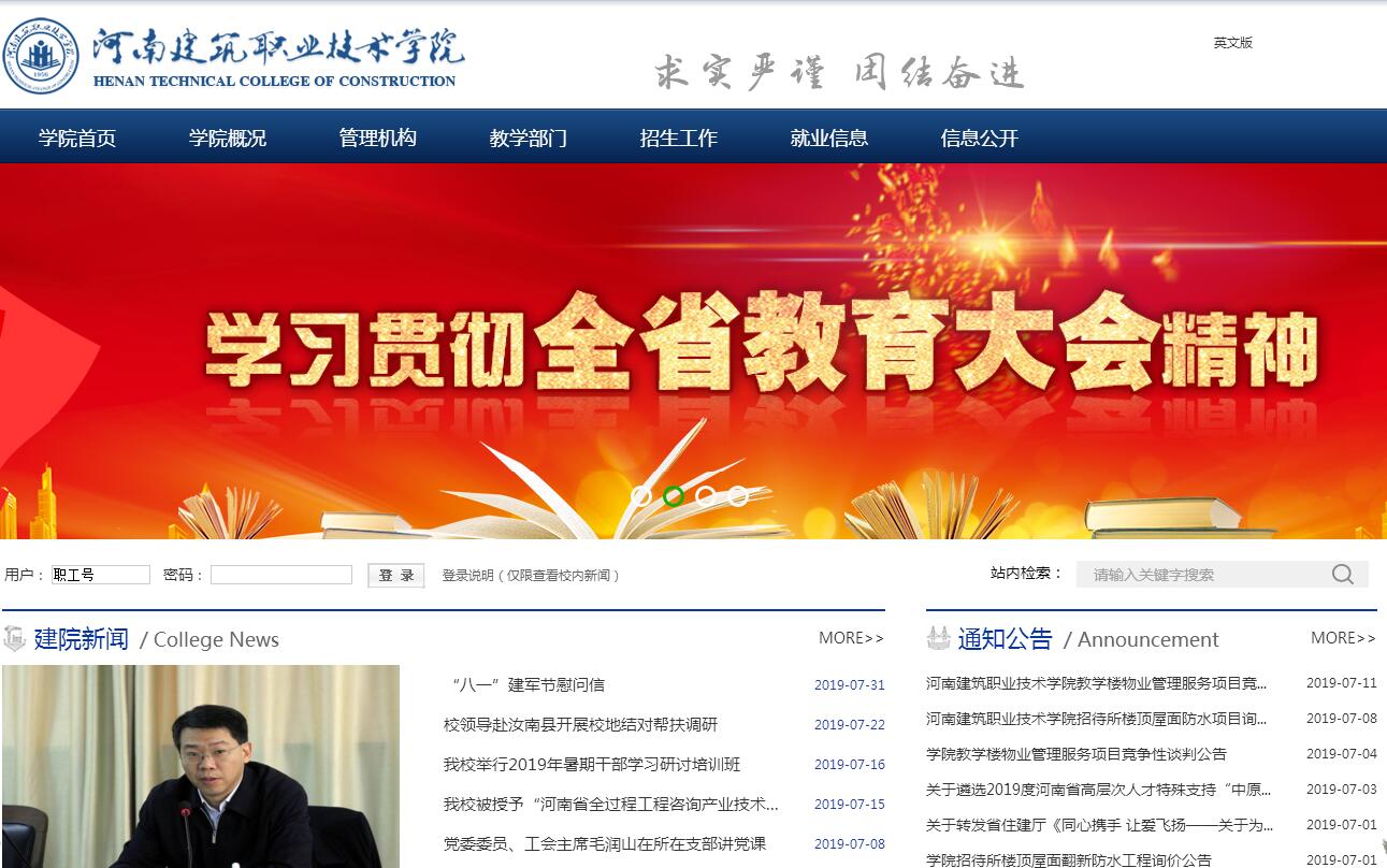 河南建筑職業(yè)技術(shù)學(xué)院(以下簡稱河南建院)成立于1956年,占地600余畝,教職工663人,在校生14000余人,是河南省住房和城鄉(xiāng)建設(shè)廳直屬的全省唯一一所建筑類高等職業(yè)院校,是河南省職業(yè)教育品牌示范院校、國家中等職業(yè)教育改革發(fā)展示范學(xué)校、河南省語言文字規(guī)范化示范學(xué)校、河南省依法治校示范校、河南省現(xiàn)代學(xué)徒制省級試點(diǎn)院校、河南省民族團(tuán)結(jié)進(jìn)步創(chuàng)建示范單位,是河南省建設(shè)行業(yè)職業(yè)教育校企合作指導(dǎo)委員會秘書長單位和河南省建筑職教集團(tuán)理事長單位,連續(xù)兩年獲得河南省住房和城鄉(xiāng)建設(shè)廳“五好”黨委、先進(jìn)單位等榮譽(yù)稱號,榮獲省教育廳創(chuàng)新創(chuàng)業(yè)優(yōu)秀單位、畢業(yè)生就業(yè)創(chuàng)業(yè)工作先進(jìn)單位等多項榮譽(yù)稱號,連續(xù)兩年在全省教育系統(tǒng)“兩創(chuàng)兩爭”群眾性精神文明創(chuàng)建活動中獲多個獎項,連續(xù)三年在河南日報集團(tuán)組織開展的全省高校社會評議中榮獲“河南高等教育就業(yè)質(zhì)量最佳示范院?!睒s譽(yù)稱號,形成了“求實(shí)嚴(yán)謹(jǐn),團(tuán)結(jié)奮進(jìn)”的校風(fēng)。河南建院人才培養(yǎng)定位和方向是建設(shè)行業(yè)高素質(zhì)高技能型專業(yè)人才,城市建設(shè)和管理的高素質(zhì)實(shí)用型人才。61年的發(fā)展過程中,學(xué)校向省內(nèi)外建設(shè)行業(yè)和各行各業(yè)的建設(shè)領(lǐng)域輸送了成千上萬的優(yōu)秀人才,成就了一大批建設(shè)決策管理者和大型建筑企業(yè)的領(lǐng)軍人物,有些畢業(yè)生已經(jīng)成為各級黨委政府和黨政部門的主要領(lǐng)導(dǎo)。在河南省住房和城鄉(xiāng)建設(shè)廳的行業(yè)管理和指導(dǎo)下,學(xué)校與省內(nèi)外建設(shè)規(guī)劃、勘察設(shè)計、工程施工與管理、市政工程建設(shè)與管理及各行各業(yè)的建設(shè)與管理部門和企業(yè)建立了廣泛的聯(lián)系,為學(xué)生的學(xué)習(xí)、就業(yè)和發(fā)展?fàn)I造了良好的專業(yè)氛圍,打下了堅實(shí)的社會基礎(chǔ),開辟了廣闊的發(fā)展空間。學(xué)校設(shè)有土木工程系、建筑系、工程管理系、設(shè)備工程系、建設(shè)信息工程系等8個教學(xué)系(部),開設(shè)有42個專業(yè),已建成建筑工程技術(shù)、工程造價、建筑裝飾工程技術(shù)3個省級特色專業(yè),建筑工程技術(shù)、工程造價、建筑裝飾工程技術(shù)、樓宇智能化工程技術(shù)、市政工程技術(shù)等5個河南省專業(yè)綜合改革試點(diǎn),省教育廳批準(zhǔn)成立了建筑工程施工專業(yè)秦繼英工作室、工程造價專業(yè)王輝工作室兩個技能名師工作室。專業(yè)建設(shè)上既強(qiáng)調(diào)按照各個專業(yè)的規(guī)律打造專業(yè)特色,又強(qiáng)調(diào)以專業(yè)群建設(shè)為重點(diǎn)加強(qiáng)各個專業(yè)之間的聯(lián)系和貫通培養(yǎng)。同時,充分滿足建筑產(chǎn)業(yè)專業(yè)化分工的需要,開設(shè)有穩(wěn)定的市場定向需求的特色專業(yè)。學(xué)?,F(xiàn)有全日制在校生1.4萬余人,已經(jīng)成為中職、高職和應(yīng)用本科貫通培養(yǎng),學(xué)歷教育、繼續(xù)教育和社會培訓(xùn)于一體的建筑職業(yè)教育基地。學(xué)校擁有一支高素質(zhì)師資隊伍,現(xiàn)有教職工663人,其中專任教師465人,高級職稱教師84人,國家住房城鄉(xiāng)建設(shè)部專業(yè)指導(dǎo)委員會委員6人,省級職業(yè)教育教學(xué)專家4人,省級學(xué)術(shù)技術(shù)帶頭人17人,省教學(xué)名師1人,具有國家注冊建筑師、注冊結(jié)構(gòu)工程師、注冊建造師、注冊造價師、注冊設(shè)備工程師等資格雙師素質(zhì)教師300余人。學(xué)校教學(xué)實(shí)踐條件優(yōu)越,校區(qū)占地600余畝,建筑面積30余萬平方米,其中實(shí)驗實(shí)訓(xùn)場地3.9萬平方米。圖書館藏書55萬冊,中外文期刊720種,實(shí)現(xiàn)了校園無線網(wǎng)絡(luò)全覆蓋。建有85個校內(nèi)實(shí)驗、實(shí)訓(xùn)場所。校屬建筑規(guī)劃設(shè)計室、建筑工程質(zhì)量檢測站、國家職業(yè)技能鑒定站、物業(yè)公司等科研生產(chǎn)機(jī)構(gòu)、社會服務(wù)機(jī)構(gòu)及126個穩(wěn)定的校外實(shí)習(xí)實(shí)訓(xùn)基地,合作企業(yè)達(dá)116家,為學(xué)生的實(shí)驗、實(shí)習(xí)、技能培訓(xùn)和各種社會實(shí)踐活動開辟了廣闊舞臺。學(xué)校與省內(nèi)外數(shù)百家用人單位建立了長期穩(wěn)定的校企合作關(guān)系,就業(yè)率連年保持在95%以上?!案哔|(zhì)量、高就業(yè)、高成才”已成為學(xué)院人才培養(yǎng)的響亮品牌。學(xué)校貫徹落實(shí)中央和省委城市工作會議精神,在推進(jìn)新型城鎮(zhèn)化進(jìn)程和建筑業(yè)轉(zhuǎn)型升級中,積極服務(wù)于全省建設(shè)行業(yè)的規(guī)劃、建設(shè)、管理工作,服務(wù)于百城建設(shè)提質(zhì)工程等重點(diǎn)工作,培養(yǎng)建設(shè)行業(yè)高素質(zhì)高技能型專業(yè)人才、城市建設(shè)和管理的高素質(zhì)實(shí)用型人才,成為集學(xué)歷教育、繼續(xù)教育、社會培訓(xùn)于一體的建設(shè)類職業(yè)教育基地,全省建設(shè)行業(yè)一線技術(shù)技能人才培養(