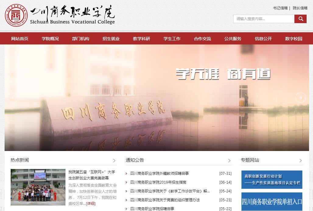 四川商務(wù)職業(yè)學(xué)院是經(jīng)省人民政府批準(zhǔn)成立、經(jīng)國家教育部備案、直屬省商務(wù)廳的公辦全日制普通高等學(xué)校,是一所集內(nèi)外貿(mào)于一體的財(cái)經(jīng)類商科高等院校,是四川省重要的現(xiàn)代商務(wù)高素質(zhì)高技能人才培養(yǎng)培訓(xùn)基地。學(xué)院現(xiàn)有成都市青羊區(qū)文家場正街文家校區(qū)及溫江區(qū)和盛鎮(zhèn)和盛校區(qū)兩個(gè)校區(qū),,總占地面積580余畝。學(xué)院設(shè)有六系兩部兩中心,全日制在校學(xué)生8838人,教師總數(shù)478人,其中具有正高職稱12人。學(xué)院前身為成都女子蠶桑傳習(xí)所,創(chuàng)建于1907年(清光緒33年),先后更名為四川省立女子實(shí)業(yè)講習(xí)所、四川省立高等職業(yè)學(xué)校、四川省立成都女子職業(yè)學(xué)校、四川省成都商業(yè)學(xué)校等。1993年更名為四川省商業(yè)學(xué)校。2004年經(jīng)四川省人民政府批準(zhǔn),四川省商業(yè)學(xué)校(國家級重點(diǎn)中專)與四川省對外經(jīng)濟(jì)貿(mào)易學(xué)校(省部級重點(diǎn)中專)合并組建四川商務(wù)職業(yè)學(xué)院。2010年順利通過教育部高職高專人才培養(yǎng)工作評估。學(xué)院目前現(xiàn)有的29個(gè)專業(yè),形成“經(jīng)濟(jì)貿(mào)易”、“市場營銷”、“財(cái)務(wù)會計(jì)”、“電商物流”、“旅游服務(wù)”、“電子信息”、“藝術(shù)設(shè)計(jì)”等七大專業(yè)板塊,逐步完成以國際貿(mào)易實(shí)務(wù)、連鎖經(jīng)營管理兩個(gè)央財(cái)支持專業(yè)為龍頭,以市場營銷、電子商務(wù)兩個(gè)省級在建重點(diǎn)專業(yè)為支撐,方向明確、商科特色突出的專業(yè)群建設(shè),形成以商科類和現(xiàn)代服務(wù)業(yè)類專業(yè)為主干的具有現(xiàn)代商科特色的專業(yè)體系。學(xué)院堅(jiān)持立足商務(wù)、面向現(xiàn)代服務(wù)業(yè),遵循“從市場需求出發(fā),按高職規(guī)律辦學(xué),為學(xué)生成才服務(wù)”的辦學(xué)理念,堅(jiān)持“立足區(qū)域經(jīng)濟(jì),面向現(xiàn)代商務(wù),堅(jiān)持內(nèi)涵發(fā)展,提高育人質(zhì)量,彰顯辦學(xué)特色”的辦學(xué)方針,秉承“誠信 睿智 篤行 思競”的精神,適應(yīng)商務(wù)經(jīng)濟(jì)新常態(tài)的要求,順應(yīng)現(xiàn)代職業(yè)教育體系的潮流,參照辦優(yōu)質(zhì)高職院校的標(biāo)準(zhǔn),以“從嚴(yán)治黨,依法治校”為主線,以“雙主體、五對接”為導(dǎo)向,以創(chuàng)新商科應(yīng)用型人才培養(yǎng)模式、提高人才培養(yǎng)質(zhì)量為根本,以提升學(xué)生創(chuàng)新創(chuàng)業(yè)能力與就業(yè)品質(zhì)為著力點(diǎn),為區(qū)域經(jīng)濟(jì)與社會發(fā)展培養(yǎng)培訓(xùn)一線高素質(zhì)技能型開放式的商務(wù)經(jīng)濟(jì)應(yīng)用型人才,把學(xué)院辦成服務(wù)四川區(qū)域經(jīng)濟(jì)并輻射西部的商務(wù)經(jīng)濟(jì)應(yīng)用型人才培養(yǎng)培訓(xùn)高地。學(xué)院始終堅(jiān)持以就業(yè)為導(dǎo)向,把就業(yè)工作作為學(xué)院發(fā)展的第一要?jiǎng)?wù),努力保障畢業(yè)生充分就業(yè)。大力推進(jìn)“雙證書”、“多證制”,提高學(xué)生就業(yè)競爭力,不斷加強(qiáng)畢業(yè)生全過程指導(dǎo)與就業(yè)服務(wù),指導(dǎo)樹立正確的擇業(yè)觀和就業(yè)觀,做好職業(yè)生涯規(guī)劃,努力開辟就業(yè)渠道,加強(qiáng)就業(yè)基地建設(shè),健全就業(yè)網(wǎng)絡(luò),開展頂崗實(shí)習(xí)。先后與惠普公司、海爾集團(tuán),娃哈哈集團(tuán)有限公司,蘇寧電器股份有限公司,京東集團(tuán),百度公司,頂新國際集團(tuán),四川互惠商業(yè)集團(tuán)公司、陽光保險(xiǎn)集團(tuán)、凱賓斯基酒店、成都廊橋餐飲文化有限發(fā)展公司,艾民兒皮革品有限責(zé)任公司等200多家企業(yè)建立了合作關(guān)系。學(xué)院2011屆畢業(yè)生就業(yè)率為97.32%;2012屆畢業(yè)生就業(yè)率為97.76%;2013屆畢業(yè)生就業(yè)率為98.06%;2014屆畢業(yè)生就業(yè)率為98.06%,2015屆畢業(yè)生就業(yè)率為97.05%;名列全省高校前列。2012年學(xué)院被省教育廳評為“畢業(yè)生就業(yè)工作先進(jìn)單位”。