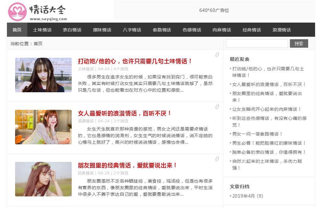 | 網(wǎng)站簡介: 情話大全網(wǎng)(sayqing.com)分享土味情話,表白情話,撩妹情話,八字情話,肉麻情話,傷感情話,英文情話,經(jīng)典情話,浪漫情話,套路情話等各類情話,情話寶典幫助你的愛情更上一層樓! |