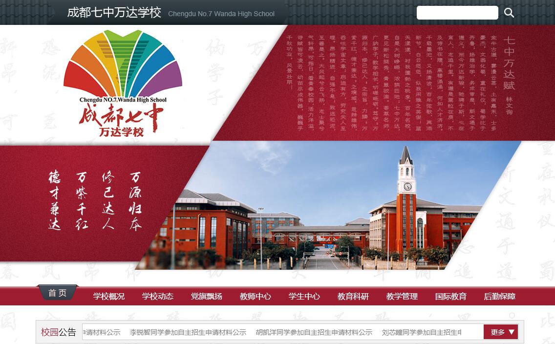 成都七中萬達(dá)學(xué)校是2011年由萬達(dá)集團(tuán)與金牛區(qū)政府共同出資興建、金牛區(qū)政府舉辦、成都七中領(lǐng)辦的寄宿制公辦高完中。學(xué)校以“萬源歸本、修己達(dá)人”為辦學(xué)宗旨,以“萬紫千紅、德才兼達(dá)”為育人理念,以“身心雄健、情感豐滿、精神高貴、智慧卓越”為培養(yǎng)目標(biāo);著力踐行“讓每一個(gè)生命綻放最精彩的自己”的教育追求;努力辦成成都市質(zhì)量排頭兵、創(chuàng)新示范校。2014年成都七中萬達(dá)學(xué)校首屆學(xué)子參加中高考,成績優(yōu)異。高考各項(xiàng)重要指標(biāo)僅次于“四七九”等老牌名校,位列全市重點(diǎn)中學(xué)第五。金牛區(qū)理科前十名獨(dú)攬7席,文科前十名享有4席,區(qū)理科狀元、榜眼也花落七中萬達(dá)。多名學(xué)子走向國內(nèi)外著名學(xué)府,陳識遠(yuǎn)同學(xué)被北京大學(xué)法學(xué)院錄取。取得我校最高分(650分)的張曉怡同學(xué),入校時(shí)中考成績?yōu)槌啥际?000多名,三年后高考成績位居四川省262名。首屆初三中考重點(diǎn)率為61.3%。學(xué)校完美實(shí)現(xiàn)“省重第一,追趕前三”的高中教學(xué)質(zhì)量目標(biāo)和“金牛第一,完中領(lǐng)先”的初中教學(xué)質(zhì)量目標(biāo),兌現(xiàn)了“讓優(yōu)秀者更優(yōu)秀,平凡者不平凡”的鄭重承諾。學(xué)?,F(xiàn)有教職工270余人,其中特級教師3人,教育專家1人,高級教師40人,全國、省、市、區(qū)骨干、優(yōu)秀教師、優(yōu)秀班主任、學(xué)科帶頭人96人,具有研究生學(xué)歷的教師60余人。學(xué)校通過專家講座、實(shí)戰(zhàn)演練、素質(zhì)拓展等多種形式的培訓(xùn)推動教師隊(duì)伍整體水平提高,憑借教育研討會、師徒結(jié)對、外出觀摩、青年教師技能大賽等多種渠道促進(jìn)教師專業(yè)素養(yǎng)提升,全力打造一支充滿愛心、富有激情、協(xié)作進(jìn)取、技藝精湛的教師隊(duì)伍。建校不到四年,七中萬達(dá)教師在各級各類比賽中獲獎達(dá)430余人次,承擔(dān)區(qū)級以上示范課60余節(jié),賽課、論文獲全國一等獎13人。學(xué)校充分尊重學(xué)生的個(gè)性發(fā)展需求,經(jīng)過三年的實(shí)踐探索,形成了國家課程校本化、校本課程特色化、德育活動課程化的獨(dú)具特色的課程體系。開設(shè)60余門選修課,組建近40個(gè)學(xué)生社團(tuán),每周開課、學(xué)生全員參與;啟動棋藝、國學(xué)等校本特色必修課,傳承經(jīng)典、弘揚(yáng)傳統(tǒng)文化;獨(dú)創(chuàng)“5+15”特色小課堂,欣賞名曲、陶冶性情,收看校園節(jié)目、開闊視野;構(gòu)建德育大課堂,搭起技能學(xué)習(xí)、體驗(yàn)參觀的平臺。學(xué)校每年春季舉辦文化藝術(shù)節(jié),包括國學(xué)誦讀、英語劇、課本劇、“七萬好聲音”、器樂比賽、紅歌比賽、書畫作品展等活動;每年秋季舉辦科技體育節(jié),包括田徑運(yùn)動會、科創(chuàng)作品展、啦啦操、科普讀物推薦、科普知識競答等項(xiàng)目;此外不定期舉行學(xué)科活動、知識講座,如詩歌朗誦比賽、英語歌曲大賽、寒假作業(yè)展、青春期心理健康知識講座等?;顒觾?nèi)容豐富、形式多樣、參與面廣,為學(xué)生提供了展示才藝、提升自我的舞臺。學(xué)校提出“健康是生命最基本的素質(zhì),體育是七中萬達(dá)第一課程”的理念,創(chuàng)新體育工作:實(shí)行體育課程走班制,設(shè)置了籃球、排球、乒乓球、羽毛球、啦啦操等選修模塊供學(xué)生自主選擇;注重大課間、體鍛實(shí)效,實(shí)行“四段制”和“三賽一練制”;從2014年秋季入學(xué)的新生起實(shí)行“體育畢業(yè)證”,開展了“三年600公里長跑”活動,引起全國極大反響,專家認(rèn)可、師生支持、家長贊譽(yù)。立德樹人是教育的根本。學(xué)校組織開展了形式多樣的德育活動,讓學(xué)生的心靈得到感動和啟迪,提高精神境界,促進(jìn)人格健全發(fā)展。如定期開展心愿卡存放儀式、植樹、新生軍訓(xùn);創(chuàng)辦學(xué)生業(yè)余黨校、團(tuán)校、干部學(xué)校;成立志愿者協(xié)會,開展關(guān)懷老人、食堂服務(wù)等行動。學(xué)校每周一進(jìn)行的升旗儀式由班級承擔(dān),主題不一,成為一大特色。學(xué)校以人為本,在細(xì)節(jié)之中融入溫情,關(guān)愛每一位學(xué)生,關(guān)懷每一位老師,讓來自五湖四海的老師、學(xué)子在校園中感到如家的溫暖。如教師生日時(shí)食堂精心準(zhǔn)備長壽面和生日蛋糕,托管生元旦晚會中師生一起包餃子、寫賀卡,舉辦教職工迎新晚會、聯(lián)誼球賽等。學(xué)校將以珍惜和敬畏生命的赤子情懷,以尊重生命規(guī)律的科學(xué)精神,以服務(wù)生命發(fā)展的無限激情,喚醒生命自覺,激發(fā)生命潛能,啟迪生命智慧,提升生命品質(zhì),努力使每個(gè)生命都得到發(fā)展,贏得尊重,獲得幸福!
