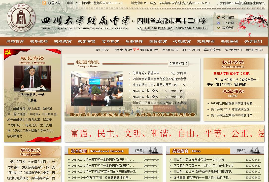 德之有容者,如滄海之納百川;校之載譽者,集大成而越百年。四川大學(xué)附屬中學(xué)(成都市第十二中學(xué))歷經(jīng)世紀(jì)滄桑砥礪,百年春華秋實;見證歷史綿延,盛放華彩萬千。四川大學(xué)附屬中學(xué)(成都十二中)始建于1908年,為當(dāng)時的四川省城高等學(xué)堂(四川大學(xué)前身)附設(shè)中學(xué)堂。解放后隸屬于成都市,1953年命名為成都市第十二中學(xué),后成都市教育局將成都十二中交予四川科分院,改建為“中國科學(xué)院四川分院科學(xué)技術(shù)學(xué)?!保ê喎Q “省科技?!埃?,后科技校停辦,恢復(fù)為成都市第十二中學(xué),校址從三瓦窯遷至現(xiàn)在的九眼橋。2003年合并成都二十九中,恢復(fù)“四川大學(xué)附屬中學(xué)”校名;2006年學(xué)校劃撥武侯區(qū)直管,于2008年合并成都市五十中。學(xué)校堅持始終從四川大學(xué)“海納百川,有容乃大”的博大厚重文化和科分院篤學(xué)嚴(yán)謹(jǐn)?shù)目蒲形幕I養(yǎng),促使“研究”的文化基因在我們附中生根發(fā)芽。川大附中人以“有教無類,作育英才”的情懷,以百年育人的心血,在長期辦學(xué)中積淀形成了“立德樹人 篤行兩責(zé)”的核心理念,形成了“基于全員全程校本教研主流文化,建設(shè)‘培養(yǎng)—研究型’現(xiàn)代學(xué)?!滨r明辦學(xué)特色,凝練出“除了奮斗 別無選擇”的校風(fēng)、“潛心研究 仁心育人”的教風(fēng)和“悉心研習(xí) 靜心成才”的學(xué)風(fēng),形成了“全面發(fā)展 長于研究”的培養(yǎng)目標(biāo)和“核心問題的課堂教學(xué)、活動體驗的實踐德育、陽光幸福的心理教育、身心合一的藝術(shù)體育、開放多元的國際教育”的五個辦學(xué)亮點。川大附中人以自己的大愛與擔(dān)當(dāng),為國家和社會培養(yǎng)了大量德智體全面發(fā)展的棟梁之材,書寫出一部川大附中厚重的“人文滋養(yǎng),百年樹人”歷史?!搬憾胪π?,錦水含章。巍巍學(xué)府,德沃群芳?!被趯W(xué)校為社會培育出郭沫若、楊尚昆、王光祈、李劼人、蒙文通等大批人才的歷史性貢獻(xiàn),政府和社會給予充分肯定和高度評價,學(xué)校是四川省首批辦學(xué)的重點中學(xué)、四川省一級示范性普通高中、空軍青少年航空學(xué)校、全國中學(xué)生英才計劃基地校、中央教科院全國骨干校長教師掛職研修基地、中央教科所創(chuàng)新教育實驗學(xué)校及教改先進實驗學(xué)校、全國培養(yǎng)體育人才十所示范校、國家級體育傳統(tǒng)項目學(xué)校、國家奧林匹克教育示范學(xué)校、中華百年名校、四川省校風(fēng)示范校、四川省高中課程改革樣本校、四川省校本研修示范校、四川省陽光體育示范校、四川省德育先進學(xué)校、四川省心理健康教育實驗校、四川省實驗教學(xué)示范校、成都市撥尖創(chuàng)新人才早期培養(yǎng)基地學(xué)校、成都市教師發(fā)展基地校等?!叭珕T全程的校本教研”已是得到全校師生深度認(rèn)同的學(xué)校主流文化。多年來學(xué)校圍繞“核心問題”的教育科研成果顯著,碩果累累:繼2009年結(jié)題的教育部規(guī)劃課題《基于緘默知識的核心問題教學(xué)實踐研究》成果獲四川省省人民政府第四屆教學(xué)成果一等獎后,全國教育科學(xué)“十二五”規(guī)劃2011年度教育部重點課題《核心問題教學(xué)中的學(xué)生深度體驗實踐研究》再獲2013年四川省人民政府第五屆普教教學(xué)成果一等獎,并榮獲2014年全國首屆基礎(chǔ)教育國家級優(yōu)秀教學(xué)成果二等獎,四川省教育科研資助金項目課題、成都市教育科研課題階段《促進學(xué)生深度體驗的核心問題教學(xué)評價實踐研究》2017年獲四川省教科所一等獎。近年來,四川省教育廳和成都市教育局多次在全省、全市推廣我們的研究成果。學(xué)校課題研究已形成高位發(fā)展態(tài)勢。核心問題的課堂教學(xué)有效促進了教師的發(fā)展,進而切實提高了教學(xué)效率,并且在校外形成輻射引領(lǐng)。百年的厚重積淀,讓川大附中深深地吸引了一批批優(yōu)秀教師在這片熱土上辛勤耕耘、無私奉獻(xiàn),揮灑青春與汗水,展示熱情與夢想?,F(xiàn)在學(xué)校高中部(望江校區(qū))在職在崗232位專任教師100%達(dá)本科及以上學(xué)歷,其中博士學(xué)位1人,研究生畢業(yè)85人,正高級教師2人,高級教師97人。特級教師及各級黨政表彰的名優(yōu)教師191人。近五年來有超過60%的教師承擔(dān)過市級及以上的專題講座。近年來,學(xué)校切實實施新課改,老師們的教育觀念和教學(xué)行為進一步得到轉(zhuǎn)變,學(xué)校教學(xué)質(zhì)量依然穩(wěn)步提升。2016年高考,本一率為76.1%;2017年高考,本一率為82.5%;2018年高考,本一率達(dá)91.6%,600分以上人數(shù)比例超過40%,兩名同學(xué)被北京大學(xué)錄取。2018年,首屆空軍航空班學(xué)生畢業(yè),我校培養(yǎng)出空軍飛行員17人,出飛率達(dá)42.5%,名列全國16所青少年航空學(xué)校第四。百年滄桑綿延華彩傳薪火,千秋事業(yè)砥礪前行譜華章。附中人必定心懷夢想,扎實耕耘,實現(xiàn)革故鼎新、與時俱進、強化優(yōu)勢、高位突破、鑄造品牌的附中夢。