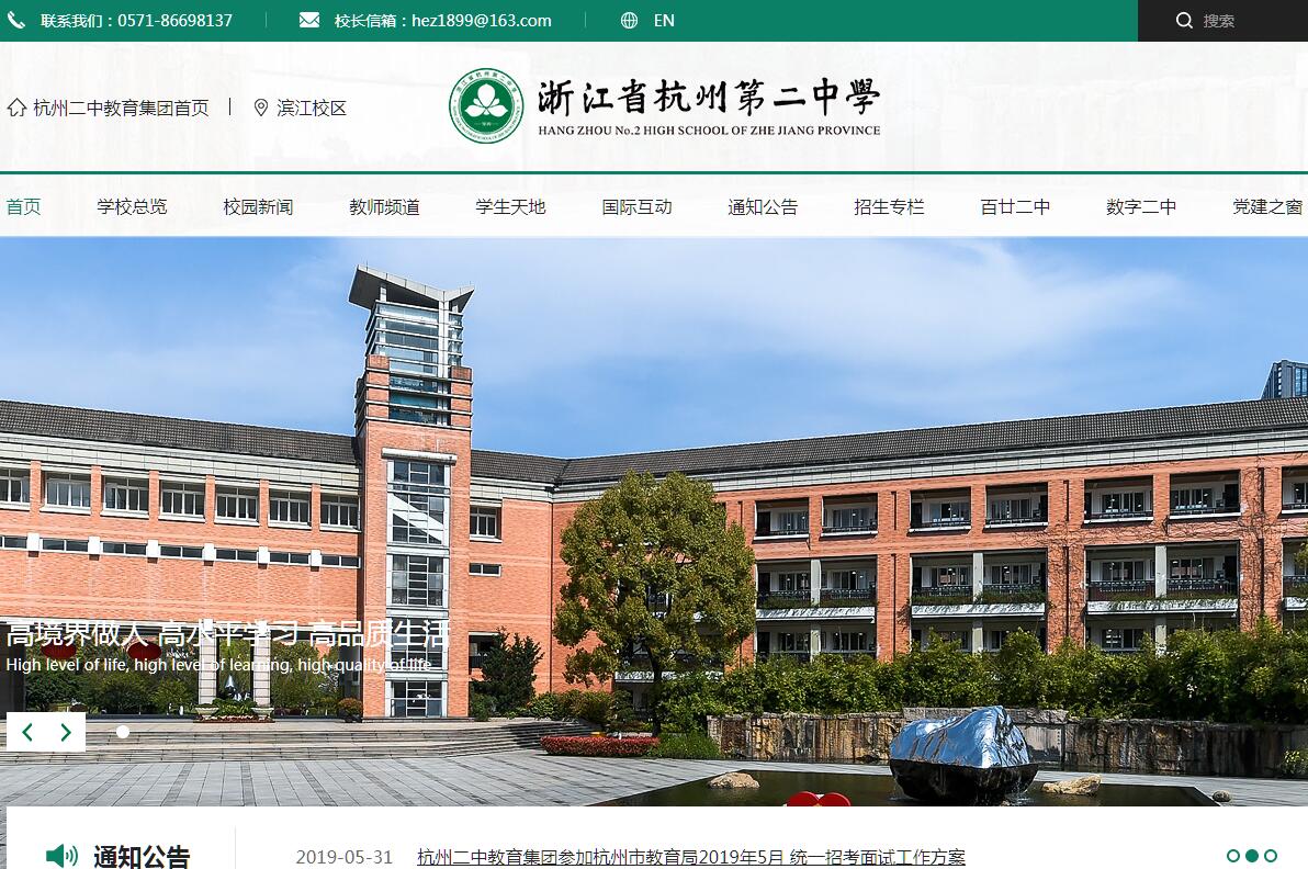 浙江省杭州第二中學(xué)歷史悠久,是杭州最早的現(xiàn)代班級(jí)授課制學(xué)校之一,前身為1899年由美國傳教士甘惠德創(chuàng)建的私立蕙蘭中學(xué)和1940年由原浙江大學(xué)校長竺可楨先生創(chuàng)辦的國立浙江大學(xué)附屬中學(xué)。1951年兩校在“蕙蘭”原址合并,改稱“浙江省杭州第二中學(xué)”。 2001年學(xué)校實(shí)施跨江發(fā)展,學(xué)校在錢塘江南岸濱江區(qū)建成新校區(qū)。目前已形成一校兩區(qū)(濱江校區(qū)和東河校區(qū))的格局。1978年,學(xué)校被認(rèn)定為浙江省重點(diǎn)中學(xué),是浙江省首批辦好的18所重點(diǎn)中學(xué)之一;1995年被評(píng)為浙江省首批一級(jí)重點(diǎn)中學(xué);2014年,被評(píng)為浙江省首批一級(jí)普通高中特色示范學(xué)校。多年來,學(xué)校辦學(xué)業(yè)績一直被社會(huì)矚目,榮譽(yù)卓著。1983年被教育部評(píng)為“‘五講四美’為人師表活動(dòng)先進(jìn)集體”;1999年被評(píng)為“全國精神文明建設(shè)先進(jìn)單位”;2003年學(xué)校再次被確定為“全國精神文明建設(shè)先進(jìn)單位”;2007年被教育部評(píng)為“全國教育系統(tǒng)先進(jìn)集體”;2011年被“中國教育報(bào)刊社”選為“全國百強(qiáng)特色學(xué)校十佳示范學(xué)?!保惶貏e是2011年底,學(xué)校榮獲杭州市教育系統(tǒng)唯一的“全國文明單位”的稱號(hào);2012年,學(xué)校黨總支又被評(píng)為全省基礎(chǔ)教育界唯一的“全國創(chuàng)先爭優(yōu)先進(jìn)基層黨組織”。2013年,美國華盛頓中國研究中心評(píng)選的中國高中排名榜中,我校榮膺全國第五。2016年,成為中國教育發(fā)展戰(zhàn)略學(xué)會(huì)首屆高中教育專業(yè)委員會(huì)理事長單位。2017年,學(xué)校相繼被評(píng)為首批全國文明校園,全國科技教育創(chuàng)新十佳學(xué)校,全國青少年校園足球特色學(xué)校。杭州二中秉承百年歷史名校的優(yōu)良辦學(xué)傳統(tǒng)和深厚的文化底蘊(yùn),信守“讓能飛的飛起來,讓會(huì)飛的飛更高”的辦學(xué)理念,崇尚基于科學(xué)和民主的“高、正、實(shí)”的校園精神,堅(jiān)持“思想解放、行為規(guī)范”原則,追求“高境界做人、高水平學(xué)習(xí)、高品質(zhì)生活”辦學(xué)境界,以“開明、開化、開放”,“寬松、寬容、寬厚”,“人性、靈性、理性”的文化浸潤人心,努力營造一個(gè)能夠讓所有學(xué)生都愉快成長、卓越發(fā)展的學(xué)習(xí)空間。多年來,學(xué)校在素質(zhì)教育上矢志不渝的追求,深受全社會(huì)的信賴和贊譽(yù),贏得了百姓的口碑。學(xué)校積極推行“11+1”素質(zhì)培養(yǎng)新模式,人人“會(huì)游泳、能自救、重健身、懂藝術(shù)、能開口、講禮儀、愛實(shí)踐、愿上崗、會(huì)服務(wù)、進(jìn)社團(tuán)、懂規(guī)劃+會(huì)開車”,努力使每一位在二中同學(xué)有充分錘煉、展示和提高的平臺(tái),在充滿青春活力的校園生活中獲得學(xué)情、友情和親情。學(xué)校設(shè)有傳媒特色班和A-level 課程班。創(chuàng)辦了62個(gè)社團(tuán)以及14個(gè)體育俱樂部為載體打造同學(xué)們的活動(dòng)平臺(tái),創(chuàng)設(shè)了“讀書節(jié)”、“科技節(jié)”、“體育文化節(jié)”、“藝術(shù)節(jié)”、“社團(tuán)節(jié)”、“生活技能節(jié)”等校園活動(dòng)節(jié),形成了深受學(xué)生歡迎的校園活動(dòng)系列。學(xué)校還與美國、英國、德國、澳大利亞、加拿大、日本、新加坡等國的學(xué)校建立了校際合作關(guān)系,每年都組織教師和學(xué)生到境外學(xué)習(xí)、交流。2016年學(xué)校成功舉辦哈佛大學(xué)中美學(xué)生領(lǐng)袖峰會(huì),并成為永久會(huì)場,每年有數(shù)十名哈佛大學(xué)明星授課人來校授課。學(xué)校辦學(xué)成果斐然,其高質(zhì)量的教育教學(xué)名重省內(nèi)外。近年來,高考北大清華錄取人數(shù)保持在四十人左右。2017年,清華北大錄取人數(shù)達(dá)51人(高考參考人數(shù)546人)。985高校錄取率節(jié)節(jié)攀升,2017年達(dá)85%,居全省第一。每年還有數(shù)十名畢業(yè)生被哈佛大學(xué)、麻省理工學(xué)院、牛津大學(xué)、劍橋大學(xué)等世界頂級(jí)名校錄取。國際奧林匹克學(xué)科競賽成績在全國名列前茅,已獲得物理、化學(xué)、信息、生物四個(gè)學(xué)科的11枚金牌。在全國青少年科技創(chuàng)新大賽、DI創(chuàng)新思維大賽、英特爾國際科學(xué)與工程大賽、國際太空城市設(shè)計(jì)大賽、FTC國際機(jī)器人大賽、哈佛大學(xué)中國大智匯創(chuàng)新研究挑戰(zhàn)賽等國內(nèi)外高端賽事中也屢獲佳績。