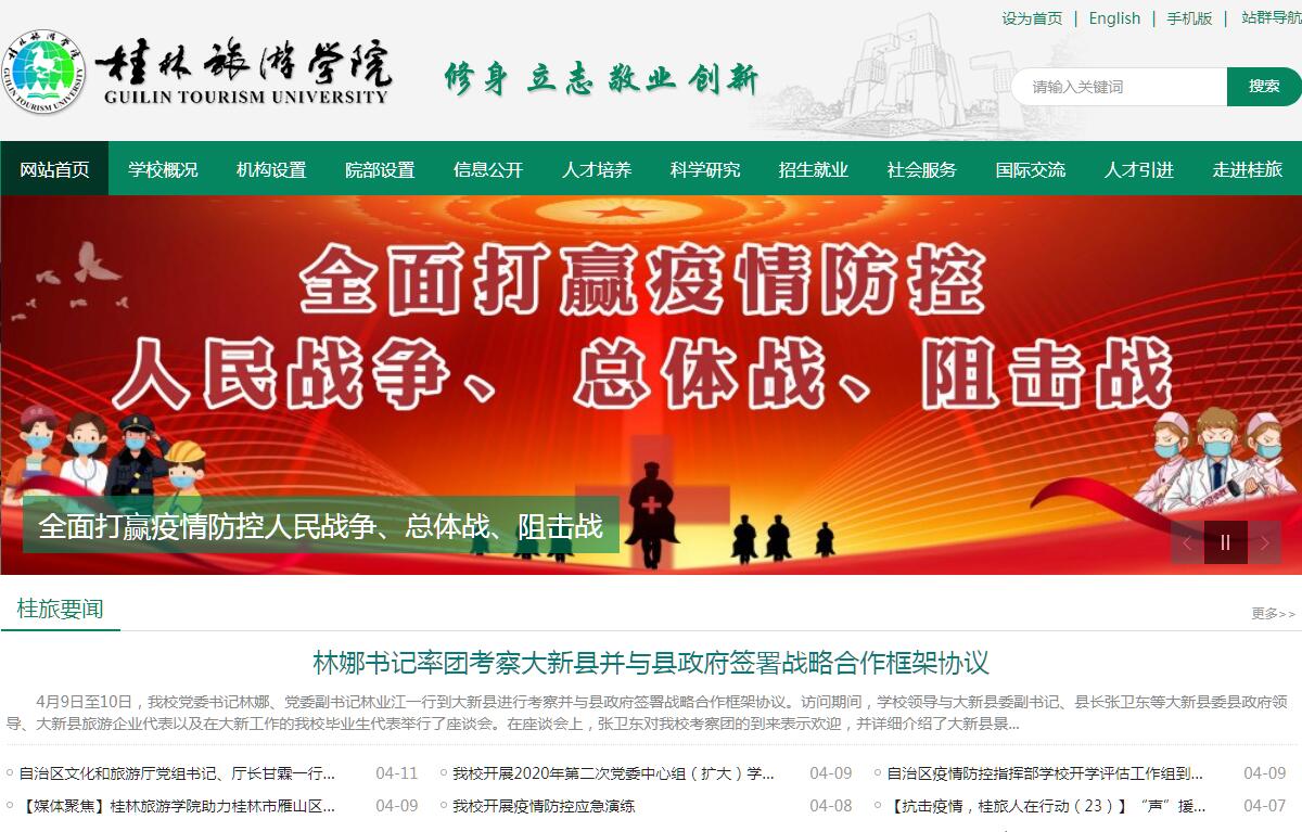 桂林旅游學(xué)院創(chuàng)辦于1985年,原名桂林旅游??茖W(xué)校;1994年更名為桂林旅游高等??茖W(xué)校;2015年升格為桂林旅游學(xué)院,是我國兩所獨(dú)立建制全日制公辦旅游本科院校之一。學(xué)?,F(xiàn)有雁山、驂鸞兩個(gè)校區(qū),總占地面積125萬平方米(1885畝),全日制在校生11900多人。學(xué)校是聯(lián)合國世界旅游組織在中國大陸唯一的重點(diǎn)支持單位及其教育委員會(huì)附屬成員單位、亞太旅游協(xié)會(huì)教育類會(huì)員單位、亞洲開發(fā)銀行“高端旅游人才培訓(xùn)優(yōu)秀合作伙伴”、中國旅游院?!拔逍锹?lián)盟”單位、中國-東盟旅游教育聯(lián)盟發(fā)起院校、中國-東盟旅游人才教育培訓(xùn)基地、中國-東盟旅游研究基地、全國旅游扶貧培訓(xùn)基地、首批港澳青少年游學(xué)基地、全國群眾體育先進(jìn)單位、廣西旅游人才小高地和廣西旅游數(shù)據(jù)中心載體單位;獲全國餐飲職業(yè)教育優(yōu)秀院校和最佳東方旅游服務(wù)業(yè)優(yōu)秀人才培養(yǎng)院校獎(jiǎng)。辦學(xué)緊貼行業(yè) 學(xué)校組建了由行業(yè)、企業(yè)、政府、學(xué)校共同組成的理事會(huì),社會(huì)行業(yè)廣泛參與學(xué)校的辦學(xué),形成了“產(chǎn)教融合、校企合作、多主體協(xié)同育人”的人才培養(yǎng)模式?,F(xiàn)設(shè)有13個(gè)二級(jí)學(xué)院(部),設(shè)有19個(gè)本科專業(yè),36個(gè)高職高專專業(yè),涵蓋“吃、住、行、游、購、娛”及新常態(tài)等旅游業(yè)主要領(lǐng)域。與“希爾頓全球”等國內(nèi)外業(yè)界160多家知名企業(yè)建立了長期穩(wěn)定深入的合作關(guān)系。教改成果豐碩 現(xiàn)有聯(lián)合國世界旅游組織國際旅游質(zhì)量教育認(rèn)證專業(yè)8個(gè);國家高職高專教學(xué)改革試點(diǎn)專業(yè)及自治區(qū)精品專業(yè)各1個(gè),自治區(qū)優(yōu)質(zhì)專業(yè)12個(gè);“旅游管理”學(xué)科獲得廣西一流學(xué)科(培育)立項(xiàng),并擁有“旅游管理”和“設(shè)計(jì)學(xué)”兩個(gè)廣西重點(diǎn)學(xué)科,以及“休閑養(yǎng)生旅游研究中心”和“民族特色旅游工藝品研究中心”兩個(gè)廣西高校人文社會(huì)科學(xué)重點(diǎn)研究培育基地。有中央財(cái)政支持實(shí)訓(xùn)基地、自治區(qū)示范性實(shí)訓(xùn)基地等共14個(gè);國家級(jí)精品課程2門,國家級(jí)精品資源共享課1門,自治區(qū)級(jí)精品課程13門;國家級(jí)教學(xué)成果二等獎(jiǎng)1項(xiàng),廣西教學(xué)成果獎(jiǎng)17項(xiàng)。師資隊(duì)伍優(yōu)質(zhì) 現(xiàn)有專任教師601人,高級(jí)職稱教師204人(其中正高職稱42人),占專任教師總數(shù)的34%。有“千人計(jì)劃”專家、自治區(qū)特聘專家、全國行業(yè)職業(yè)教育教學(xué)指導(dǎo)委員會(huì)委員、自治區(qū)級(jí)教學(xué)名師、國家旅游局旅游業(yè)青年專家、廣西卓越學(xué)者、廣西高等學(xué)校專業(yè)類教學(xué)指導(dǎo)委員會(huì)委員、廣西行業(yè)職業(yè)教育教學(xué)指導(dǎo)委員會(huì)委員、全國五一勞動(dòng)獎(jiǎng)?wù)隆鲍@得者、傅雷翻譯獎(jiǎng)獲得者等多名。長期聘請外籍專家、著名學(xué)者、行業(yè)精英到校任教、講學(xué)。47%教師有境外留學(xué)、訪學(xué)或培訓(xùn)經(jīng)歷,50%以上教師是“雙師型”教師。培養(yǎng)質(zhì)量可靠 人社部人才交流中心“旅游專場”招聘會(huì)永久落戶學(xué)校。畢業(yè)生就業(yè)率和就業(yè)質(zhì)量居同類高校前列,多次被評為廣西高校畢業(yè)生就業(yè)先進(jìn)單位。近年來,已有1000多名學(xué)生赴美國、阿聯(lián)酋、加拿大、日本、法國等國家實(shí)習(xí)、就業(yè)。學(xué)生在全國各類職業(yè)技能大賽和學(xué)科專業(yè)競賽中獲獎(jiǎng)數(shù)量和級(jí)次居行業(yè)院校前列。服務(wù)能力突出 學(xué)校是廣西旅游產(chǎn)業(yè)人才小高地載體單位,設(shè)有廣西旅游規(guī)劃設(shè)計(jì)研究院、廣西旅游科學(xué)研究所、廣西旅游數(shù)據(jù)中心、桂旅旅游規(guī)劃設(shè)計(jì)研究院、廣西旅游產(chǎn)業(yè)服務(wù)平臺(tái)等科研和社會(huì)服務(wù)平臺(tái)。近年來承擔(dān)了國家社科基金、廣西千億元產(chǎn)業(yè)重大科技攻關(guān)等國家、省部級(jí)以上科研項(xiàng)目及獲得省部級(jí)以上成果獎(jiǎng)140多項(xiàng),為區(qū)內(nèi)外20多個(gè)市、縣制定規(guī)劃項(xiàng)目、地方行業(yè)標(biāo)準(zhǔn)100多項(xiàng)。學(xué)報(bào)《旅游論壇》是國內(nèi)重要的旅游學(xué)術(shù)研究平臺(tái),連年被評為“廣西高校十佳學(xué)報(bào)”,入選“2012中國國際影響力優(yōu)秀學(xué)術(shù)期刊”。國際交流廣泛 學(xué)校與聯(lián)合國世界旅游組織、亞太旅游協(xié)會(huì)等國際組織以及瑞士洛桑酒店管理學(xué)院、香港理工大學(xué)等20多所境外高校開展人才培養(yǎng)、師資培訓(xùn)等合作,是獲得瑞士洛桑酒店管理學(xué)院學(xué)術(shù)體系認(rèn)證的全球8所院校之一。俄羅斯副總理戈洛杰茨、聯(lián)合國世界旅游組織兩任秘書長到學(xué)校考察、演講。聯(lián)合國世界旅游組織秘書長瑞法依評價(jià)說:“與學(xué)校的合作已作為聯(lián)合國世界旅游組織開展各相關(guān)領(lǐng)域合作