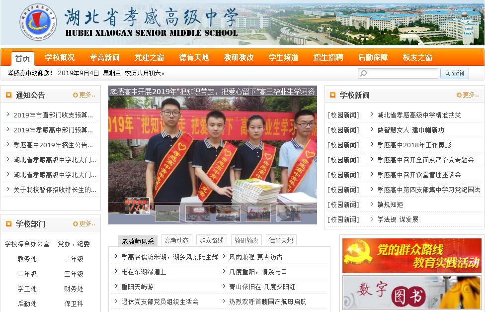 湖北省孝感高中位于湖北省孝感市,解放初期就是省級重點中學(xué),是湖北省示范學(xué)校、湖北省教育科學(xué)研究實驗中學(xué),湖北八校聯(lián)考成員。學(xué)校成立于1946年,1978年恢復(fù)重建,1998年被湖北省政府教育督導(dǎo)室評為“省級示范學(xué)?!薄?002年9月,整體搬遷至交通西路。截至2011年5月,學(xué)校占地300畝,建筑面積10萬余平方米,共有在崗教職工386人,在校學(xué)生6000人,開辦90個教學(xué)班,專職教師306人。截至2015年1月,學(xué)校每個教室配有空調(diào)、多媒體設(shè)備,擁有各種學(xué)生活動室、功能室;學(xué)校建有學(xué)生宿舍4棟、學(xué)生公寓4人一間,普通宿舍6-8人,均配有書桌、書櫥、盥洗間、空調(diào)、熱水器等設(shè)施。截至2013年10月,學(xué)校圖書館建筑面積2000多平方米,館內(nèi)除設(shè)有基藏書庫、外借書庫、學(xué)生閱覽室、教工閱覽室、過刊資料室、相關(guān)管理室等成龍配套的功能庫室,館外還交叉配有電子閱覽室、教材室等。共有紙質(zhì)圖書62000余冊、電子圖書50萬冊、報刊雜志160多種,各閱覽室(含電子閱覽室)座位總計520個。每年還新增紙質(zhì)圖書生均超1冊。2016年高考,普通文理科過一本線人數(shù)共計1092人。其中理科過一本線1006人,文科過一本線86人;600分以上411人;獲孝感市文理狀元;同時,孝感市理科前十名占9名,文科前十名占7名。2010年,在全國高中數(shù)學(xué)競賽中,1名學(xué)生獲得全國一等獎、10名同學(xué)獲全國二等獎、7名同學(xué)獲全國三等獎。在孝感市首屆中小學(xué)生作文擂臺賽中,7名同學(xué)獲一等獎、5名同學(xué)獲二等獎、4名同學(xué)獲三等獎。1名學(xué)生湖北省第三屆中學(xué)生英語口語競賽中獲高二組一等獎。在2010年全國高中化學(xué)競賽中1名學(xué)生獲全國一等獎、6名同學(xué)獲全國二等獎、2名同學(xué)獲全國三等獎。在2010年全國中學(xué)生生物聯(lián)賽中,2名同學(xué)獲全國二等獎、6名同學(xué)獲全國三等獎。在2010年全國中學(xué)生地理奧林匹克競賽中,4名同學(xué)獲省一等獎、2名同學(xué)獲省二等獎。在2010年全國信息學(xué)奧林匹克競賽中,1名學(xué)生獲全國一等獎。2名學(xué)生獲第25屆湖北省青少年科技創(chuàng)新大賽青少年科技創(chuàng)新成果一等獎。2014年5月,4名教師參加市“課內(nèi)比教學(xué)”比武活動獲一等獎。6月28-30日,學(xué)校承擔(dān)的教育部課程教材研究所“十二五”規(guī)劃重點課題高中子課題《新課程高中化學(xué)教科書實驗改進的研究》取得成果29件,獲得省級獎項5項,經(jīng)課題鑒定小組研究鑒定,認(rèn)為學(xué)?;瘜W(xué)課題成果達到一級水平。