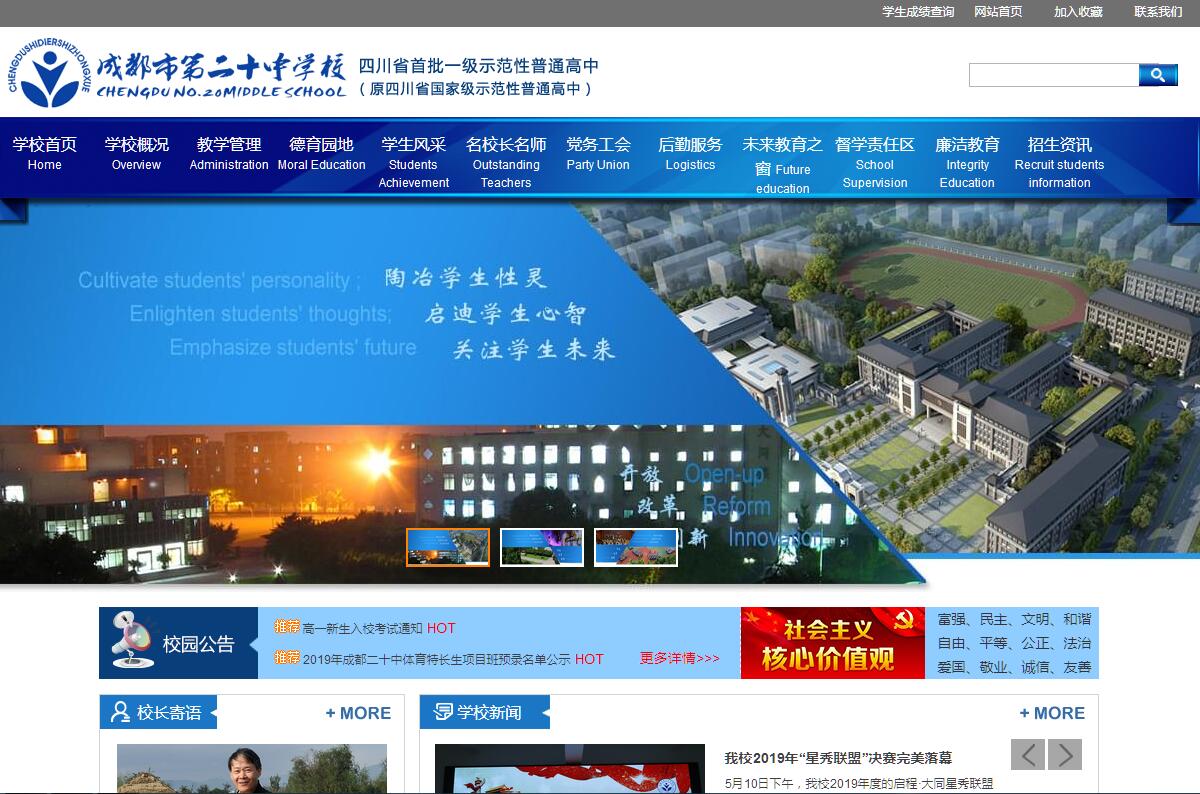 成都二十中創(chuàng)辦于1930年,原名成都私立大同中學(xué),是金牛區(qū)辦學(xué)歷史最為悠久的中學(xué)。學(xué)校是四川首批一級示范性普通高中、四川省校風(fēng)示范學(xué)校、全國學(xué)校藝術(shù)教育工作先進單位、全國群眾體育先進單位、四川省陽光體育示范學(xué)校、成都市拔尖創(chuàng)新人才培養(yǎng)基地校、成都市國際理解教育課程實驗校、成都市高中新課改示范校、新浪?教育“最具口碑魅力學(xué)?!薄W(xué)校被中國教育學(xué)會授予“現(xiàn)代學(xué)校聯(lián)盟行動計劃首批加盟學(xué)?!狈Q號,是中國科技大學(xué)等眾多重點高校的優(yōu)質(zhì)生源基地校。學(xué)校位于環(huán)交大智慧城,占地120余畝,包括茶店子高中部和黃忠初中部兩個校區(qū)?,F(xiàn)有60多個教學(xué)班,學(xué)生3000余人,教職工260余人。八十八載風(fēng)醞雨潤,薪火相傳,凝聚成“情智并育、慧行天下”的教育理念以及“德育首位、競賽領(lǐng)先、藝體見長、和諧發(fā)展”的辦學(xué)特色。學(xué)校秉承“人人為公,天下大同”文化傳統(tǒng),繼承心系天下、情牽蒼生的大同胸懷,弘揚“責(zé)任”“平等”“和諧”的大同精神,堅持“努力把每一個學(xué)生培養(yǎng)成為情趣高尚、學(xué)力高強、身心健康、個性鮮明,具有創(chuàng)新精神和實踐能力的高素質(zhì)學(xué)生”的育人目標(biāo),教育教學(xué)工作取得優(yōu)異成績,成為一所深受廣大家長稱贊和學(xué)生歡迎的省一級示范性普通高中。成都二十中系成都市高中新課改示范校,擁有一只愛崗敬業(yè)、勤于奉獻教職工隊伍,正高級教師1人、特級教師5人、高級職稱教師102人,省、市、區(qū)各級學(xué)科帶頭人、教育專家等骨干教師13教師團隊踐行“為專業(yè)尊嚴(yán),為團隊榮譽,為學(xué)子未來”的教師文化,注重專業(yè)發(fā)展,教育教學(xué)理念先進,教學(xué)藝術(shù)精湛,愛崗敬業(yè),關(guān)愛學(xué)生,助力學(xué)生多元發(fā)展。學(xué)校系成都市園林單位,悠久的歷史積淀了厚重的人文底蘊,承載著歷屆校友美好記憶的校園,訴說著過往的青春歲月。培養(yǎng)了“堅韌沉穩(wěn)?向善大同”的校園文化精神。目前,初中部校區(qū)已完成全面改造提檔升級,投資近3億元的高中部校區(qū)改擴建工程(一期)已竣工投入使用。一所教育理念領(lǐng)先、具有中國傳統(tǒng)建筑風(fēng)格、可充分滿足不同學(xué)生走班需求的智慧學(xué)校,將成為莘莘學(xué)子生動和諧成長的學(xué)園、家園和樂園。學(xué)校堅持“開放 創(chuàng)新 發(fā)展”的辦學(xué)思想,踐行“情智并育 慧行天下”的辦學(xué)理念,以學(xué)生發(fā)展為本,以教育教學(xué)質(zhì)量為生命線。學(xué)校高考成績顯著,躋身全市省一級示范學(xué)校前列,連續(xù)二十多年受到市教育局“高中教育教學(xué)質(zhì)量成績顯著”表彰,并多次在全市高考總結(jié)暨高三教學(xué)工作會上作經(jīng)驗交流。近三年,高考本科上線率連年上升,特優(yōu)生群體不斷擴大,每年有上百學(xué)生考入“985”、“211”等全國一流高校、一流專業(yè)。重視校本課程建設(shè),提高學(xué)生的綜合素養(yǎng)。舉辦勞動教育、學(xué)生社團、博雅藝術(shù)、競技體育、學(xué)科競賽等校本課程。學(xué)生管弦樂團連續(xù)多次受邀參加成都國際青年音樂周展演活動;學(xué)校棒球隊、田徑隊、游泳隊參加國家、省市各級各類比賽,成績優(yōu)異。學(xué)校還擁有諸多藝術(shù)活動品牌:已經(jīng)成功舉辦22屆新春音樂會、12屆“星秀聯(lián)盟”校園歌手大賽、13屆畢業(yè)歌舞晚會。2013年,我校受邀參加亞洲教育論壇年會就藝術(shù)教育作主題演講,成為全國唯一一所連續(xù)兩次受邀參加亞洲教育論壇的中學(xué)。21世紀(jì)教育面臨重大變革,成都二十中順應(yīng)未來教育發(fā)展,按照頂層設(shè)計思路,通過云技術(shù)構(gòu)建信息共享的基礎(chǔ)平臺,實現(xiàn)用戶信息、教學(xué)資源信息、教學(xué)軌跡信息等共享的智慧教育,通過智慧物聯(lián)實現(xiàn)智能化管理,通過生活運動軌跡大數(shù)據(jù)采集形成學(xué)生成長智慧環(huán)境系統(tǒng)。從而構(gòu)建教師精準(zhǔn)化教學(xué),學(xué)生個性化、全時空、立體交互式學(xué)習(xí)環(huán)境系統(tǒng),實現(xiàn)教師智慧教,學(xué)生智慧學(xué),培養(yǎng)智慧人生的智慧校園。目前,在金牛區(qū)委、區(qū)政府的關(guān)心和區(qū)教育局的大力支持下,我校初中部校區(qū)已完成全面改造,投資近3億元的高中部校區(qū)改擴建一期工程已竣工投入使用。一所教育理念領(lǐng)先、具有中國傳統(tǒng)建筑風(fēng)格、適應(yīng)新高考改革、可充分滿足不同學(xué)生走班需求的智慧學(xué)校歡迎你的到來。學(xué)校正朝著“市內(nèi)綜合實力前列,國內(nèi)辦學(xué)特色鮮明的開放型、培養(yǎng)型優(yōu)質(zhì)高中”的發(fā)展目標(biāo)努力邁進。