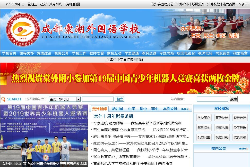 | 網(wǎng)站簡(jiǎn)介: 成都棠湖外國(guó)語(yǔ)學(xué)校(簡(jiǎn)稱(chēng)“棠外”,原名四川雙流棠湖中學(xué)外語(yǔ)實(shí)驗(yàn)學(xué)校)是經(jīng)四川省教育廳批準(zhǔn)、于2003年建成的一所全寄宿制現(xiàn)代化股份制學(xué)校,包括幼兒園、小學(xué)部、初中部和高中部(含國(guó)際部)。學(xué)校坐落在雙流西南航空港經(jīng)濟(jì)開(kāi)發(fā)區(qū)核心地帶,毗鄰雙流國(guó)際機(jī)場(chǎng),距成都市中心8公里,緊鄰機(jī)場(chǎng)高速、成雅高速,交通方便快捷。校園被四川大學(xué)、西南民族大學(xué)、成都信息工程大學(xué)等高校的新校區(qū)和中科院產(chǎn)業(yè)園區(qū)環(huán)抱,科學(xué)文化氛圍濃郁,被人們譽(yù)為“大學(xué)懷抱中的學(xué)?!?。校園占地近300畝,環(huán)境優(yōu)雅,設(shè)施一流。建有現(xiàn)代化的教學(xué)樓、科技實(shí)驗(yàn)樓、信息技術(shù)中心、藝術(shù)樓、科技館、機(jī)器人創(chuàng)新工作室、創(chuàng)客中心、電子圖書(shū)館、音樂(lè)廳等。學(xué)校在“仁、德、志、譞”的校訓(xùn)和“六會(huì)一長(zhǎng)”(會(huì)做人、會(huì)求知、會(huì)生活、會(huì)審美、會(huì)健體、會(huì)創(chuàng)造、有特長(zhǎng))的育人目標(biāo)的引領(lǐng)下,全面貫徹黨的教育方針,深入實(shí)施推進(jìn)素質(zhì)教育,立德樹(shù)人,堅(jiān)持多元辦學(xué)、因材施教、精細(xì)化管理的教育模式,讓每一位學(xué)生都能有所進(jìn)步和提高,建校十幾年來(lái)取得了豐碩的教育教學(xué)成果,贏得了家長(zhǎng)的認(rèn)可和社會(huì)的廣泛贊譽(yù)。學(xué)校先后被評(píng)為“四川省文明單位”“四川省一級(jí)示范性學(xué)校”“全國(guó)首批示范性外語(yǔ)特色學(xué)?!薄叭珖?guó)先進(jìn)民辦學(xué)?!薄叭珖?guó)關(guān)心成長(zhǎng)模范學(xué)?!薄叭珖?guó)基礎(chǔ)教育改革示范學(xué)?!薄叭珖?guó)素質(zhì)教育典范單位”“全國(guó)教育科研先進(jìn)單位”“全國(guó)百?gòu)?qiáng)特色學(xué)校”“全國(guó)特色建設(shè)先進(jìn)學(xué)?!?“四川省陽(yáng)光體育示范學(xué)校”“四川省藝術(shù)教育特色學(xué)?!薄笆讓贸啥甲蠲佬@”。 |