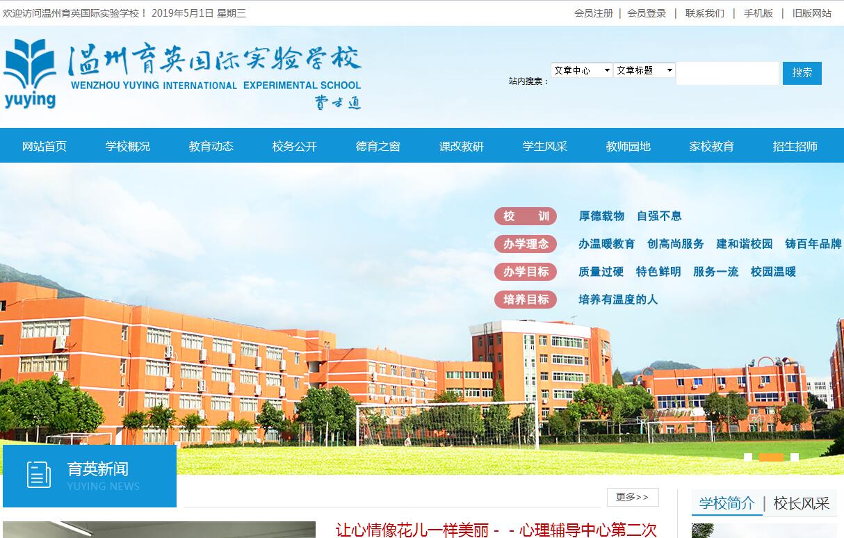 溫州育英國(guó)際實(shí)驗(yàn)學(xué)校是一所從小學(xué)、初中到高中的12 年一貫制民辦寄宿學(xué)校, 1996 年創(chuàng)辦,總投資2.38 億元,占地面積186 畝,建筑面積10 萬平方米?,F(xiàn)有教學(xué)班 133個(gè)(其中小學(xué) 54 個(gè)班、初中 52 個(gè)班、高中 27 個(gè)班)在校生 5882人,教職工 783人。 448 名專任教師來自全國(guó) 19個(gè)省、直轄市、自治區(qū),95%以上獲得當(dāng)?shù)乜h級(jí)以上教壇新秀(教學(xué)新星、優(yōu)質(zhì)課競(jìng)賽獎(jiǎng))稱號(hào),地(市)級(jí)、省級(jí)、國(guó)家級(jí)獲獎(jiǎng)教師逾60%。校園采用園林式布局,造型別致,分區(qū)科學(xué)。教學(xué)區(qū):高中、初中、小學(xué)分校相對(duì)獨(dú)立。中小學(xué)教室、辦公室寬敞明亮,教室配置閉路電視、空調(diào)、多媒體小平臺(tái)等設(shè)備;育英網(wǎng)站、校園網(wǎng)絡(luò)、育英電視臺(tái)、育英廣播站、微機(jī)室、語(yǔ)音室、實(shí)驗(yàn)室、課件制作室、音樂、舞蹈、書畫、琴棋等專用教室俱全,配套設(shè)施完備。生活區(qū):師生公寓衛(wèi)生設(shè)施齊全,24小時(shí)熱水供應(yīng)。學(xué)生公寓安裝空調(diào)、電話。學(xué)生、教工餐廳用具均為不銹鋼制品,備有烤箱、高溫消毒柜、冷庫(kù)等設(shè)施?;锸硨?shí)行營(yíng)養(yǎng)配餐(套餐);還設(shè)有24小時(shí)值班巡邏的安全保衛(wèi)科、全天候服務(wù)的醫(yī)療保健心理健康中心?;顒?dòng)區(qū):擁有400米塑膠環(huán)形跑道的標(biāo)準(zhǔn)田徑場(chǎng)、200米環(huán)形跑道塑膠田徑場(chǎng)、小學(xué)生塑膠運(yùn)動(dòng)場(chǎng)、體育館,2個(gè)塑膠網(wǎng)球場(chǎng)以及各類球場(chǎng)。建有2個(gè)校內(nèi)小公園。校園綠化面積 4.9萬平方米,綠化率達(dá)42.5%。1996年創(chuàng)辦伊始,學(xué)校舉辦者冷靜分析了溫州區(qū)域經(jīng)濟(jì)超前發(fā)展與基礎(chǔ)教育培養(yǎng)后繼人才相對(duì)滯后的現(xiàn)狀,以“高標(biāo)準(zhǔn)、高檔次、高起點(diǎn)、高質(zhì)量”為學(xué)校發(fā)展作了戰(zhàn)略定位;制定了“厚德載物,自強(qiáng)不息”的校訓(xùn),逐步形成了“愛生如子,愛校如家,教書育人,真誠(chéng)奉獻(xiàn)”的教風(fēng),“會(huì)求知,會(huì)健體、會(huì)做事,會(huì)生活,會(huì)創(chuàng)造,會(huì)感恩”的學(xué)風(fēng),“博學(xué)篤志,堅(jiān)毅自強(qiáng),誠(chéng)信明禮,求實(shí)創(chuàng)新”的校風(fēng)。2013年9月,學(xué)校發(fā)展規(guī)劃確立了“辦溫暖教育,創(chuàng)高尚服務(wù),建和諧校園,鑄百年品牌”發(fā)展愿景。21年來,學(xué)校積淀成較為科學(xué)的辦學(xué)理念、管理理念和教育理念。學(xué)校舉辦者與管理者的職責(zé)權(quán)限明晰,“條塊結(jié)合”式的管理體系功能具體。學(xué)校實(shí)行董事會(huì)領(lǐng)導(dǎo)下的總校執(zhí)行校長(zhǎng)負(fù)責(zé)制,執(zhí)行校長(zhǎng)全面主持學(xué)校日常工作。并按溫州市非公有制企事業(yè)建制,成立了學(xué)校黨總支、工會(huì)、團(tuán)委組織??傂?zhí)行校長(zhǎng)室下設(shè)高中分校、初中分校、小學(xué)分校、總校辦公室、督導(dǎo)室、后勤部。各分校、部室下設(shè)處、科、中心若干。管理體系人員精干,職責(zé)明確,分工協(xié)作,確保學(xué)校管理工作的高效運(yùn)轉(zhuǎn)。創(chuàng)辦以來,在上級(jí)黨政部門的重視關(guān)懷下,在廣大家長(zhǎng)和社會(huì)各界的關(guān)心支持下,我校堅(jiān)持全面貫徹教育方針,全面實(shí)施素質(zhì)教育,秉持先進(jìn)的教育思想、辦學(xué)理念,努力辦好讓人民滿意的教育。精心架構(gòu)高中、初中、小學(xué)彼此銜接,梯次互補(bǔ)的優(yōu)質(zhì)教育發(fā)展格局,步入良性循環(huán)發(fā)展的軌道,充滿可持續(xù)和穩(wěn)步發(fā)展的活力。實(shí)施高中振興工程,從全國(guó)各地省級(jí)示范高中引進(jìn)名優(yōu)教師30余名,廣招獎(jiǎng)勵(lì)品學(xué)兼優(yōu)的學(xué)生,實(shí)施英才教育。高中畢業(yè)會(huì)考、高考、學(xué)科競(jìng)賽一年一個(gè)臺(tái)階。2016年,4名學(xué)生考上北大清華;2017年,2名學(xué)生考上北大清華,倪芳彬同學(xué)以708分的高分、位次號(hào)全省第10名的優(yōu)異成績(jī)榮膺溫州市高考狀元;2018年,5名學(xué)生考上北大清華。初中充分依靠一支德才兼?zhèn)?、年富力?qiáng)的名師隊(duì)伍,質(zhì)量特色并舉,夯實(shí)了在甌海區(qū)、溫州市教育教學(xué)質(zhì)量領(lǐng)先的地位。小學(xué)全面實(shí)施素質(zhì)教育,培養(yǎng)學(xué)生良好的學(xué)習(xí)、生活習(xí)慣,讓每個(gè)孩子掌握1—2門藝術(shù)特長(zhǎng),為學(xué)生德、智、體、美全面發(fā)展奠定堅(jiān)實(shí)的基礎(chǔ)。初中小學(xué)開發(fā)并實(shí)施“留給學(xué)生溫暖記憶的校本課程,”拓展學(xué)生的智力潛能,促進(jìn)學(xué)生全面主動(dòng)發(fā)展。學(xué)校綜合辦學(xué)水平日益提高。1998年被市教委授予“學(xué)生日常行為規(guī)范達(dá)標(biāo)學(xué)?!?;1999年被溫州市政府評(píng)為“溫州市花園式單位”。2000年2月被甌海區(qū)政府評(píng)為“文明單位”,3月被省政府授予“浙江省優(yōu)秀民辦學(xué)?!?,5月被授予“浙江省一級(jí)民辦普通高(完)中”。2002