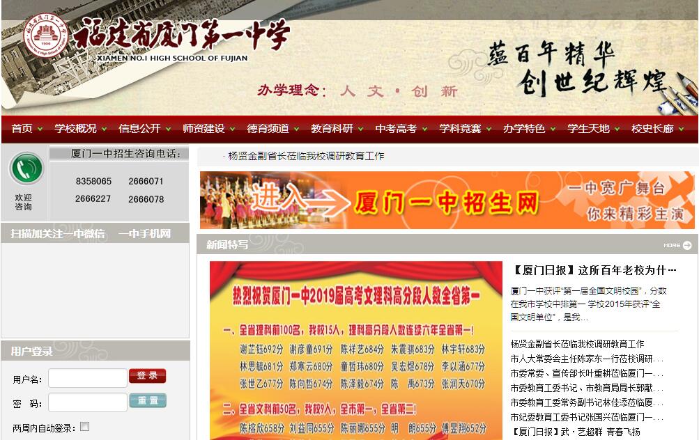 廈門一中系福建省首批辦好的重點中學,她創(chuàng)辦于1906年。其前身是清朝康熙二十四年(1685年)創(chuàng)立的玉屏書院,是廈門島內最早的書院,為廈門的文脈之源。廈門一中南依著名的“萬石植物園”國家級風景區(qū),與廈門大學隔山而伴,樓倚巍峨,門開畫境,環(huán)境優(yōu)美。廈門一中是一所享譽中外的著名中學。校區(qū)占地約12萬平方米。環(huán)境優(yōu)美、布局合理、設備先進?,F(xiàn)有110個教學班,在校學生5000余人?,F(xiàn)有教職工404名,其中擁有正高級職稱5人,具有高級教師任職資格的118人。省市杰出人民教師5人,市拔尖人才4人,全國勞模1人,全國模范教師2人,省名校長1人、省中小學優(yōu)秀校長1人,首屆廈門市中小學優(yōu)秀校長1人,市杰出教師6人,省首屆名師4人,省市學科帶頭人38人。學校辦學歷史悠久、英才輩出,涌現(xiàn)了一批政治家、科學家、教育家、體育名星等。原全國人大常委會副委員長葉飛,原全國政協(xié)副主席、國務院副總理、中科院院長方毅,原全國人大常委會副委員長、中科院院長盧嘉錫,原全國人大常委會副委員長、全國婦聯(lián)主席、教育部長陳至立,工程院院士李幼平,前世界乒乓球冠軍郭躍華、著名詩人舒婷、著名鋼琴音樂家楊鳴以及被譽為“浴火鳳凰”的烈士黃美妙等就是其中的杰出代表。近年來,學校被中央文明委、教育部等授予“第四屆全國文明單位”、“首屆全國文明校園”、“全國教育系統(tǒng)先進集體”、“全國教科文衛(wèi)體系統(tǒng)模范職工之家”、“全國科技體育傳統(tǒng)?!薄ⅰ叭珖韼健拿鲘彙?、“全國五四紅旗團委”等榮譽稱號。廈門一中的辦學目標是“全省頂尖,全國一流,面向國際,面向未來的現(xiàn)代學校”;辦學理念是“人文、創(chuàng)新,為發(fā)展而教育”;學生培養(yǎng)目標是“國家認同+國際理解+人文底蘊+科學精神”,廈門一中堅持文化治校:秉承“勤、毅、誠、敏”的校訓,致力于建設“民主、責任、情感、榮譽”的精神文化,“人本、規(guī)范、科學、激勵”的制度文化,“共享、理性、包容、進取”的行為文化,“人文、典雅、傳承、現(xiàn)代”的學校物質文化。學校師資力量雄厚,教學質量穩(wěn)居省市前茅。學校連續(xù)多年高考高分段人數(shù)穩(wěn)居全省第一。本一上線率達到或超過95%。2017年高考全省理科前100名,我校16人,全省最多!陳汜玄同學獲省理科狀元,林暄淇同學獲省理科榜眼,全省文科前50名,我校9人,全省最多!被清華北大錄取25人,被港大錄取7人,均為全省第一。此外被中科大、復旦、上交大等名校錄取的人數(shù)均為全省最多。2017屆中美班100%的學生被世界排名前100名的大學錄取。中考總分成績居廈門同類校前列,全市前100名有13人,高分段人數(shù)位居全市前列!學科奧賽和科技創(chuàng)新大賽處于全省領先水平。2017年全省五大學科競賽,我校榮獲48個一等獎,為全省最多。以我校曾國壽老師名字命名的21398行星閃耀在藍天上。近年來,學科奧賽獲國際金牌1枚,國家一等獎13人。學校文體教育碩果累累:彩虹合唱團連續(xù)三屆榮獲全國中學生藝術展演金獎;游泳項目榮獲全國傳統(tǒng)項目聯(lián)賽冠軍10項,省傳統(tǒng)項目12項,健美操項目榮獲全國一等獎7項。學校在省市舞蹈、曲藝、小品和書法、軟陶、漫畫、雕塑等美術比賽以及田徑、棋類、球類等體育比賽中均摘金奪銀,遍地開花。學生發(fā)明創(chuàng)造已獲得12枚國際發(fā)明展獎牌、17枚國家級獎牌。學校在開創(chuàng)特色學校文化的多樣化人才培養(yǎng)創(chuàng)新之路上作出了有益的探索和實踐,形成了五大辦學特色:一是構建課程文化,促成多樣化發(fā)展;二是以“全方位育人”為途徑,打造鮮明“大德育”特色;三是綜合實踐基地,創(chuàng)新人才培養(yǎng)的多種途徑;四是弘揚主流價值,豐富人才培養(yǎng)的文化載體;五是培養(yǎng)領軍人物,尋找公民教育和精英教育契合點。近年來,學校建設了103門(已開發(fā)了145門)特色校本課程;打造了生物與環(huán)境科學教育基地、科技發(fā)明示范基地、機器人工作室、航?;氐葘W校創(chuàng)新工作四大亮點。廈門一中積極履行社會責任,主動支援薄弱學校改革發(fā)展,先后創(chuàng)辦了集美分校等6所學校,擴建了擁有初高中部90個班級規(guī)模的海滄校區(qū),幫扶寧德民族中學,開展援疆援藏,推進了基礎教育均衡發(fā)展?!爸茈m舊邦,其命維新”,這所辦學歷史達110的老校,正朝著建設優(yōu)質化、特色化、國際化、現(xiàn)代化的品牌學校堅實前行。
