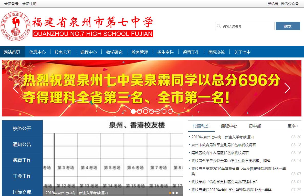福建省泉州市第七中學(xué)創(chuàng)建于1931年,原名私立晦鳴中學(xué),1956年改為公辦泉州市第七中學(xué)。現(xiàn)為省一級(jí)達(dá)標(biāo)中學(xué)、省示范性普通高中、省文明學(xué)校。學(xué)校堅(jiān)持“培養(yǎng)身心健康的現(xiàn)代中國(guó)人,鍛造各行各業(yè)領(lǐng)軍人物”的辦學(xué)理念,發(fā)揚(yáng)“團(tuán)結(jié)協(xié)作、敬業(yè)奉獻(xiàn)、拼搏進(jìn)取、開拓創(chuàng)新”的七中精神,積極踐行“愛(ài)國(guó)、感恩、勤奮、卓越”的校訓(xùn),大力推進(jìn)素質(zhì)教育,深化課程改革,敢于超越,不斷發(fā)展,成為福建省名校和全國(guó)知名中學(xué)。獲得“中國(guó)百?gòu)?qiáng)中學(xué)”、“全國(guó)特色學(xué)?!薄ⅰ叭珖?guó)模范職工之家”、“國(guó)家級(jí)體育項(xiàng)目傳統(tǒng)校”、“全國(guó)青少年校園足球特色學(xué)?!?、“漢語(yǔ)國(guó)際推廣中小學(xué)基地?!?、“全國(guó)科技創(chuàng)新教育十佳學(xué)校暨創(chuàng)新之星學(xué)?!?、“省素質(zhì)教育工作先進(jìn)?!薄ⅰ笆】萍冀逃攸c(diǎn)示范?!?、“省首批課程改革基地?!眹?guó)家級(jí)榮譽(yù)23項(xiàng)、省級(jí)榮譽(yù)86項(xiàng)。學(xué)校擁有一支具有高度敬業(yè)精神與團(tuán)隊(duì)精神的優(yōu)秀師資隊(duì)伍,以“培養(yǎng)身心健康的現(xiàn)代中國(guó)人,鍛造各行各業(yè)領(lǐng)軍人物”為育人目標(biāo),通過(guò)豐富的課程體系、文體藝術(shù)、社團(tuán)和社會(huì)實(shí)踐活動(dòng),全面提升學(xué)生能力素質(zhì)和個(gè)性特長(zhǎng)發(fā)展,為其將來(lái)人生創(chuàng)業(yè)發(fā)展奠定能力和意志品質(zhì)基礎(chǔ)。2005年以來(lái),泉州七中取得了輝煌的教育教學(xué)業(yè)績(jī):高考成績(jī)?nèi)☆I(lǐng)先。奪得2006年高考省文科狀元,2010年高考省理科狀元,2009年高考市文、理科狀元;2010年、2011年高考市區(qū)文科狀元,考取清華、北大95人,平均每年8人。學(xué)科奧賽碩果累累。獲省級(jí)一等獎(jiǎng)279人(其中2008年、2010年、2012年和2016年獲獎(jiǎng)人數(shù)居全省第一,2007年以來(lái)共獲全國(guó)一等獎(jiǎng)18人、二等獎(jiǎng)22人、三等獎(jiǎng)18人)。近三年,入選國(guó)家集訓(xùn)隊(duì)人數(shù)全省第一??萍紕?chuàng)新與機(jī)器人競(jìng)賽成績(jī)斐然。獲國(guó)際金牌2枚,銅牌1枚,全國(guó)金牌17枚、銀牌8枚、銅牌7枚,省級(jí)金牌39枚,獎(jiǎng)牌總數(shù)累計(jì)達(dá)296枚,居泉州市第一,全省全列。文體藝術(shù)特色鮮明,社團(tuán)活動(dòng)豐富多彩,為重點(diǎn)高校輸送了大量的文體藝術(shù)人才。2010年、2012年奪得高考省美術(shù)綜合分狀元;校男籃奪得省中小學(xué)生籃球聯(lián)賽冠軍10次、市冠軍16次,獲第四屆全國(guó)籃球重點(diǎn)單位籃球賽榮獲第三名,第七屆CSBA全國(guó)中學(xué)生高中男子(乙組)籃球錦標(biāo)賽第五名,第八屆CSBA全國(guó)中學(xué)生高中男子(甲組)籃球錦標(biāo)賽第八名;校田徑隊(duì)17次獲得市區(qū)中學(xué)生田徑運(yùn)動(dòng)會(huì)團(tuán)體冠軍;2015年成為全國(guó)青少年校園足球特色學(xué)校。國(guó)際交流深入發(fā)展。泉州七中2006年成為國(guó)家漢辦的“漢語(yǔ)國(guó)際推廣中小學(xué)基地?!?,2010年在市外辦的領(lǐng)導(dǎo)和支持下與德國(guó)奧伯豪森市定期開展國(guó)際青少年交流活動(dòng);2013年獲批準(zhǔn)招收中美合作高中課程實(shí)驗(yàn)班;同年,與德國(guó)歌德課堂學(xué)院合作開展“歌德課堂”項(xiàng)目,為廣大師生提供第二外語(yǔ)學(xué)習(xí)機(jī)會(huì);2014年在市外辦領(lǐng)導(dǎo)和支持下參與丹麥國(guó)際青少年交流活動(dòng),并磋商建立定期交流機(jī)制;2015年我校獲批招收外國(guó)留學(xué)生資格,開創(chuàng)泉州市中學(xué)先例,已接收兩批來(lái)自德國(guó)、丹麥的學(xué)生在我校學(xué)習(xí)漢語(yǔ)。學(xué)校的宏偉規(guī)劃是:創(chuàng)建海西教育品牌,進(jìn)一步實(shí)現(xiàn)“全省著名、全國(guó)聞名、世界知名”的目標(biāo),為國(guó)家培養(yǎng)更多的棟梁之才!