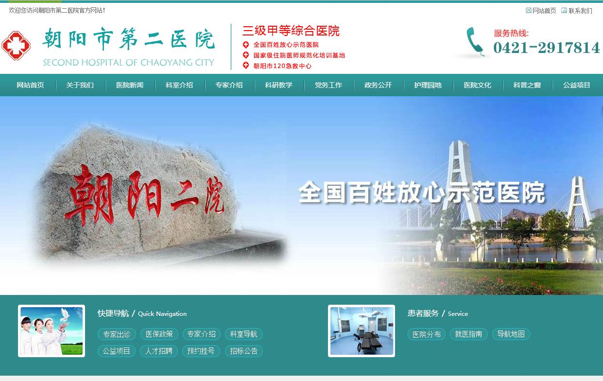 朝陽市第二醫(yī)院始建于1983年,院址前身為中國醫(yī)科大學附屬第二醫(yī)院。是集醫(yī)療、科研、教學、預防、康復于一體的三級甲等綜合醫(yī)院,為國家級住院醫(yī)師規(guī)范化培訓基地,臨床教學醫(yī)院。醫(yī)院占地面積4.4萬平方米,建筑面積12萬平方米,開設病床1145張,設有41個病區(qū),臨床、醫(yī)技科室65個,行政和職能科室28個。有2個省級重點???,20個市級重點專科。為省首批危重孕產(chǎn)婦和新生兒搶救中心、省首批兒童聽力障礙診斷單位、省卒中中心。為朝陽市急救中心、朝陽市糖尿病防治中心、朝陽市腫瘤防治中心、朝陽市小兒腦癱康復中心、朝陽市腎病防治中心。為朝陽市腫瘤放療質(zhì)量控制中心、朝陽市口腔醫(yī)療質(zhì)量控制中心、朝陽市心臟超聲專業(yè)質(zhì)量控制中心、朝陽市臨床病理質(zhì)量控制中心、朝陽市臨床檢驗管理與質(zhì)量控制中心、朝陽市醫(yī)用氧倉臨床治療控制中心、朝陽市婦科疾病質(zhì)量控制中心、朝陽市消化內(nèi)鏡質(zhì)量控制中心、朝陽市產(chǎn)科專業(yè)質(zhì)量控制中心、朝陽市臨床麻醉質(zhì)量控制中心、朝陽市兒科專業(yè)質(zhì)量控制中心、朝陽市內(nèi)分泌專業(yè)質(zhì)量控制中心、朝陽市風濕免疫疾病質(zhì)量控制中心。為北京腫瘤醫(yī)院遠程醫(yī)療協(xié)作單位。醫(yī)院現(xiàn)有職工1686人,其中衛(wèi)生專業(yè)技術人員1408人,高級職稱270人,中級職稱307人。碩士研究生導師7人;有11人擔任國家專業(yè)委員會委員及青委學組委,193人擔任省以上各學術委員會副主任委員、常委、委員。醫(yī)院擁有萬元以上在運行設備1057臺(件),總價值2.2億元。包括聯(lián)影3.0T磁共振、西門子1.5T磁共振、西門子128層CT和西門子64層大孔鏡CT,瓦里安直線加速器等設備。近年來,獲得國家、省、市科研獎勵220余項,其中中華醫(yī)學科技二等獎1項;省級發(fā)明創(chuàng)造二等獎2項、省科技進步三等獎2項、省科學技術研究成果22項;市級科技進步獎、自然學術成果獎一、二、三等獎192項。醫(yī)院先后獲得全國百姓放心示范醫(yī)院百佳醫(yī)院、全國醫(yī)院文化建設先進單位、醫(yī)院文化建設先進集體、國家級節(jié)約型公共機構示范單位;省文明醫(yī)院、省十佳愛嬰醫(yī)院、省抗癌工作突出貢獻先進集體、省醫(yī)療扶貧突出貢獻單位、省精神文明創(chuàng)建工作先進單位,省巾幗建功先進集體;朝陽市文明單位、朝陽市誠信創(chuàng)建活動AAA級誠信單位、朝陽市衛(wèi)生工作先進單位、朝陽市脫貧攻堅先進集體等多種榮譽稱號。
