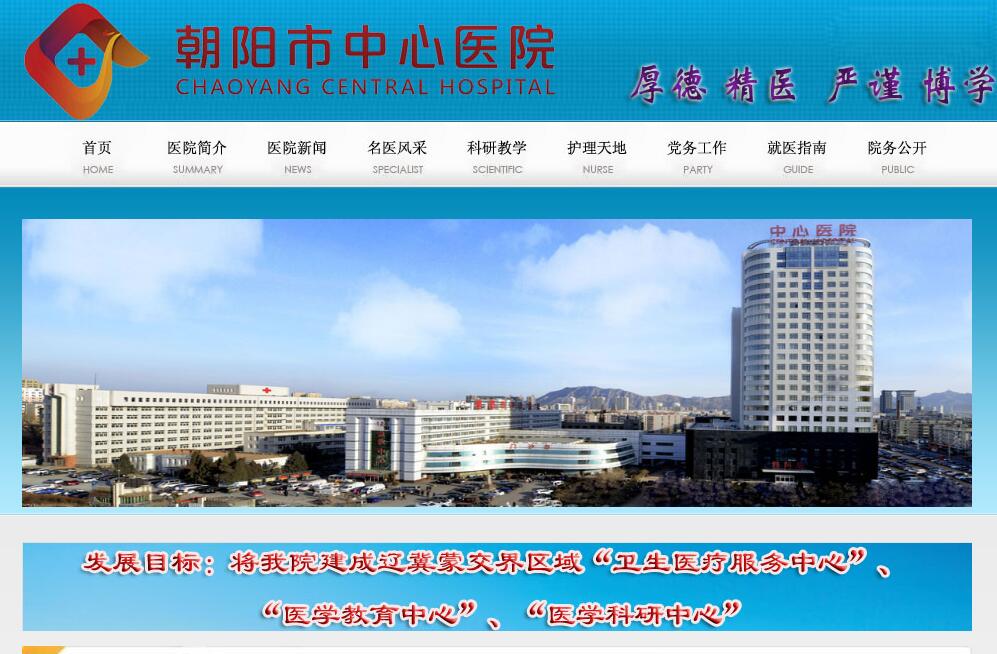 醫(yī)院的前身是1937年成立的土默特右旗醫(yī)院,床位30張;1946年更名為朝陽衛(wèi)生院;解放后更名為朝陽縣衛(wèi)生院;1959年更名為朝陽市醫(yī)院,床位200張;1964年更名為朝陽專區(qū)人民醫(yī)院;1970年更名為朝陽市人民醫(yī)院,床位400張;1974年更名為朝陽地區(qū)人民醫(yī)院,1984年更名為朝陽市第一人民醫(yī)院,床位500張;1993年更名為朝陽市中心醫(yī)院,床位703張;1997年晉升為三級甲等醫(yī)院;2013年床位增至1408張。醫(yī)院連續(xù)三年位列遼寧省三甲醫(yī)院運(yùn)行與管理排行榜前十名(2014年第10名 2013年第6名 2012年第10名)。2017年,中心醫(yī)院在全省28家市屬三甲醫(yī)院綜合績效考核排名第二位。2018年,中心醫(yī)院在全省29家市屬三甲醫(yī)院綜合績效考核排名第三位。醫(yī)院是國家衛(wèi)健委腦卒中篩查與防治基地和高級卒中中心、國家藥品不良反應(yīng)監(jiān)測哨點(diǎn)醫(yī)院、國家級醫(yī)療器械不良事件監(jiān)測工作哨點(diǎn)單位、國家愛嬰醫(yī)院、國家醫(yī)師資格考試實(shí)踐技能(臨床類別)考試基地、國家衛(wèi)健委2015-2017年“進(jìn)一步改善醫(yī)療服務(wù)行動計(jì)劃”改善住院流程示范醫(yī)院、2016改善醫(yī)療服務(wù)示范醫(yī)院、中國醫(yī)師協(xié)會人文愛心醫(yī)院、美國微笑列車定點(diǎn)醫(yī)院、省乳腺癌篩查定點(diǎn)醫(yī)院、朝陽市紅十字會醫(yī)院、朝陽市急救中心、朝陽市牙病防治中心、朝陽市性病防治中心、朝陽市產(chǎn)前篩查診斷中心。同時也是國家級和省級住院醫(yī)師規(guī)范化培訓(xùn)基地、中國醫(yī)科大學(xué)教學(xué)醫(yī)院、中國醫(yī)科大學(xué)省內(nèi)唯一的成人教育教學(xué)基地、錦州醫(yī)科大學(xué)教學(xué)醫(yī)院、承德醫(yī)學(xué)院教學(xué)基地及研究生培養(yǎng)基地、基層衛(wèi)生人員培訓(xùn)基地。醫(yī)院占地面積46000㎡,建筑面積132849㎡。人員編制數(shù)1777,在職職工2127人,其中正高職稱138人、副高職稱274人、中級職稱416人、碩士研究生學(xué)歷354人,博士在讀5人。國家級學(xué)會委員26人、省級副主任委員8人、省級常委41人、省級學(xué)會委員195人。中國醫(yī)科大學(xué)特聘教授8人、承德醫(yī)學(xué)院碩士生導(dǎo)師10人、錦州醫(yī)科大學(xué)碩士生校外指導(dǎo)教師11人、省二級教授2人、享受國務(wù)院政府津貼專家2人。醫(yī)院設(shè)行政科室28個,臨床科室32個,醫(yī)技科室21個。心內(nèi)科、普外科、重癥醫(yī)學(xué)科、急診科、麻醉科、結(jié)直腸肛門外科為省級臨床重點(diǎn)??平ㄔO(shè)項(xiàng)目。骨外科、消化內(nèi)科等19個臨床醫(yī)技科室被評為市一級重點(diǎn)??啤at(yī)療技術(shù)水平是醫(yī)院發(fā)展的關(guān)鍵,醫(yī)院先后開展的冠狀動脈內(nèi)支架置入術(shù)、射頻消融術(shù)、腦血管瘤栓塞術(shù)、心臟外科手術(shù)、頸動脈內(nèi)膜剝脫術(shù)、腹主動脈瘤手術(shù)、夫精人工授精技術(shù)項(xiàng)目、人工耳蝸植入術(shù)、SPECT/CT全身骨掃描、3D腹腔鏡下膽囊切除膽道探查術(shù)、完全腹腔鏡下胃癌根治術(shù)、腹腔鏡肝段切除術(shù)、宮腔鏡聯(lián)合腹腔鏡手術(shù)、急性缺血性腦卒中靜脈溶栓療法、急性期腦動脈閉塞機(jī)械取栓術(shù)、完全腹腔鏡下胃癌根治術(shù)、腹腔鏡肝段切除術(shù)等多項(xiàng)新技術(shù)填補(bǔ)了我市空白。醫(yī)院積極鼓勵醫(yī)務(wù)人員開展科研工作,醫(yī)療科研水平得到提升,年均發(fā)表論文260余篇。參與《中國農(nóng)村高血壓控制項(xiàng)目》、《遼寧地區(qū)心腦血管疾病一級預(yù)防項(xiàng)目》、《中國北方城鄉(xiāng)居民缺血性腦卒中危險因素調(diào)查研究》等國家級和省級科研項(xiàng)目7項(xiàng)。與中國科學(xué)院大連化學(xué)物理研究所聯(lián)合成立臨床質(zhì)譜朝陽中心,開展血液氨基酸、同型半胱氨酸代謝通路四種物質(zhì)、腎上腺素和去甲腎上腺素及維生素A、D、E六項(xiàng)檢測,完成靶向脂質(zhì)、靶向氨基酸、靶向膽汁酸、靶向脂肪酸科研平臺建設(shè)。醫(yī)院的多方努力得到了社會的一致認(rèn)可,取得了良好的社會效益,贏得了百姓的高度信任。先后獲得了國家節(jié)約型公共機(jī)構(gòu)示范單位、國家腦卒中篩查與防治一級預(yù)防先進(jìn)單位、中國醫(yī)療機(jī)構(gòu)公信力示范單位、全國婚育新風(fēng)進(jìn)萬家先進(jìn)單位、青海省醫(yī)療衛(wèi)生對口支援工作先進(jìn)集體、省文明單位、省警民共建先進(jìn)單位、省先進(jìn)基層黨組織、省“五一勞動獎狀”、省“三八紅旗集體”、省健康教育示范基地等榮譽(yù)稱號。