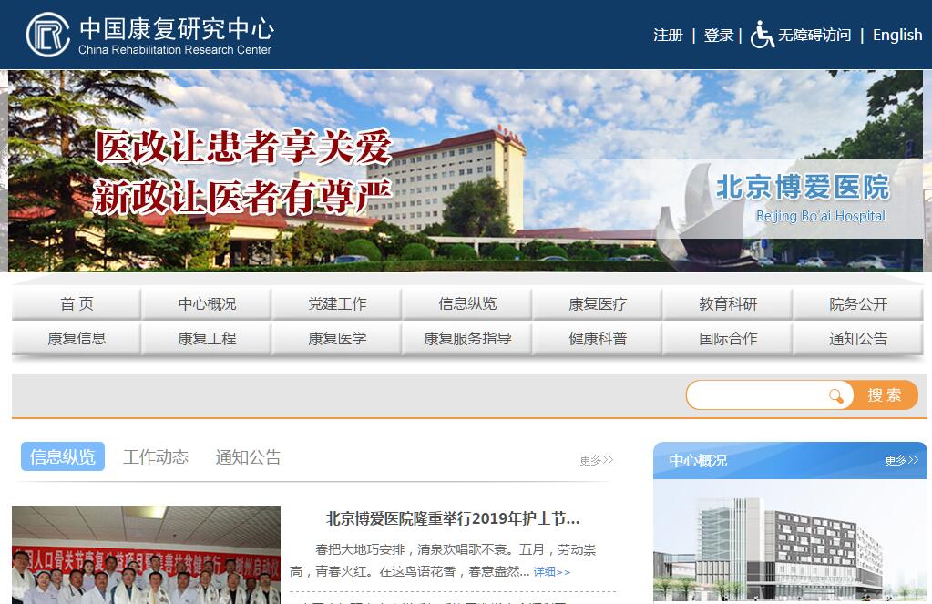中國康復(fù)研究中心成立于1988年 10月,作為直屬于中國殘聯(lián)的全民所有制事業(yè)單位,主要承擔(dān)我國康復(fù)醫(yī)療、康復(fù)研究、人才培養(yǎng)、社區(qū)指導(dǎo)、國際交流等多領(lǐng)域康復(fù)工作。經(jīng)過30年的探索與發(fā)展,中國康復(fù)研究中心已經(jīng)成為擁有職工1700余人,占地220余畝,建筑面積12萬平方米,集康復(fù)醫(yī)療、教育、科研、工程、信息、社會(huì)服務(wù)于一體的大型現(xiàn)代化綜合性康復(fù)機(jī)構(gòu),并設(shè)有中國殘聯(lián)殘疾預(yù)防與控制研究中心、國家孤獨(dú)癥康復(fù)研究中心、國家藥物臨床試驗(yàn)機(jī)構(gòu)、神經(jīng)損傷與康復(fù)北京市重點(diǎn)實(shí)驗(yàn)室等。中國康復(fù)研究中心具有規(guī)模最大、康復(fù)手段齊全、康復(fù)流程完善、康復(fù)模式先進(jìn)、康復(fù)專家眾多、康復(fù)技術(shù)創(chuàng)新能力突出等優(yōu)勢,形成了覆蓋殘疾預(yù)防、急性期救治、早期干預(yù)、中后期康復(fù)、職業(yè)康復(fù)和社區(qū)家庭更生等內(nèi)容的中國特色全面康復(fù)服務(wù)模式。中國康復(fù)研究中心是我國現(xiàn)代康復(fù)醫(yī)學(xué)發(fā)展史上的一座里程碑,也是我國康復(fù)事業(yè)的一顆明珠。中國康復(fù)研究中心北京博愛醫(yī)院作為目前我國一家以康復(fù)為特色的三級(jí)甲等綜合醫(yī)院,是醫(yī)療保險(xiǎn)和工傷保險(xiǎn)定點(diǎn)醫(yī)院,設(shè)有門急診、康復(fù)臨床、綜合臨床、康復(fù)治療、醫(yī)技等52個(gè)科室,開放床位1100張;擁有神經(jīng)康復(fù)、脊髓損傷康復(fù)、兒童康復(fù)、骨與骨關(guān)節(jié)康復(fù)、神經(jīng)泌尿康復(fù)和傳統(tǒng)醫(yī)學(xué)康復(fù)等多個(gè)優(yōu)勢專業(yè)學(xué)科。綜合康復(fù)治療手段包括運(yùn)動(dòng)療法、作業(yè)療法、語言治療、文體治療、水療、物理因子治療、心理治療、音樂治療、社會(huì)康復(fù)、假肢矯形、中醫(yī)治療、教育康復(fù)和職業(yè)訓(xùn)練等。形成了以功能評(píng)估—康復(fù)治療—效果評(píng)價(jià)為基礎(chǔ)的康復(fù)流程,探索出了一套急性期救治與恢復(fù)期康復(fù)相結(jié)合、中西醫(yī)結(jié)合、醫(yī)工結(jié)合的康復(fù)模式。多年來,中國康復(fù)研究中心北京博愛醫(yī)院收治的患者來自全國各地和20多個(gè)國家或地區(qū),康復(fù)效果得到國內(nèi)外專家和患者的一致好評(píng)。2013年,中國康復(fù)研究中心北京博愛醫(yī)院成為首屆北京市康復(fù)質(zhì)控中心主任委員單位,為進(jìn)一步規(guī)范全市康復(fù)醫(yī)療質(zhì)量管理、推動(dòng)康復(fù)學(xué)科建設(shè)發(fā)展發(fā)揮了積極作用。中國康復(fù)研究中心北京博愛醫(yī)院還承擔(dān)著周邊近百萬居民的基本醫(yī)療服務(wù)、大型體育賽事醫(yī)療保障、精準(zhǔn)扶貧、對(duì)口支援等多項(xiàng)社會(huì)責(zé)任,尤其在汶川、玉樹、魯?shù)?、雅安等歷次抗震救災(zāi)中,醫(yī)務(wù)人員主動(dòng)深入災(zāi)區(qū),做出了突出貢獻(xiàn)。1991年4月,中國康復(fù)研究中心與首都醫(yī)科大學(xué)聯(lián)合設(shè)立了臨床醫(yī)學(xué)七系,開展康復(fù)醫(yī)學(xué)學(xué)歷教育。2000年正式建立康復(fù)醫(yī)學(xué)院,培養(yǎng)的學(xué)生學(xué)歷涵蓋本科、碩士研究生、博士研究生,并設(shè)立了博士后流動(dòng)站。康復(fù)醫(yī)學(xué)院在全國率先開設(shè)了康復(fù)治療學(xué)專業(yè)的本科學(xué)歷教育,現(xiàn)已成為中國第一家擁有PT、OT、假肢矯形三項(xiàng)國際教育認(rèn)證的康復(fù)教育機(jī)構(gòu),康復(fù)治療課程與國際全面接軌。中心編寫了我國首套康復(fù)治療專業(yè)本科教材,向中國康復(fù)治療師的專門化培養(yǎng)邁出了劃時(shí)代的一步。每年,各地前來進(jìn)修學(xué)習(xí)的醫(yī)務(wù)人員有幾百名,參加各種培訓(xùn)班、國家級(jí)繼續(xù)醫(yī)學(xué)教育項(xiàng)目和國際項(xiàng)目的學(xué)員更是絡(luò)繹不絕。2014年,中國康復(fù)研究中心成為第一批國家住院醫(yī)師規(guī)范化培訓(xùn)基地,也是北京市住院醫(yī)師規(guī)培康復(fù)醫(yī)學(xué)專業(yè)培訓(xùn)基地和唯一的考核基地。2018年,中國殘疾人康復(fù)人才教育基地建成啟用,將成為我國一家現(xiàn)代化、規(guī)范化、應(yīng)用型康復(fù)人才教育示范基地和國際康復(fù)學(xué)術(shù)交流的重要平臺(tái),這將為中國康復(fù)大學(xué)的建設(shè)提供重要支撐。中國康復(fù)研究中心堅(jiān)持基礎(chǔ)研究與康復(fù)臨床緊密結(jié)合的方針,創(chuàng)新與轉(zhuǎn)化并重,始終把科研作為發(fā)展的助力點(diǎn)。1995年,在中心原康復(fù)醫(yī)學(xué)研究所、康復(fù)工程研究所、康復(fù)信息研究所和社會(huì)服務(wù)指導(dǎo)中心的基礎(chǔ)上,整合成立了中國康復(fù)科學(xué)所。康復(fù)醫(yī)學(xué)研究所堅(jiān)持以基礎(chǔ)研究和臨床需求為導(dǎo)向,積極開發(fā)康復(fù)新技術(shù)、新材料,并促進(jìn)其向臨床應(yīng)用轉(zhuǎn)化,高分子材料等多項(xiàng)成果已成功轉(zhuǎn)化??祻?fù)工程研究所堅(jiān)持醫(yī)工結(jié)合的科研模式,與臨床應(yīng)用精準(zhǔn)對(duì)接,開發(fā)