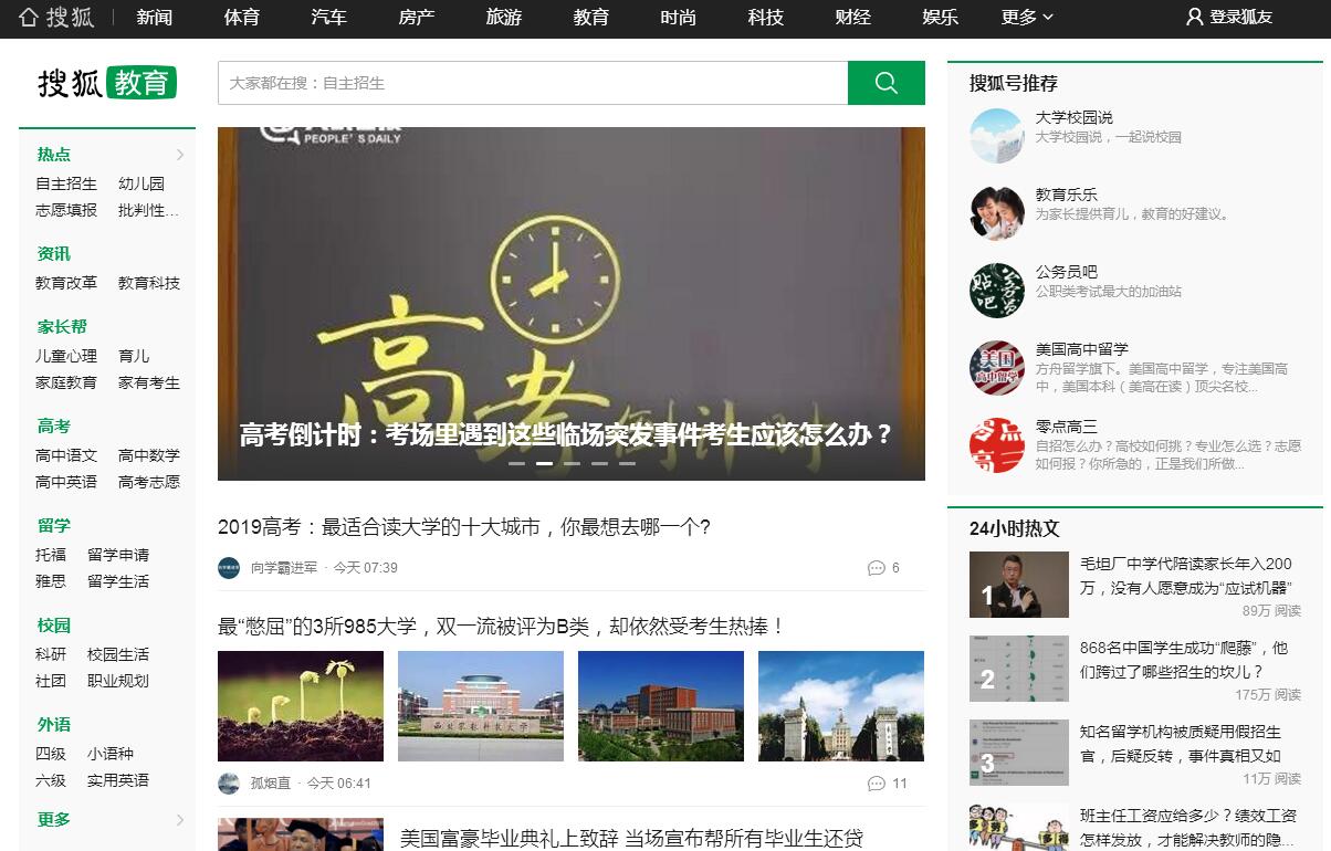 | 網(wǎng)站簡介: 搜狐教育是為讀者提供專業(yè)權(quán)威的教育內(nèi)容的媒體平臺(tái)。我們關(guān)注教育新聞、行業(yè)動(dòng)態(tài);鼓勵(lì)教育思考、創(chuàng)新改革。力爭為不同年齡段的不同受眾提供專業(yè)的教育服務(wù)。 |