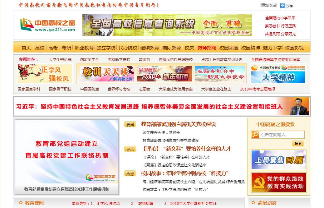 | 網(wǎng)站簡(jiǎn)介: 中國(guó)高校之窗網(wǎng)(www.gx211.com)成立于2004年1月,是中華人民共和國(guó)教育部、中國(guó)教育電視臺(tái)精心打造的以“立足教育,面向?qū)W生,服務(wù)高?!睘樽谥嫉慕逃?lèi)門(mén)戶網(wǎng)站。是提供全面高校資訊,展示大學(xué)風(fēng)采,助推高校發(fā)展和研究的高端平臺(tái)。中國(guó)高校之窗網(wǎng)堅(jiān)持深入貫徹和落實(shí)黨的十八大精神,以高舉中國(guó)特色社會(huì)主義偉大旗幟為中心,創(chuàng)新實(shí)踐網(wǎng)絡(luò)思想政治教育;以“立足教育,面向?qū)W生,服務(wù)高?!睘樽谥?,繁榮發(fā)展積極健康的校園網(wǎng)絡(luò)文化。中國(guó)高校之窗網(wǎng)站充分發(fā)揮網(wǎng)絡(luò)凝聚、服務(wù)、教育、引導(dǎo)、宣傳的作用,促進(jìn)社會(huì)主義先進(jìn)文化在網(wǎng)上和校園間的傳播,促進(jìn)學(xué)生高尚思想道德品德的形成,促進(jìn)學(xué)生社會(huì)道德責(zé)任感的形成,促進(jìn)學(xué)生社會(huì)主義核心價(jià)值觀的形成。中國(guó)高校之窗網(wǎng)站以“弘揚(yáng)先進(jìn)文化、服務(wù)中國(guó)高校、塑造學(xué)生品格、引導(dǎo)學(xué)生成才”為主題。高校傳授學(xué)生專(zhuān)業(yè)知識(shí)固然重要,但培養(yǎng)學(xué)生的精神是高校最最重要的根本任務(wù)。滿足學(xué)生日益增長(zhǎng)的成長(zhǎng)成才需求,使網(wǎng)站成為青年學(xué)生喜愛(ài)的網(wǎng)上精神家園。中國(guó)高校之窗將以報(bào)道中國(guó)高校的卓越教育體系、提升教育質(zhì)量為核心、培養(yǎng)社會(huì)合格人才、完善學(xué)生走向世界的自我成長(zhǎng)平臺(tái)為高校的社會(huì)責(zé)任。中國(guó)高校之窗宣傳學(xué)生的創(chuàng)新精神、創(chuàng)造能力,具有競(jìng)爭(zhēng)合作、互惠共贏的意識(shí),具有和諧共存、共同發(fā)展的意識(shí)。 |