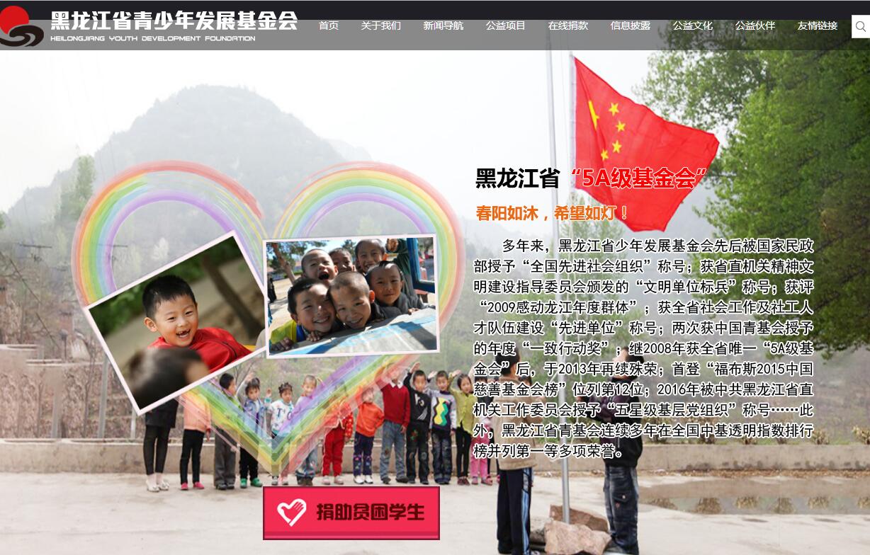 黑龍江省青少年發(fā)展基金會(簡稱“黑龍江省青基會”)成立于1988年,隸屬于共青團黑龍江省委的地方性公募基金會。1992年實施希望工程,始終以“通過資助服務、利益表達和社會倡導,幫助青少年提高能力,改善青少年成長環(huán)境”為使命,以“助學育人,共創(chuàng)希望”為價值使命。持續(xù)開展了圓夢行動、星光行動、義賣童園、先天性心臟病救助、班助一計劃、希望廚房、希望圖書室、電腦教室、夢想課堂、園丁獎和暖冬行動等公益項目。多年來,黑龍江省青基會陸續(xù)被國家民政部授予“全國先進社會組織”稱號;獲省直機關精神文明建設指導委員會頒發(fā)的“文明單位標兵”稱號;獲評“2009感動龍江年度群體”;獲全省社會工作及社工人才隊伍建設“先進單位”稱號;兩次獲中國青基會授予的年度“一致行動獎”;連續(xù)多年在全國中基透明指數(shù)排行榜并列第一;繼2008年獲全省唯一“5A級基金會”后,于2013年再續(xù)殊榮;首登“福布斯2015中國慈善基金會榜”位列第12位……使命:通過資助服務、利益表達和社會倡導,幫助青少年提高能力,改善青少年成長環(huán)境。價值追求:助學育人,共創(chuàng)希望。