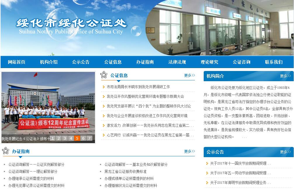 綏化市公證處原為綏化地區(qū)公證處,成立于1993年4月,是綏化市級唯一代表國家依法獨(dú)立行使公證職能的證明機(jī)構(gòu),是黑龍江省司法廳指定的辦理涉臺(tái)公證業(yè)務(wù)的公證處?,F(xiàn)有工作人員12名,其中公證員8名,全部具有涉外公證員資格,是一支整體素質(zhì)高、團(tuán)結(jié)進(jìn)取、開拓創(chuàng)新、無私奉獻(xiàn),在公證法律服務(wù)中取得優(yōu)異成績和良好效益的先進(jìn)集體,是我省規(guī)模較大、實(shí)力較強(qiáng)、具有良好社會(huì)信譽(yù)的大型公證機(jī)構(gòu)。綏化市公證處以“帶一流隊(duì)伍、創(chuàng)一流業(yè)績、樹一流形象”為目標(biāo),本著“誠信為本、公正為民”的服務(wù)宗旨和“團(tuán)結(jié)開拓、務(wù)實(shí)求真”的團(tuán)隊(duì)精神,以全新的公證服務(wù)理念,良好的窗口形象,積極為社會(huì)各界提供真實(shí)、合法、優(yōu)質(zhì)、高效的公證法律服務(wù)。目前已開辦各類公證項(xiàng)目達(dá)80余項(xiàng),涉及社會(huì)諸多領(lǐng)域和方面,涉外公證書發(fā)往英、美、法、日、澳、韓國、俄羅斯等60多個(gè)國家和地區(qū)使用。近年來,綏化市公證處先后被黑龍江省司法廳授予文明服務(wù)窗口單位,被綏化市委政法委授予為經(jīng)濟(jì)建設(shè)提供法律服務(wù)先進(jìn)集體標(biāo)兵和人民滿意政法單位,榮立集體二等功一次,多次受到綏化市委市政府及省司法廳的表彰和獎(jiǎng)勵(lì)。我處以誠信為原則,以真實(shí)、合法、優(yōu)質(zhì)、高效為服務(wù)宗旨,奉獻(xiàn)社會(huì)并接受社會(huì)各界的監(jiān)督,竭誠為您服務(wù)。