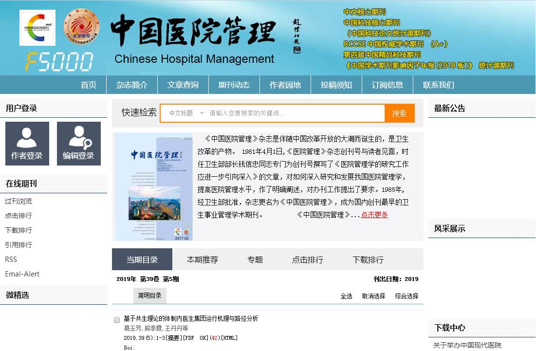 《中國醫(yī)院管理》雜志是伴隨中國改革開放的大潮而誕生的,是衛(wèi)生改革的產(chǎn)物。 1981年4月1日,《醫(yī)院管理》雜志創(chuàng)刊號與讀者見面,時任衛(wèi)生部部長錢信忠同志專門為創(chuàng)刊號撰寫了《醫(yī)院管理學的研究工作應進一步引向深入》的文章,對如何深入研究和發(fā)展我國醫(yī)院管理學,提高醫(yī)院管理水平,作了明確闡述,對辦刊工作提出了要求。1985年,經(jīng)衛(wèi)生部批準,雜志更名為《中國醫(yī)院管理》,成為國內創(chuàng)刊最早的衛(wèi)生事業(yè)管理學術期刊。《中國醫(yī)院管理》雜志追隨醫(yī)藥衛(wèi)生體制改革的腳步一路成長,“見證衛(wèi)生改革歷程”,為這一歷程作出了自己的歷史性貢獻。創(chuàng)辦之初,雜志就將衛(wèi)生改革作為主要報道內容,1983年更是旗幟鮮明地開設“醫(yī)院改革”專欄,并作為每期必設的欄目。突出改革地位、研討改革理論、報道改革實踐、引導改革輿論、推動改革深化成為雜志的鮮明特點,成為我國醫(yī)院改革的重要論壇?!吨袊t(yī)院管理》雜志與我國醫(yī)院管理學科共同成長與發(fā)展,引領醫(yī)院管理創(chuàng)新方向,為醫(yī)院管理學科發(fā)展發(fā)揮了重要的作用。結合我國不同時期醫(yī)院工作實際,雜志全面介紹現(xiàn)代醫(yī)院科學管理理論、技術和方法,報道國內外醫(yī)院管理學的研究進展、科研成果,有力地促進了我國醫(yī)院從經(jīng)驗管理向科學管理的轉變,有力地推動了醫(yī)院管理學科發(fā)展和學術繁榮?!吨袊t(yī)院管理》雜志始終堅持正確的辦刊宗旨和輿論導向,成為宣傳衛(wèi)生與健康工作方針政策的陣地;始終堅持“百花齊放、百家爭鳴”的方針,正確把握輿論導向和學術探討的關系,成為理論實踐大家論壇,被讀者定義為“敢于講真話”的雜志,因而深受歡迎?!吨袊t(yī)院管理》雜志始終堅持貼近實際、貼近讀者、貼近前沿的編輯方針,從內容形式上,堅持科學性與政策性的統(tǒng)一、理論與實踐的統(tǒng)一、普及與提高的統(tǒng)一、微觀管理與宏觀管理的統(tǒng)一?!蔼毺?、精致、貼近、服務”的品牌效應,使《中國醫(yī)院管理》雜志成為一本傳導醫(yī)院管理理論與實踐精髓的雜志,一本講述醫(yī)院管理者心智的高層次、權威性的雜志?!吨袊t(yī)院管理》雜志作為作者和讀者的橋梁,建立起了一批批知名作者隊伍,推出了一個個鮮活的先進醫(yī)院典型,聚集了一大批忠實的讀者,成為醫(yī)院管理精英搖籃?!吨袊t(yī)院管理》雜志勇于探索市場經(jīng)濟條件下期刊可持續(xù)發(fā)展之路。面對期刊經(jīng)營環(huán)境發(fā)生的劇烈變化、同類期刊迅速增加的局面,近年來,雜志主動轉變發(fā)展方式,實施精品戰(zhàn)略,正確處理社會效益和經(jīng)濟效益的關系,樹立品牌意識,打造期刊核心競爭力,雜志編輯質量、通聯(lián)發(fā)行、廣告經(jīng)營各項工作穩(wěn)步發(fā)展,成為衛(wèi)生事業(yè)管理期刊領域的一個品牌。《中國醫(yī)院管理》年來稿量4 000余篇,發(fā)稿率8%左右,基金項目占70%,編校差錯率1/萬以下。期刊影響力指數(shù)、期刊影響因子學科排序均列第一。發(fā)行覆蓋中國大陸各?。▍^(qū)、市),是目前國內同類期刊覆蓋率最高、發(fā)行量最大的期刊。創(chuàng)刊以來,《中國醫(yī)院管理》雜志連續(xù)不斷地獲得了許多殊榮。雜志多次榮獲黑龍江省優(yōu)秀期刊、東北三省優(yōu)秀期刊稱號, 2001年被國家新聞出版總署確定為中國期刊方陣“雙效期刊”,2002年獲得國家期刊印制評比一等獎。雜志現(xiàn)為中文核心期刊,中國科技論文統(tǒng)計源期刊,中國科技核心期刊,RCCSE中國權威學術期刊(A+),第二屆、第三屆、第四屆中國精品科技期刊。