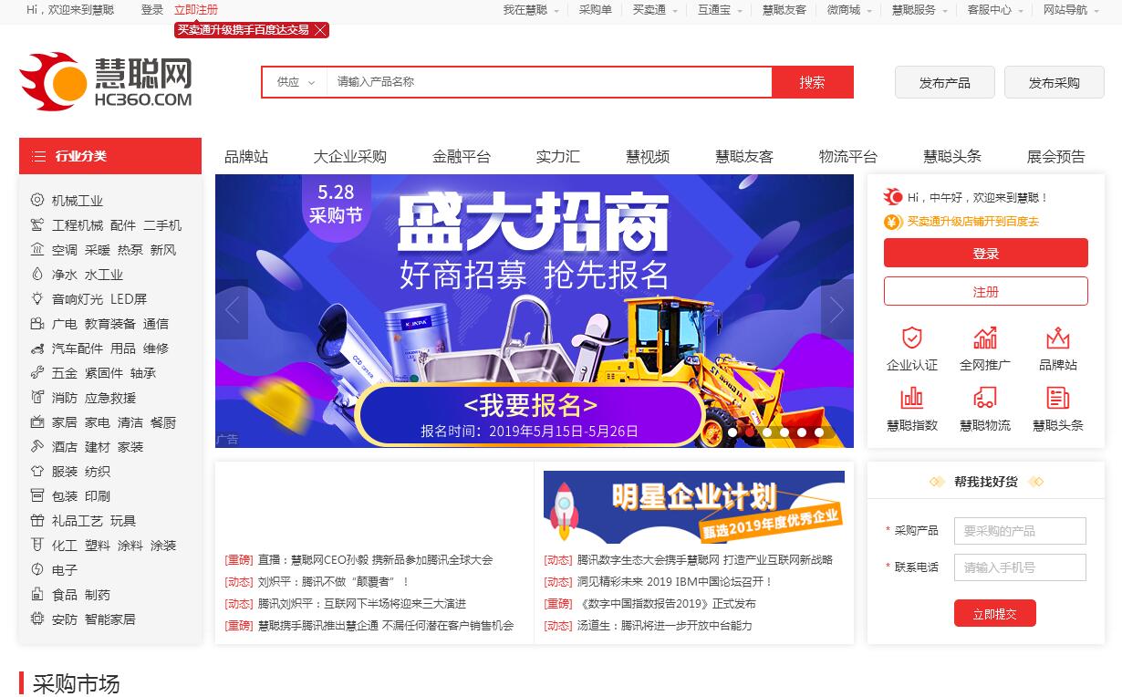 慧聰網(wǎng)(Hc360.Com)B2B電子商務平臺,為您提供B2B行業(yè)資訊、供應、求購信息,是企業(yè)尋求電子商務網(wǎng)絡(luò)貿(mào)易信息的行業(yè)門戶,聰慧的老板上慧聰!慧聰集團有限公司(02280.HK)簡稱慧聰集團,致力于用互聯(lián)網(wǎng)和大數(shù)據(jù)賦能傳統(tǒng)產(chǎn)業(yè),成為中國領(lǐng)先的產(chǎn)業(yè)互聯(lián)網(wǎng)集團?;勐敿瘓F于1992年在北京創(chuàng)立,公司成立后務實穩(wěn)健發(fā)展,依靠穩(wěn)定的業(yè)績和實力于2003年香港聯(lián)合交易所創(chuàng)業(yè)板掛牌上市,2014年10月成功轉(zhuǎn)入主板,2017年8月被恒生指數(shù)有限公司選為多個指數(shù)系列的成份股,同年9月被調(diào)入深港通。慧聰集團作為國內(nèi)早的B2B電商平臺之一,自2018年在新晉董事會主席劉軍的帶領(lǐng)下轉(zhuǎn)型產(chǎn)業(yè)互聯(lián)網(wǎng)發(fā)展戰(zhàn)略。2018年3月,公司正式更名慧聰集團有限公司,原慧聰網(wǎng)作為集團全資子公司之一。通過專注和聚焦,慧聰集團形成科技新零售事業(yè)群、智慧產(chǎn)業(yè)事業(yè)群、平臺與企業(yè)服務事業(yè)群,建立起了完整的產(chǎn)業(yè)互聯(lián)網(wǎng)生態(tài)圈。