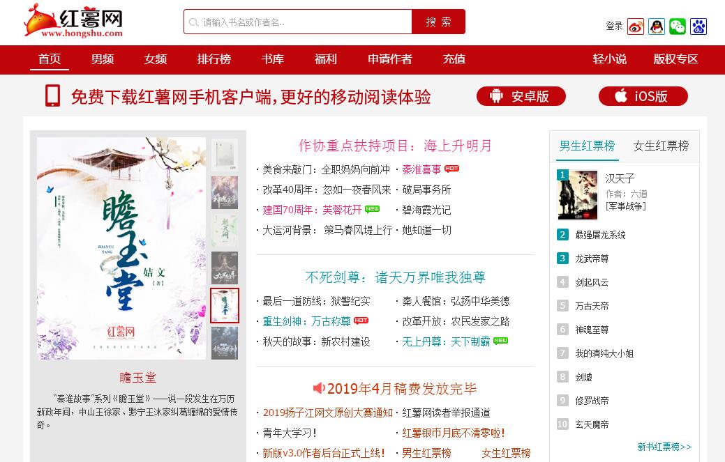 | 網(wǎng)站簡(jiǎn)介: 紅薯網(wǎng)創(chuàng)建于2009年12月,是集創(chuàng)作、閱讀、作品加工、IP運(yùn)營為一體的中文小說閱讀綜合平臺(tái)。目前紅薯網(wǎng)全球alexa排名一萬名左右,中文網(wǎng)站排名一千內(nèi)。PC端、WAP站、APP每日流量超過50萬人次,PV超過1000萬。除了自有網(wǎng)站外,紅薯網(wǎng)還積極拓展第三方渠道,目前與包括掌閱、移動(dòng)、百度等近30家平臺(tái)進(jìn)行合作,月均全渠道銷售額超過800萬。紅薯網(wǎng)目前已經(jīng)成為眾多作者創(chuàng)作的首選,每月有超過2000本作品在紅薯連載。 |