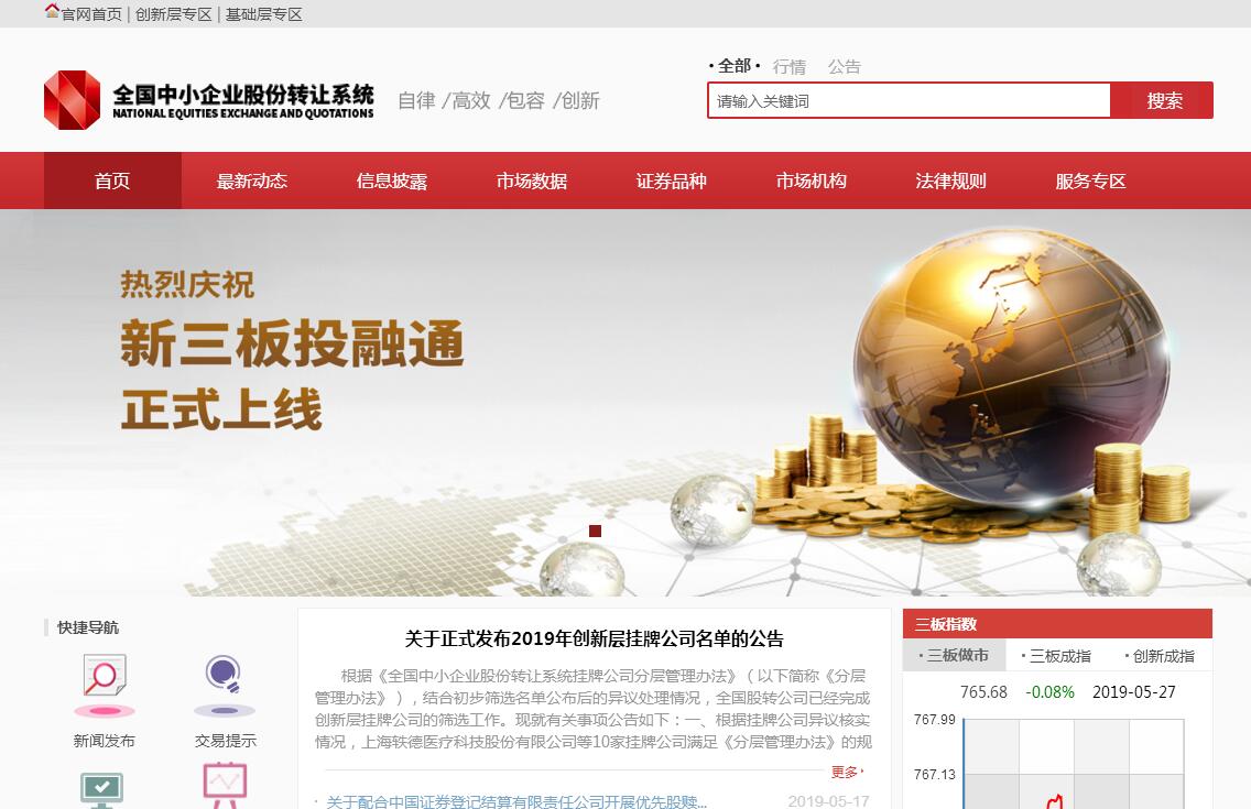 全國中小企業(yè)股份轉(zhuǎn)讓系統(tǒng)(簡稱“全國股轉(zhuǎn)系統(tǒng)”,俗稱“新三板”)是經(jīng)國務院批準,依據(jù)證券法設立的繼上交所、深交所之后第三家全國性證券交易場所,也是我國第一家公司制運營的證券交易場所。全國中小企業(yè)股份轉(zhuǎn)讓系統(tǒng)有限責任公司(簡稱“全國股轉(zhuǎn)公司”)為其運營機構,于2012年9月20日在國家工商總局注冊,2013年1月16日正式揭牌運營,注冊資本30億元。全國股轉(zhuǎn)公司主要職能包括:提供證券交易的技術系統(tǒng)和設施;制定和修改全國股轉(zhuǎn)系統(tǒng)業(yè)務規(guī)則;接受并審查股票掛牌及其他相關業(yè)務申請,安排符合條件的公司股票掛牌;組織、監(jiān)督證券交易及相關活動;對掛牌公司及其他信息披露義務人進行監(jiān)管;對主辦券商等全國股轉(zhuǎn)系統(tǒng)參與人進行監(jiān)管;管理和公布全國股轉(zhuǎn)系統(tǒng)相關信息;中國證監(jiān)會批準的其他職能。公司建立了黨委會、股東會、董事會、監(jiān)事會和經(jīng)營管理層,形成了黨委領導下的“三會一層”的治理結構。2013年12月13日,國務院發(fā)布《關于全國中小企業(yè)股份轉(zhuǎn)讓系統(tǒng)有關問題的決定》(國發(fā)﹝2013﹞49號),進一步鞏固了全國股轉(zhuǎn)系統(tǒng)作為全國性公開證券市場的法制基礎,明確全國股轉(zhuǎn)系統(tǒng)主要為創(chuàng)新型、創(chuàng)業(yè)型、成長型中小微企業(yè)發(fā)展服務,境內(nèi)符合條件的股份公司均可通過主辦券商申請掛牌,公開轉(zhuǎn)讓股份,進行股權融資、債權融資、資產(chǎn)重組等。截至2018年12月31日,全國股轉(zhuǎn)系統(tǒng)掛牌公司10691家,其中創(chuàng)新層掛牌公司914家,基礎層掛牌公司9777家;總市值3.45萬億元。2018年共完成1402次股票發(fā)行,融資604.43億元。全國股轉(zhuǎn)公司將在中國證監(jiān)會領導下,堅持市場化、法治化的方向,落實《國民經(jīng)濟和社會發(fā)展第十三個五年規(guī)劃綱要》關于“深化新三板改革”的戰(zhàn)略部署,以解決融資難融資貴為目標,提升融資效率,降低融資成本,改進市場流動性,完善和發(fā)揮新三板服務創(chuàng)新型民營中小微企業(yè)的功能,全力服務供給側(cè)結構性改革,促進創(chuàng)新創(chuàng)業(yè)、結構優(yōu)化和存量盤活,激發(fā)經(jīng)濟增長新動力。